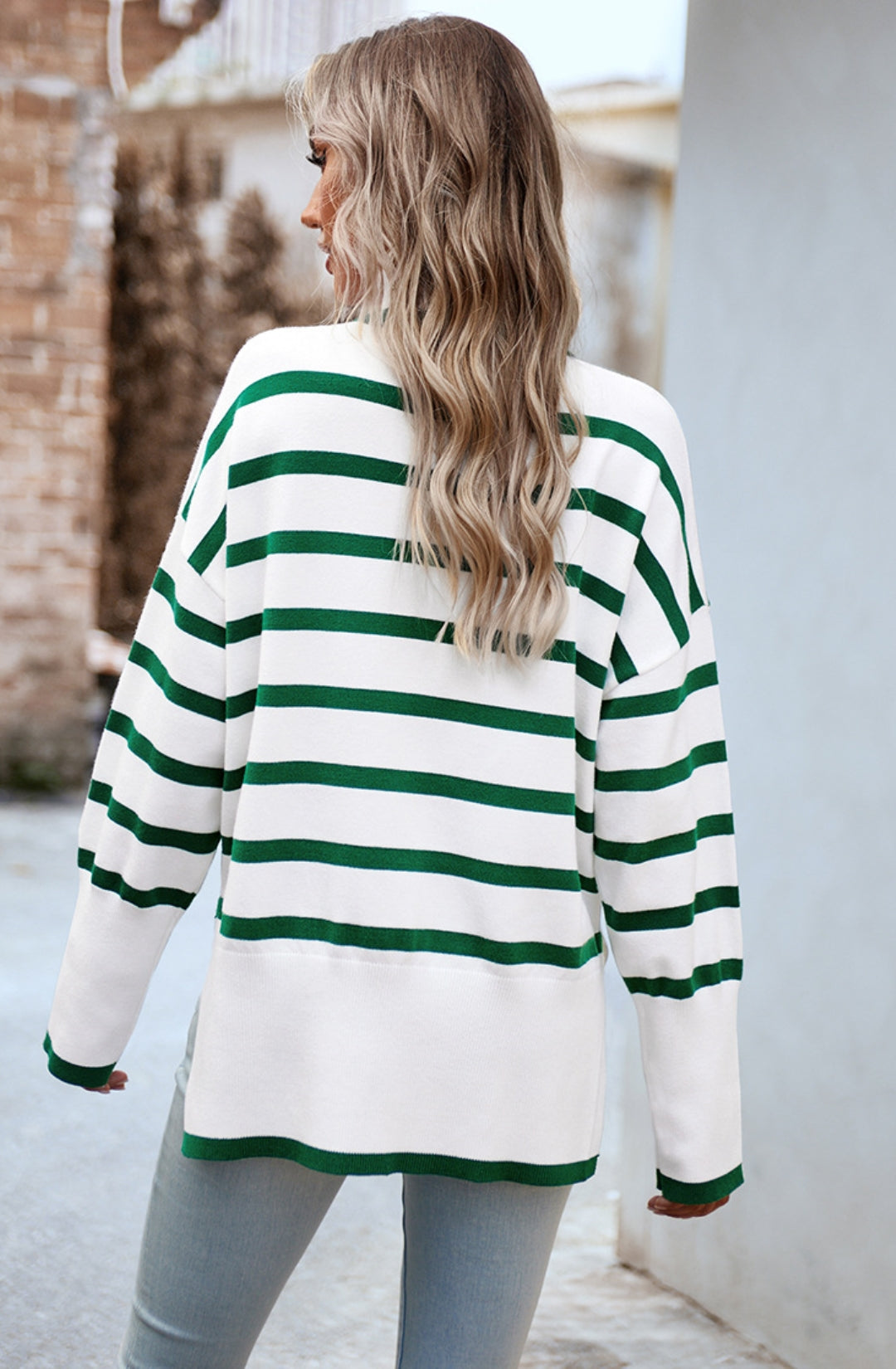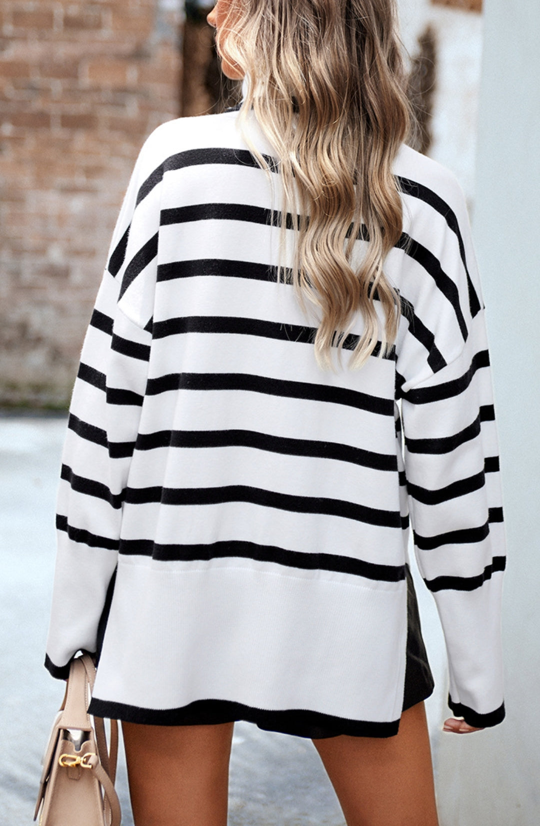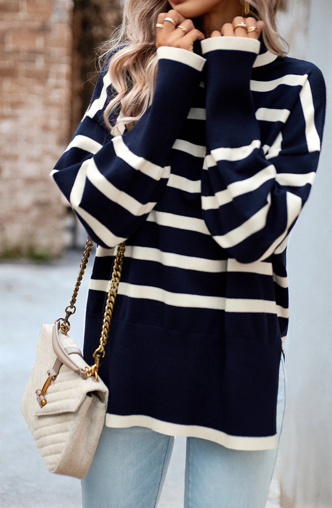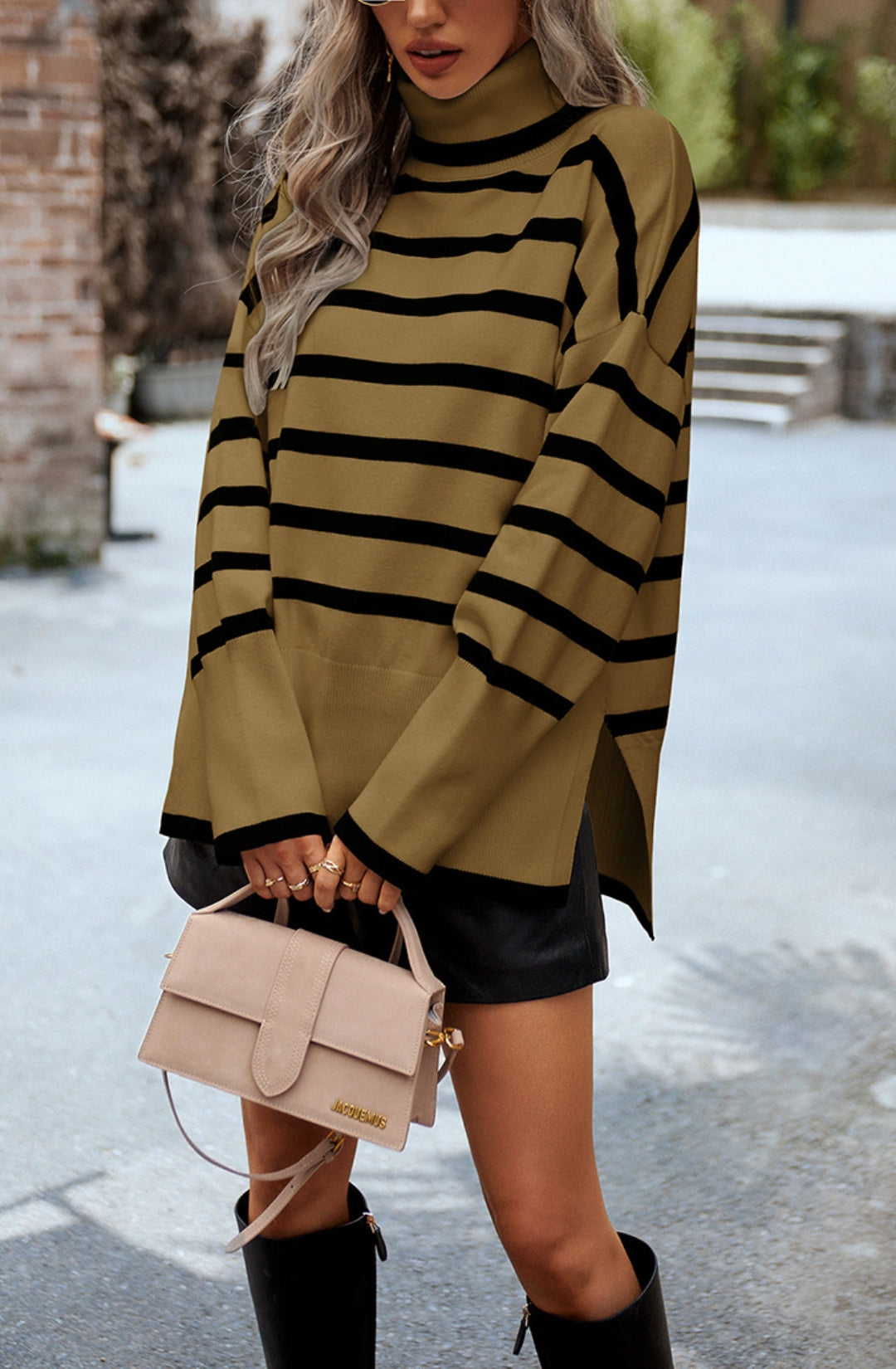 The sweater is detailed with a cool turtleneck. Features a striped pattern, drop shoulder, long sleeves, side slits, and loose fit. Pair it with jeans and sneakers for a cozy look.