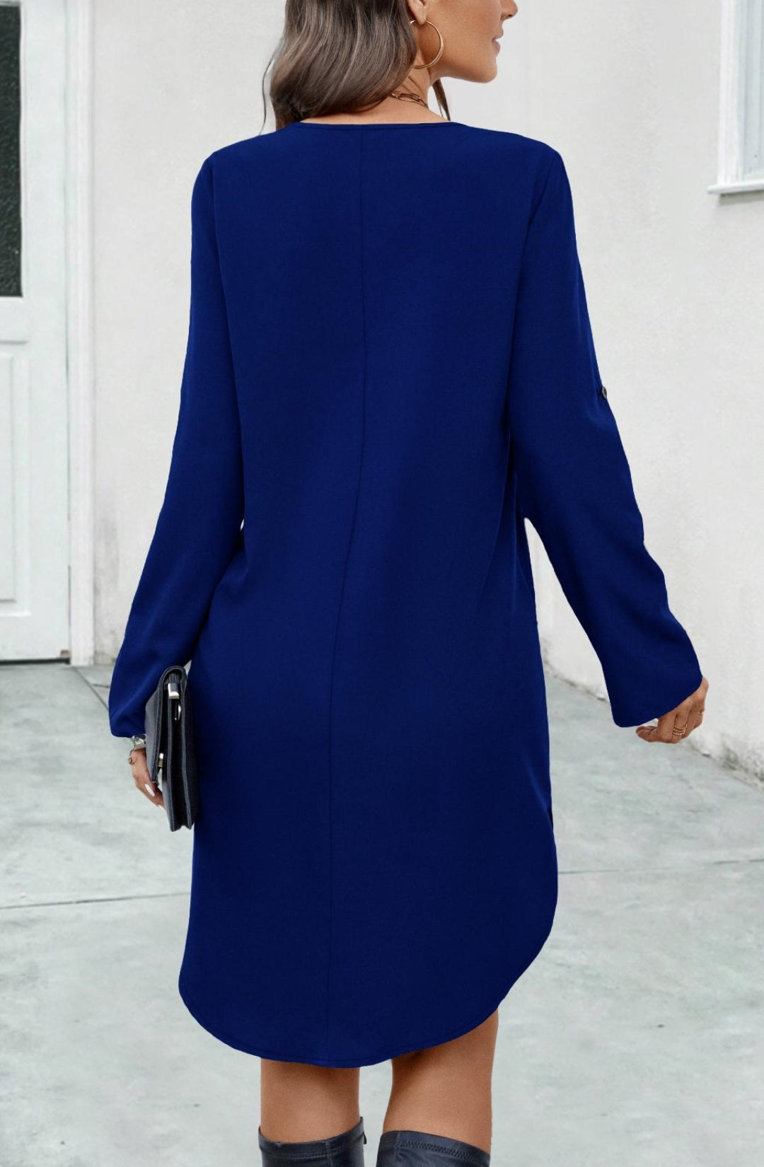 The dress is detailed with a cute tunic style. Features a zip front, v neck line, roll tab sleeves, curved hem, straight cut silhouette, and above knee length. Pair it with a necklace and knee-high boots for a chic look.