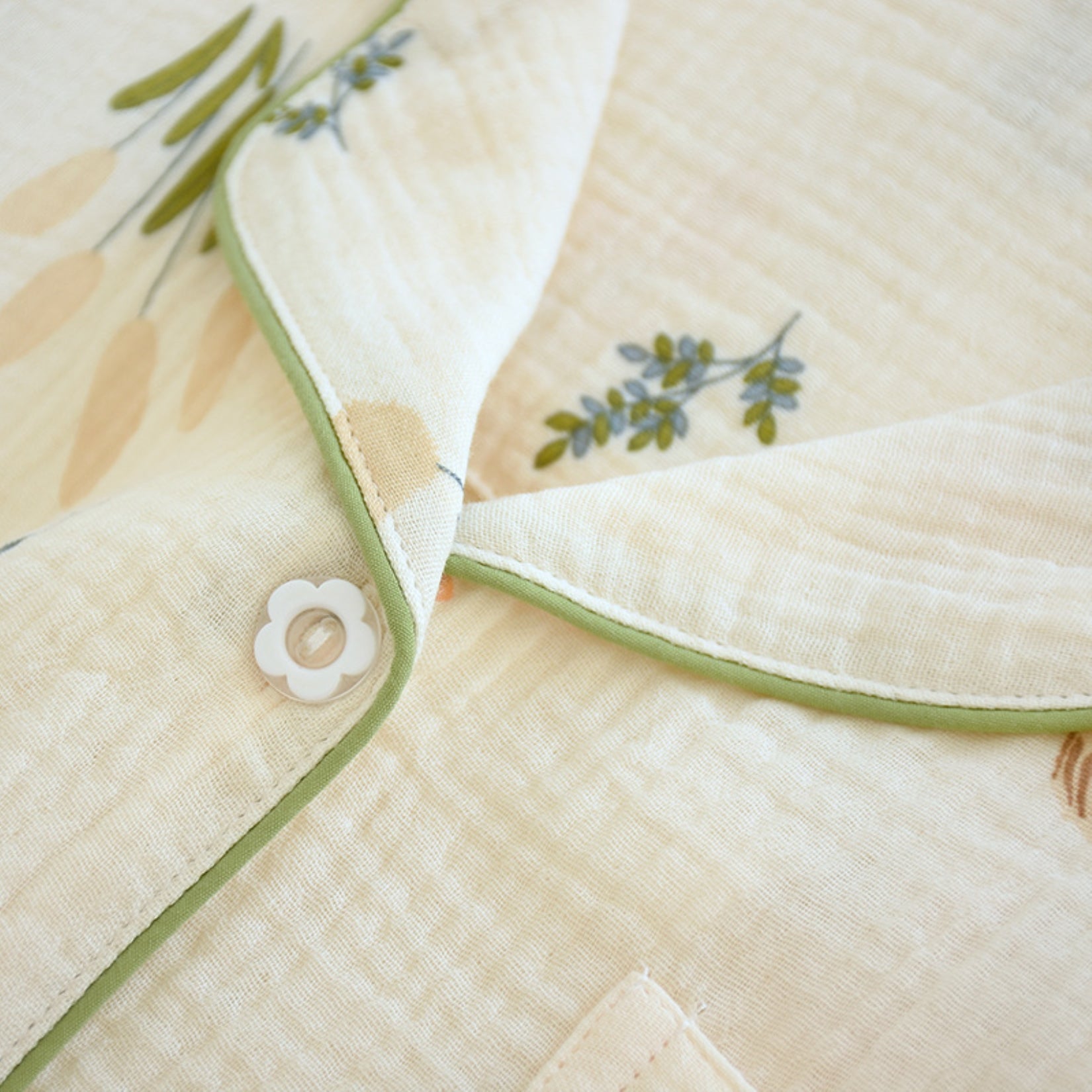 The coordinates are detailed with a lovely floral and squirrel print. Features a collar, button front, long sleeve top and matching pajama pants. Pair it together with slides for a cozy look.