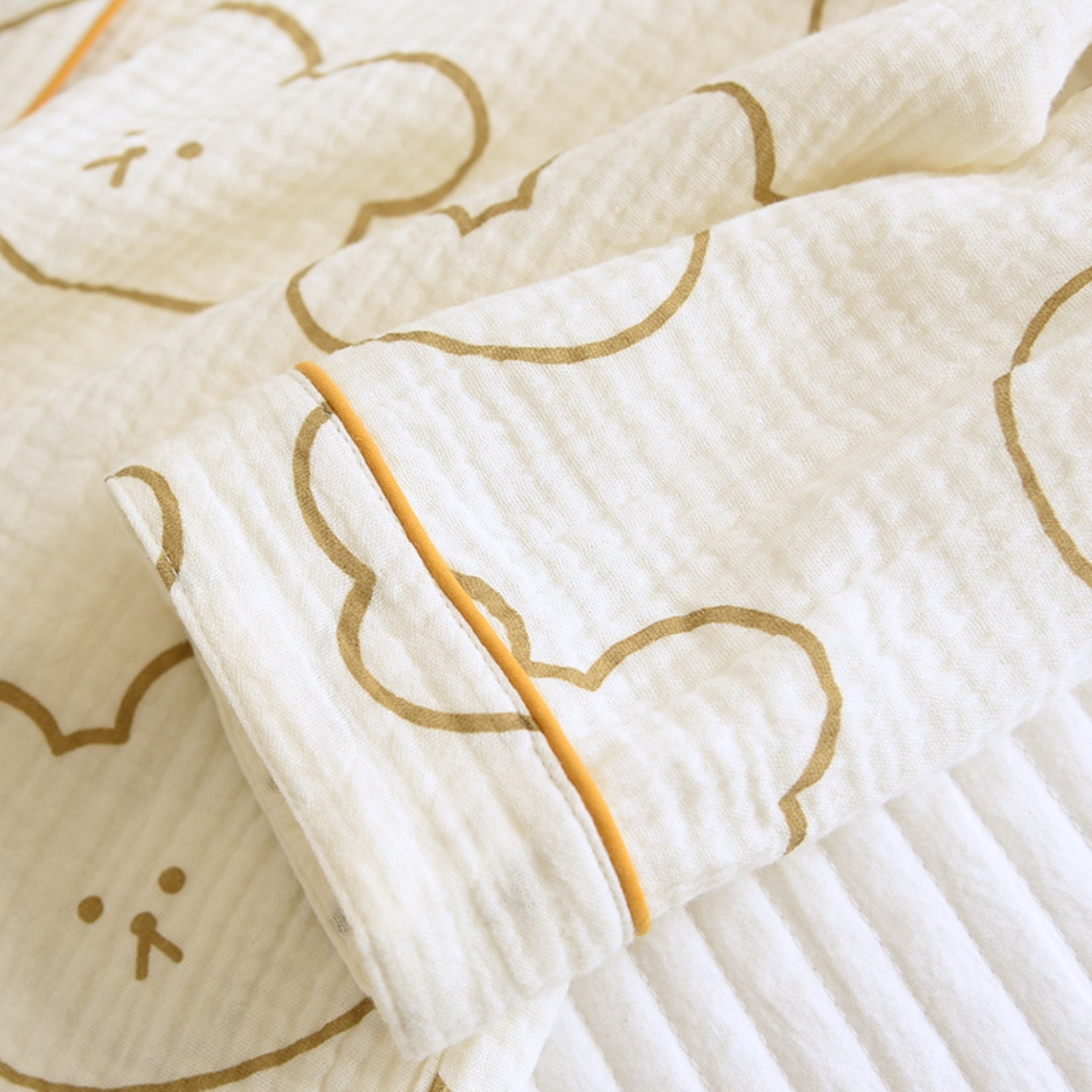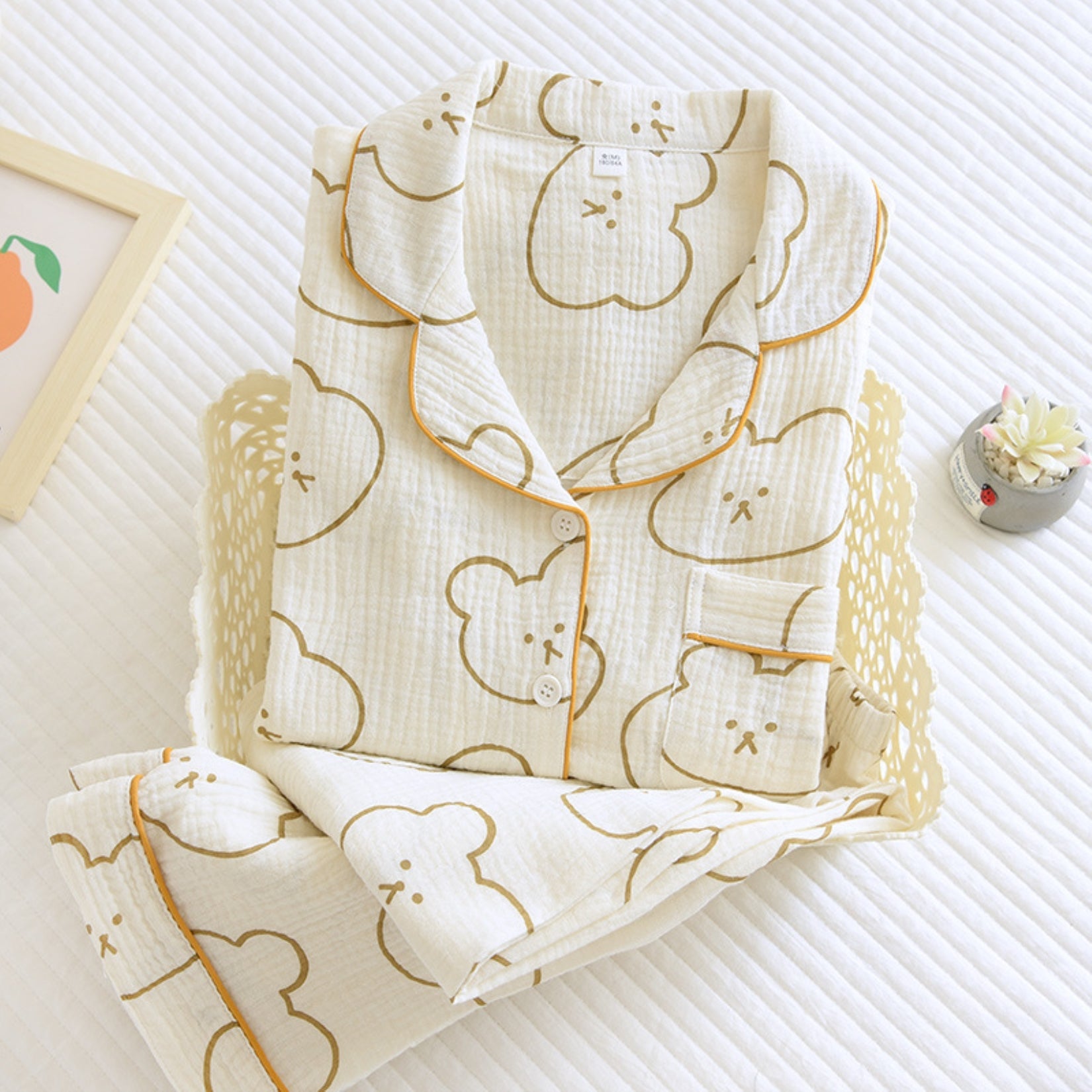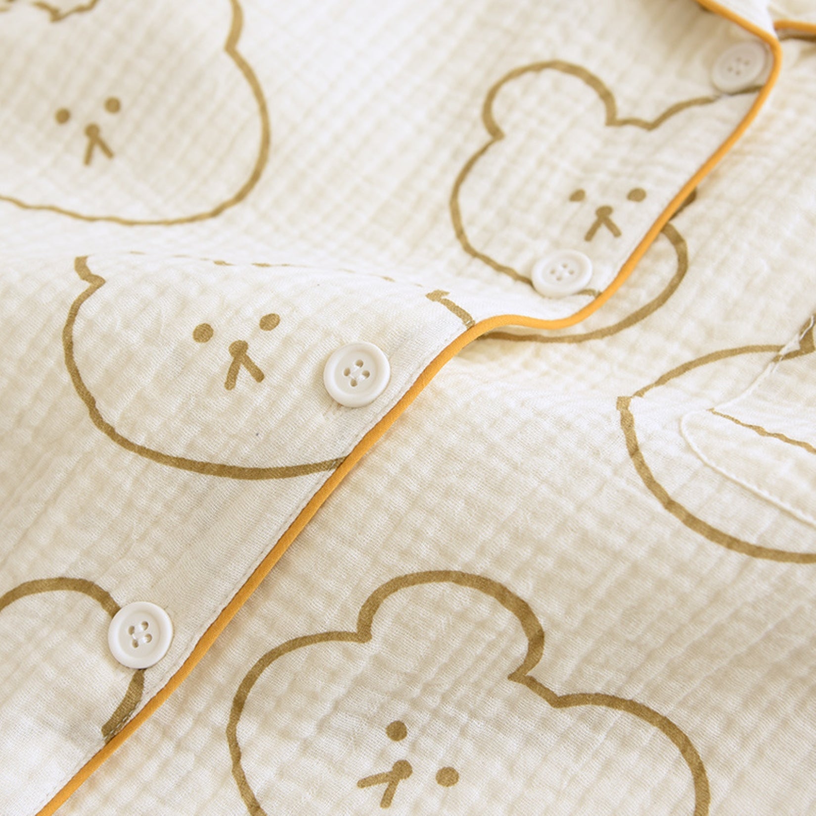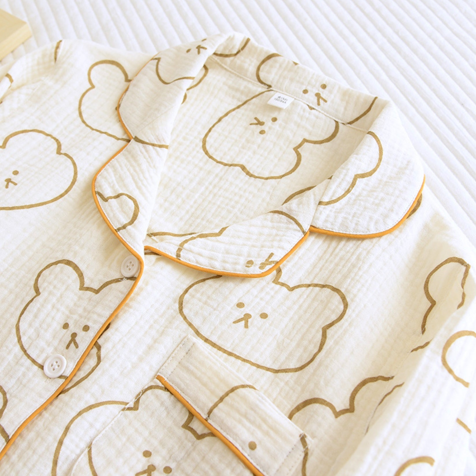 The coordinates are detailed with a cute bear pattern. Features a collar, button front, long sleeve shirt and matching pajama pants. Pair it together with slides for a comfy look.