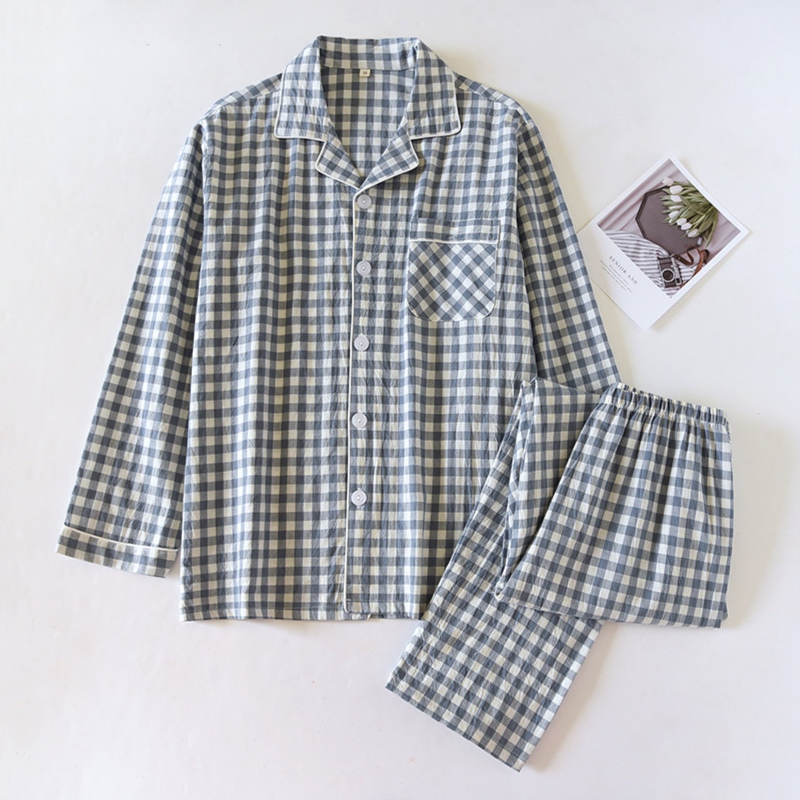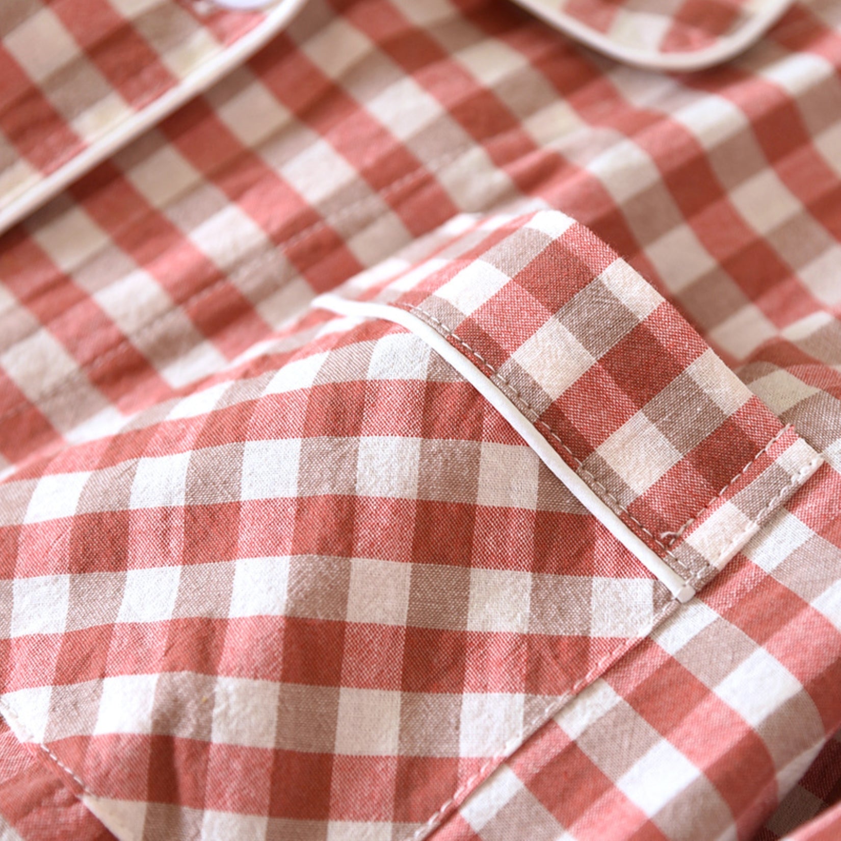 The coordinates are detailed with a classic gingham print. Features a collar, long sleeves, button front shirt and matching pajama pants. Pair it together with slides for a comfy look.