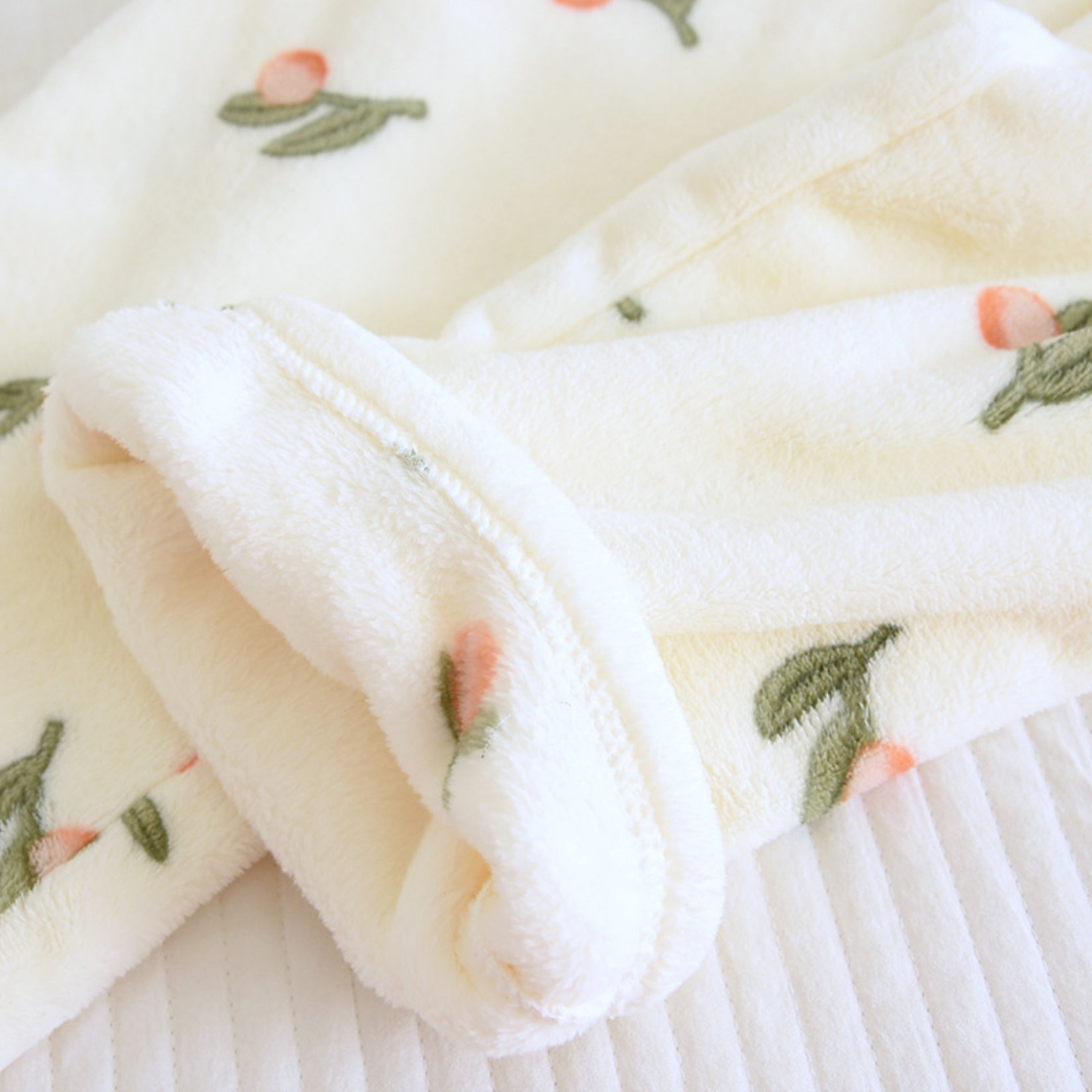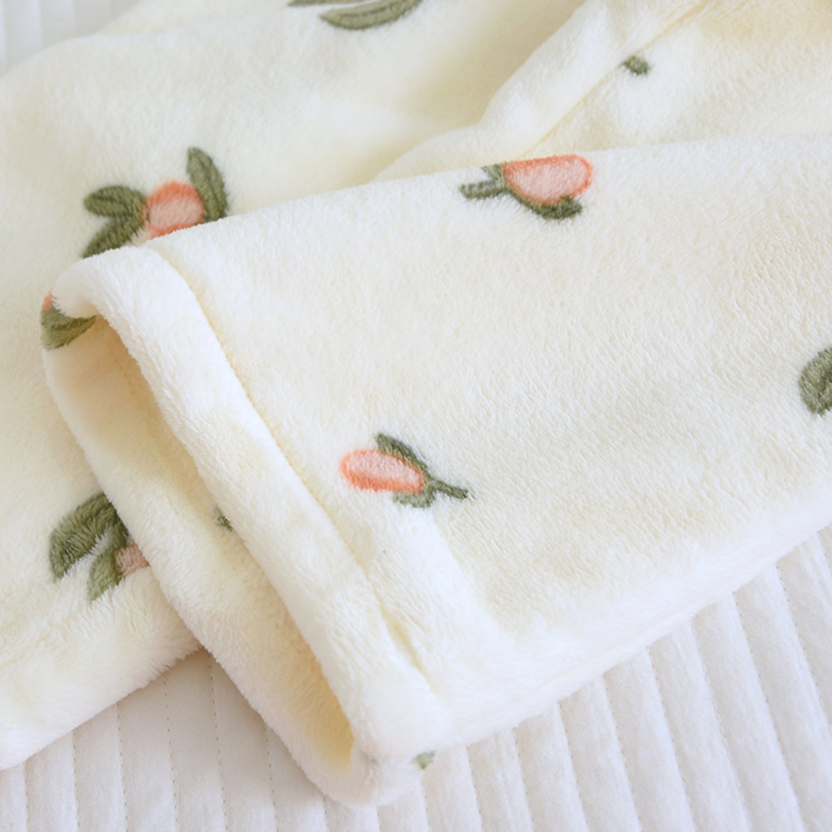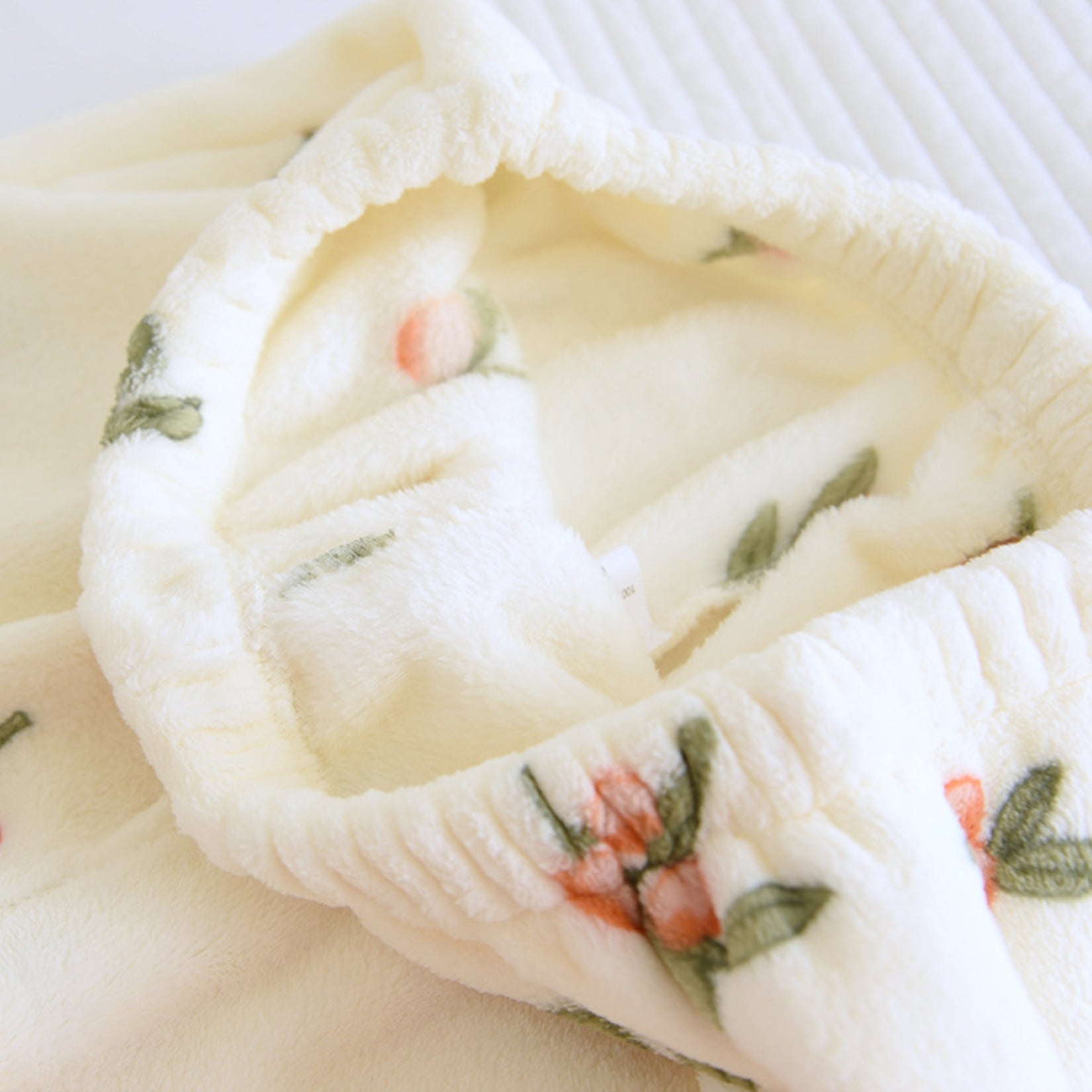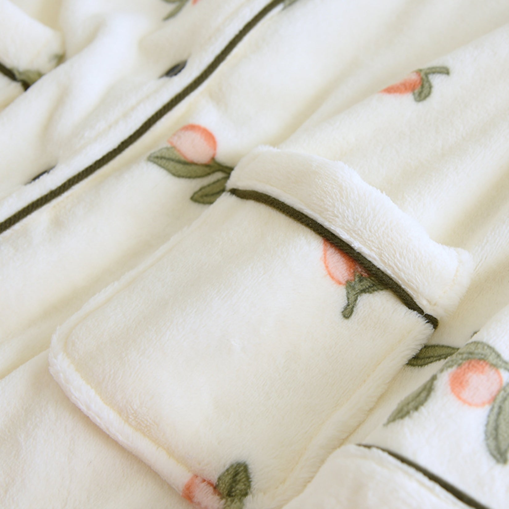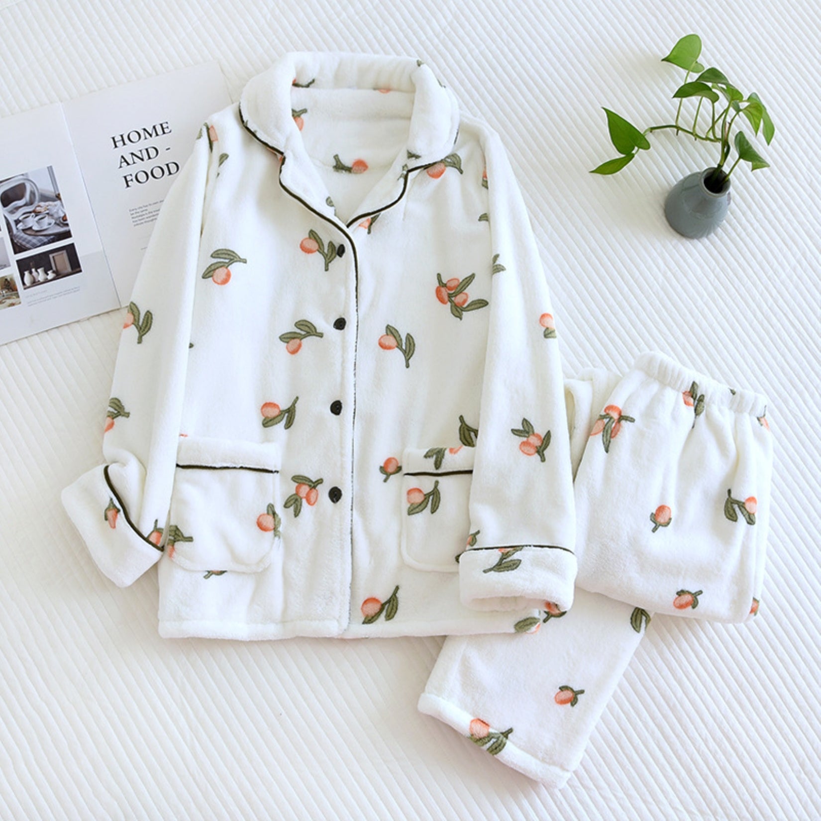 The coordinates are detailed with a soft fuzzy material. Features a floral print, collar, button front, long sleeve shirt and matching pajama pants. Pair it together with slides for a cozy look.