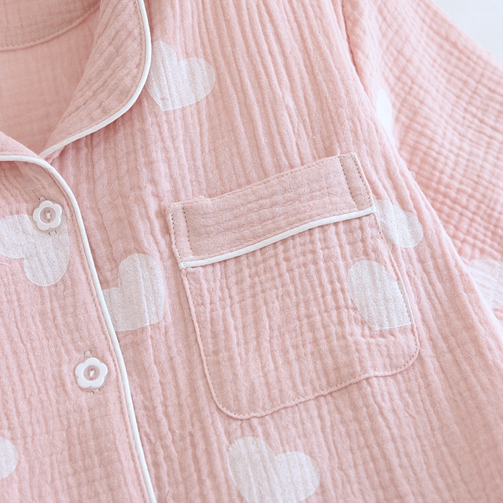 The coordinates are detailed with a cool textured material. Features a heart print, collar, button front, short sleeve shirt and matching pajama pants. Pair it together with slides for a cozy look.