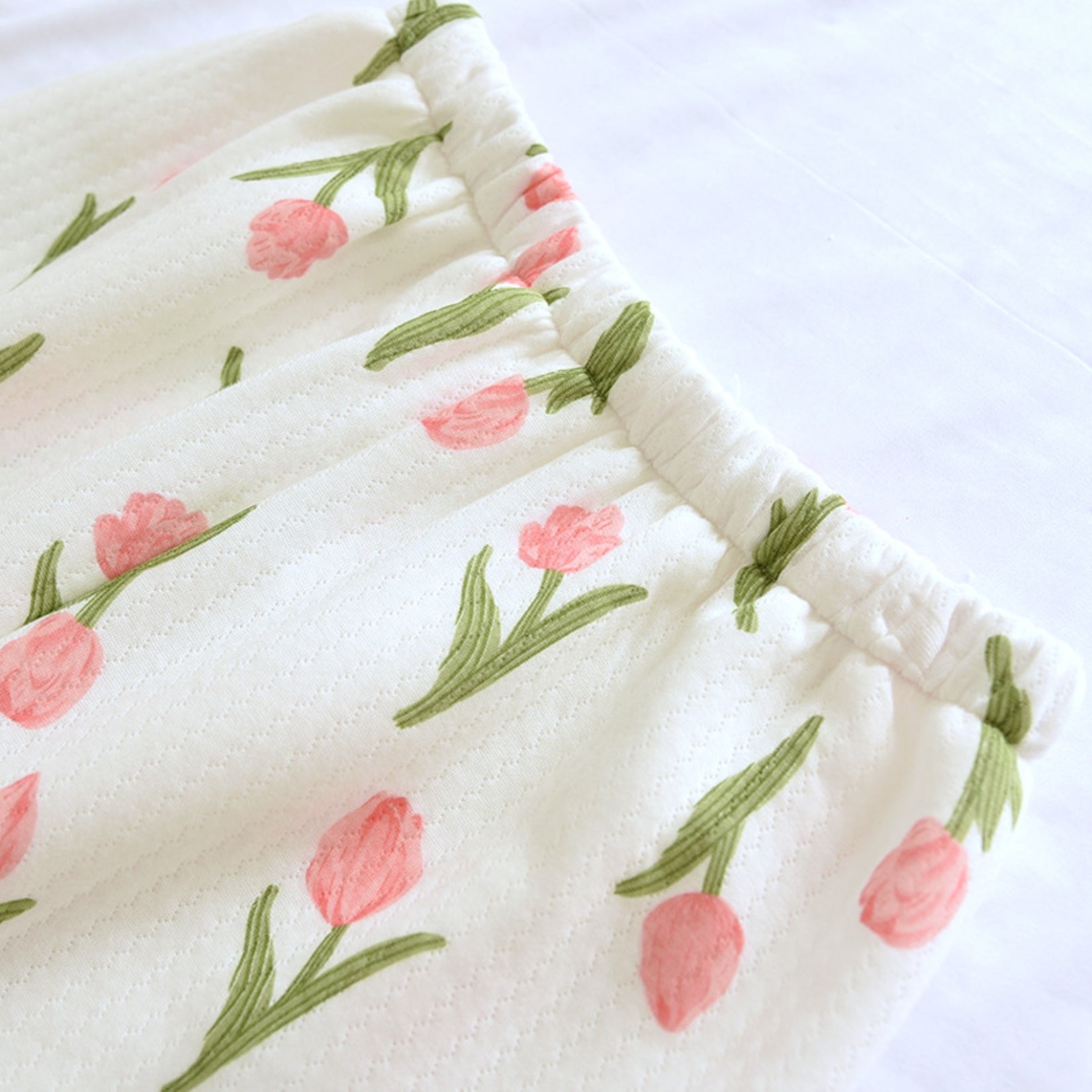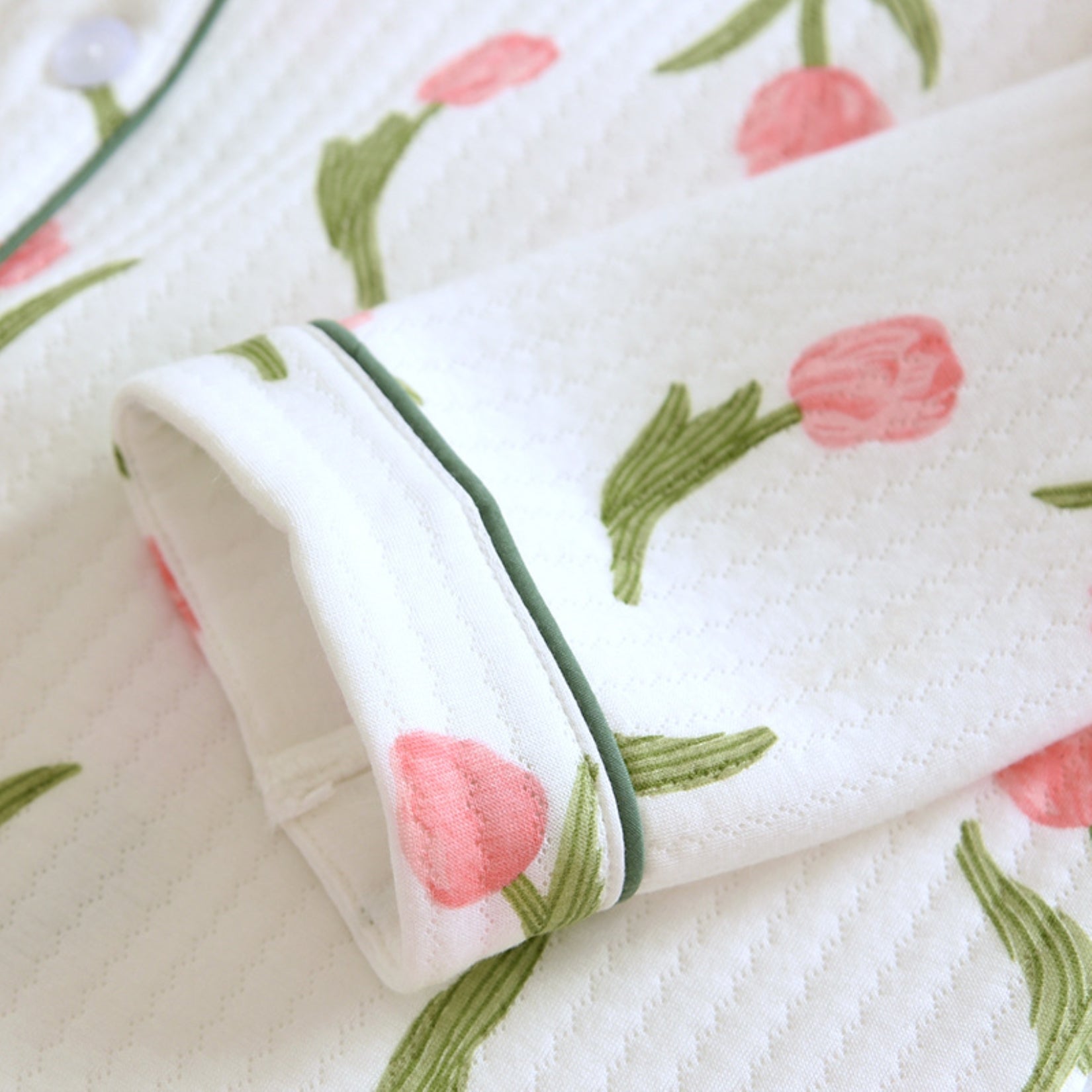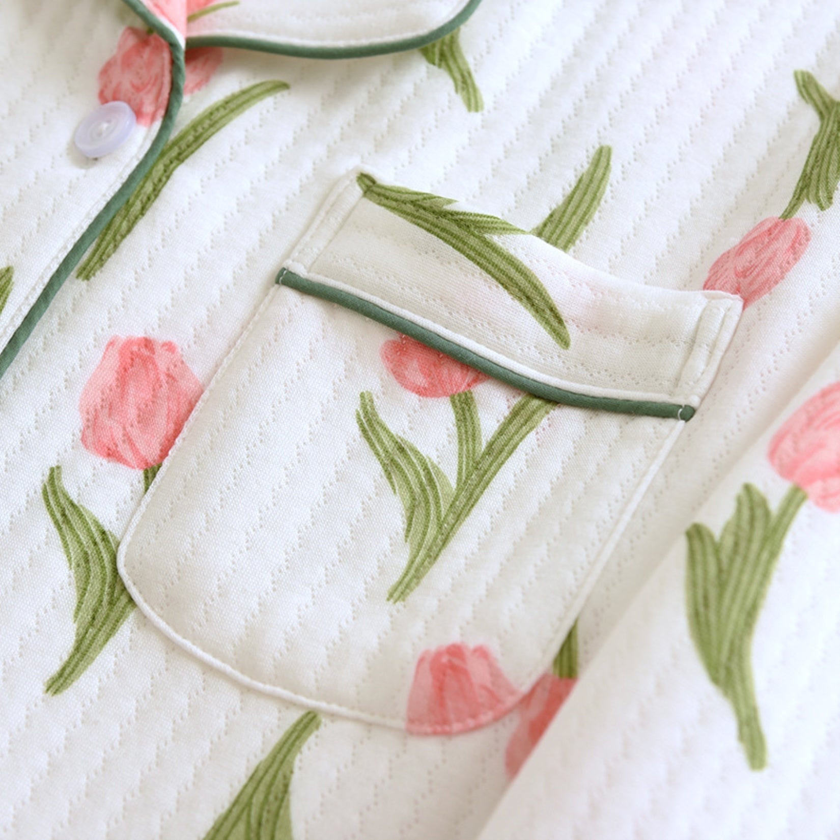 The coordinates are detailed with a cute tulip floral print. Features a textured material, collar, button front, long sleeve shirt and matching pajama pants. Pair it together with fur slippers for a cozy look.
