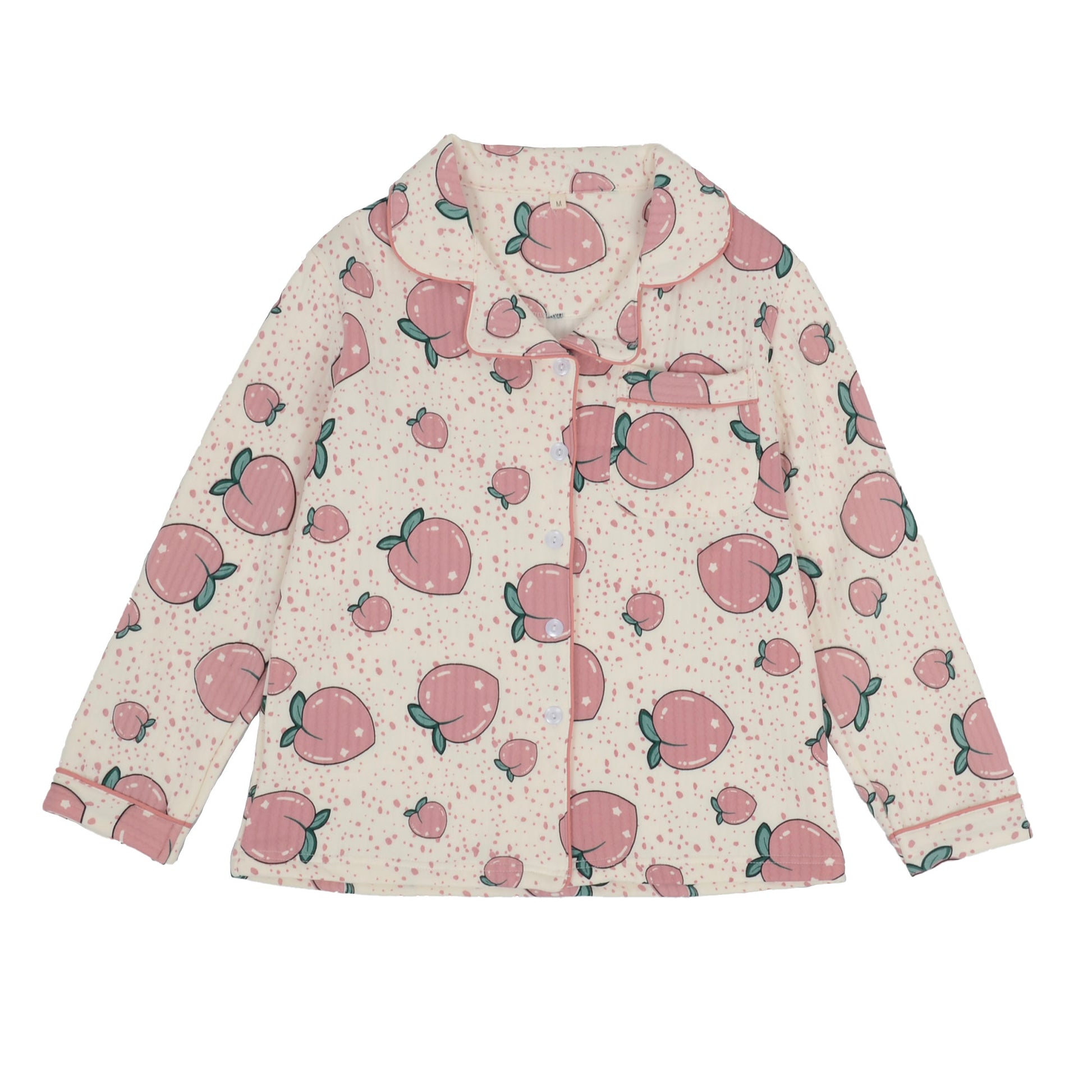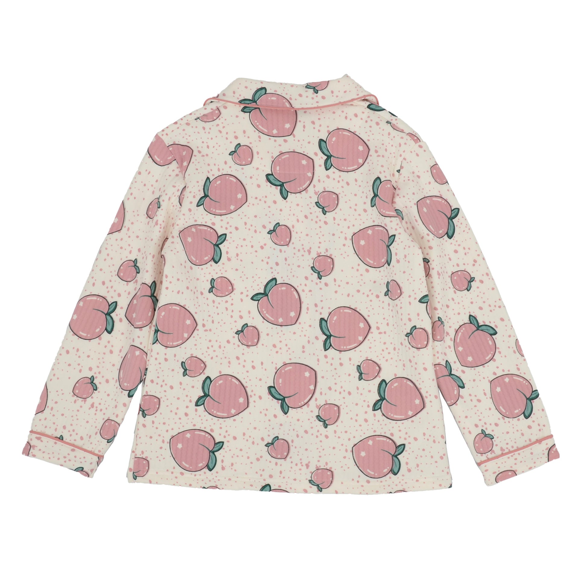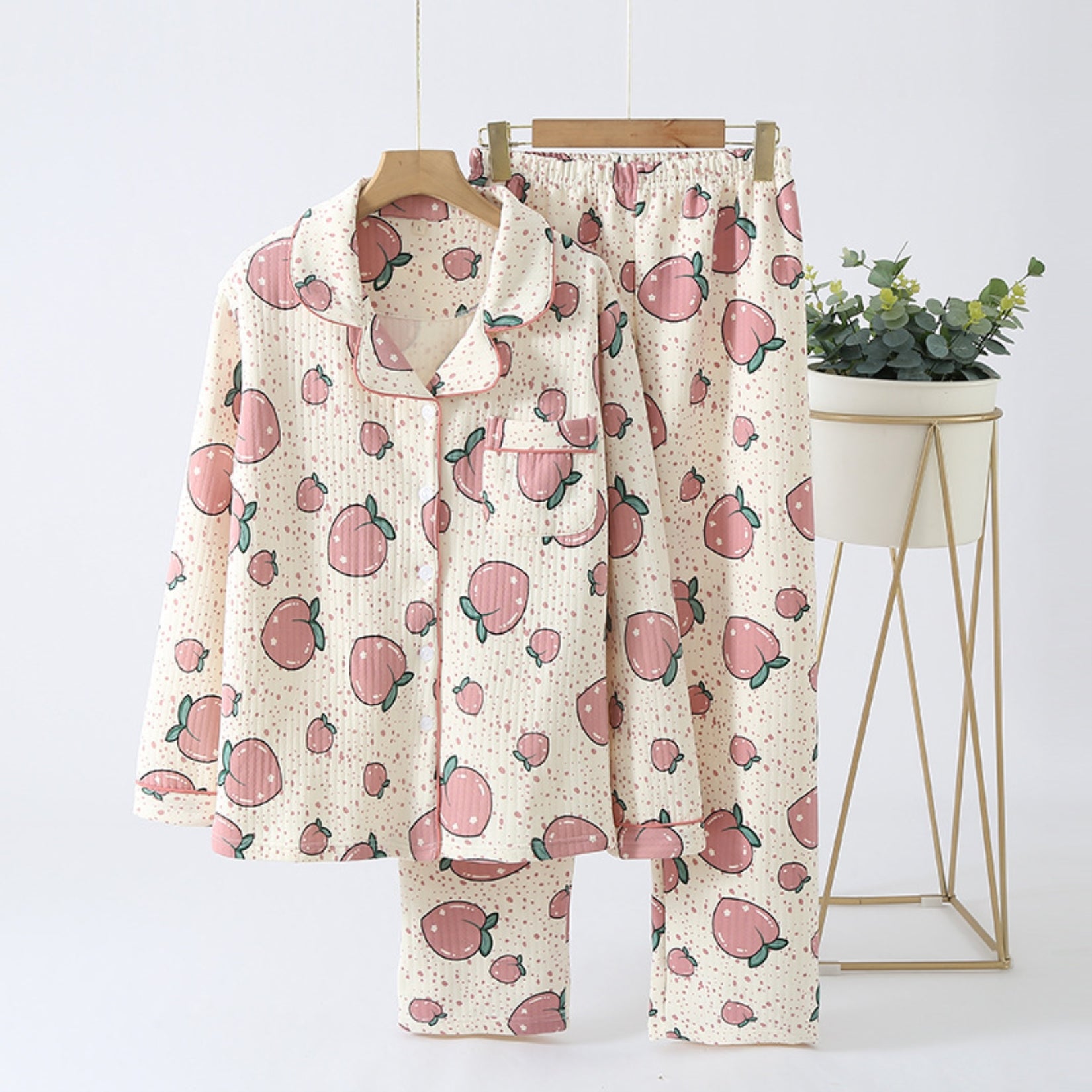 The coordinates are detailed with a fun spotted peach pattern. Features a collar, long sleeves, button front shirt and matching pajama pants. Pair it together with slides for a cozy look.