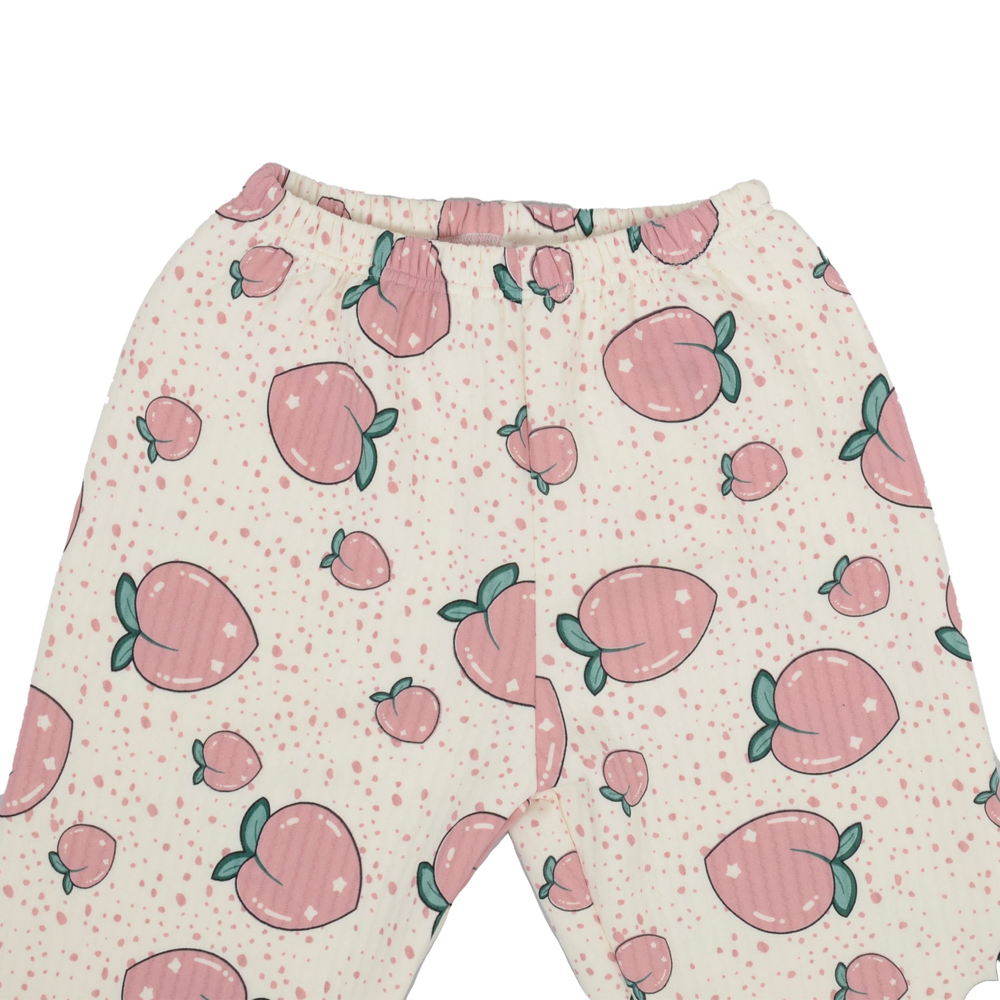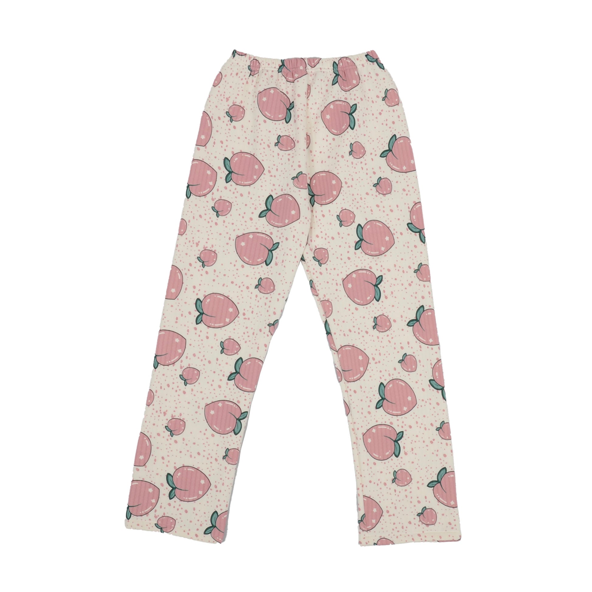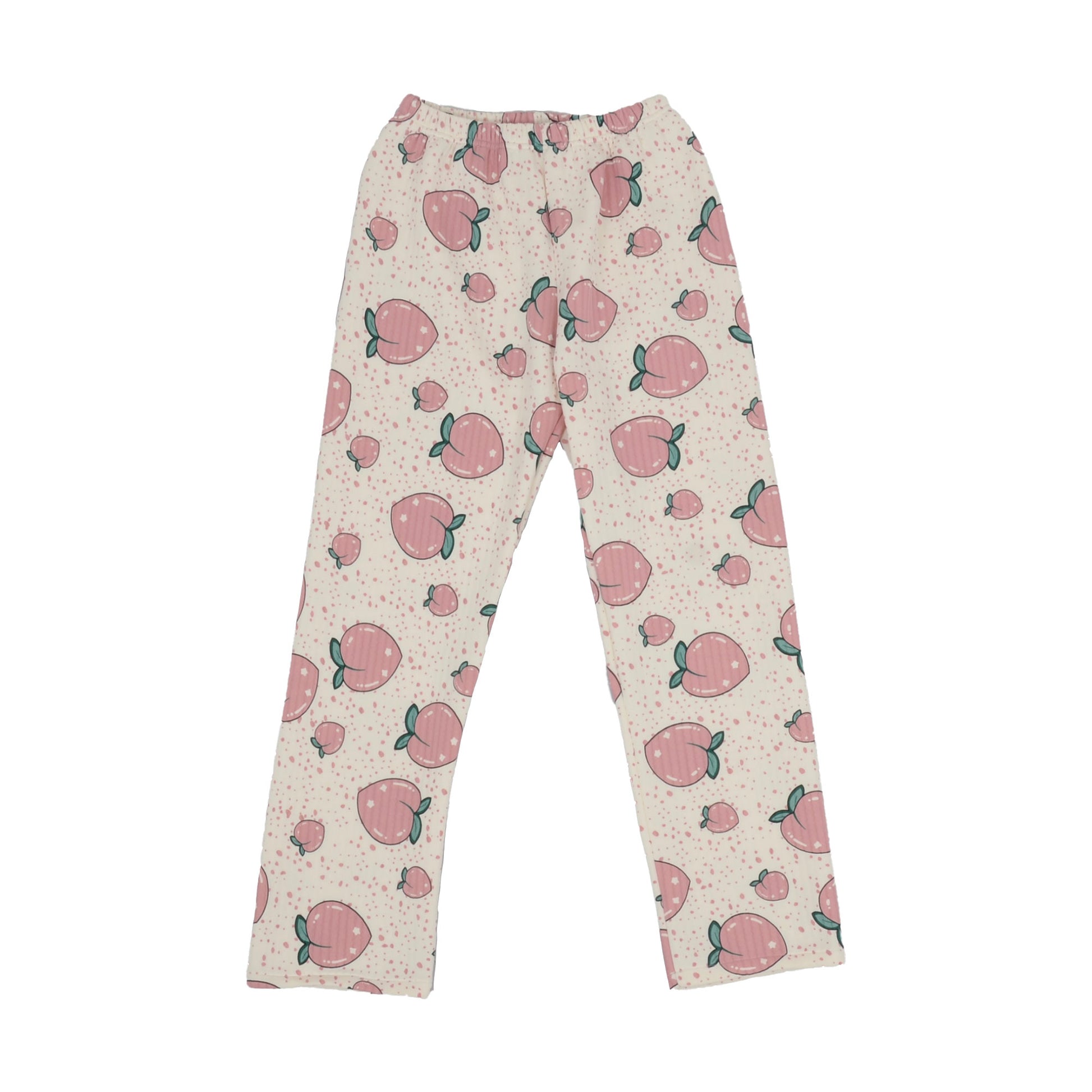 The coordinates are detailed with a fun spotted peach pattern. Features a collar, long sleeves, button front shirt and matching pajama pants. Pair it together with slides for a cozy look.