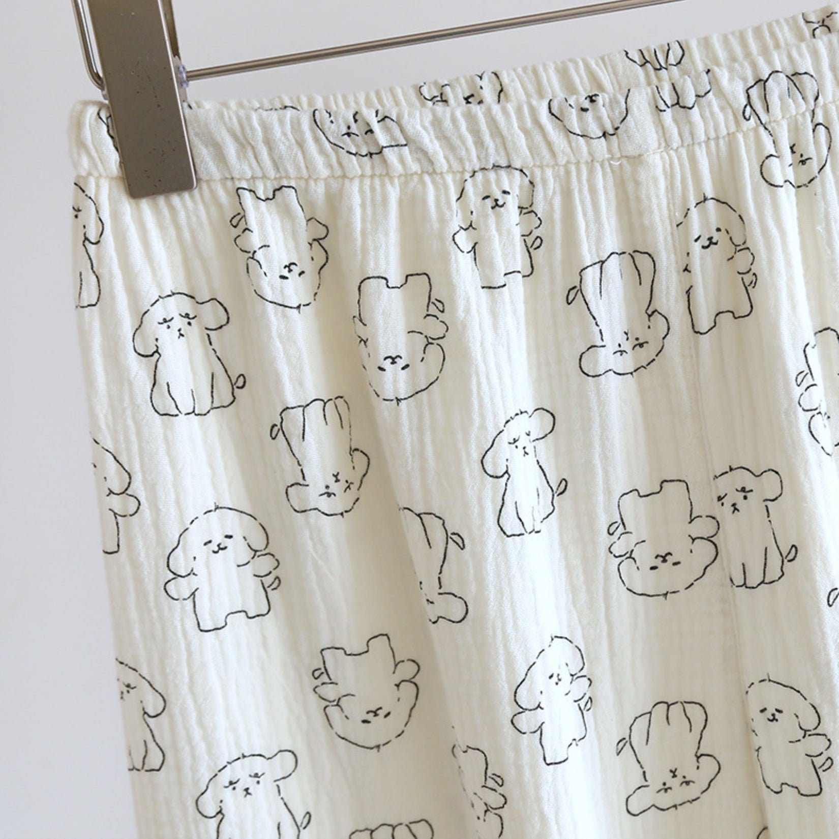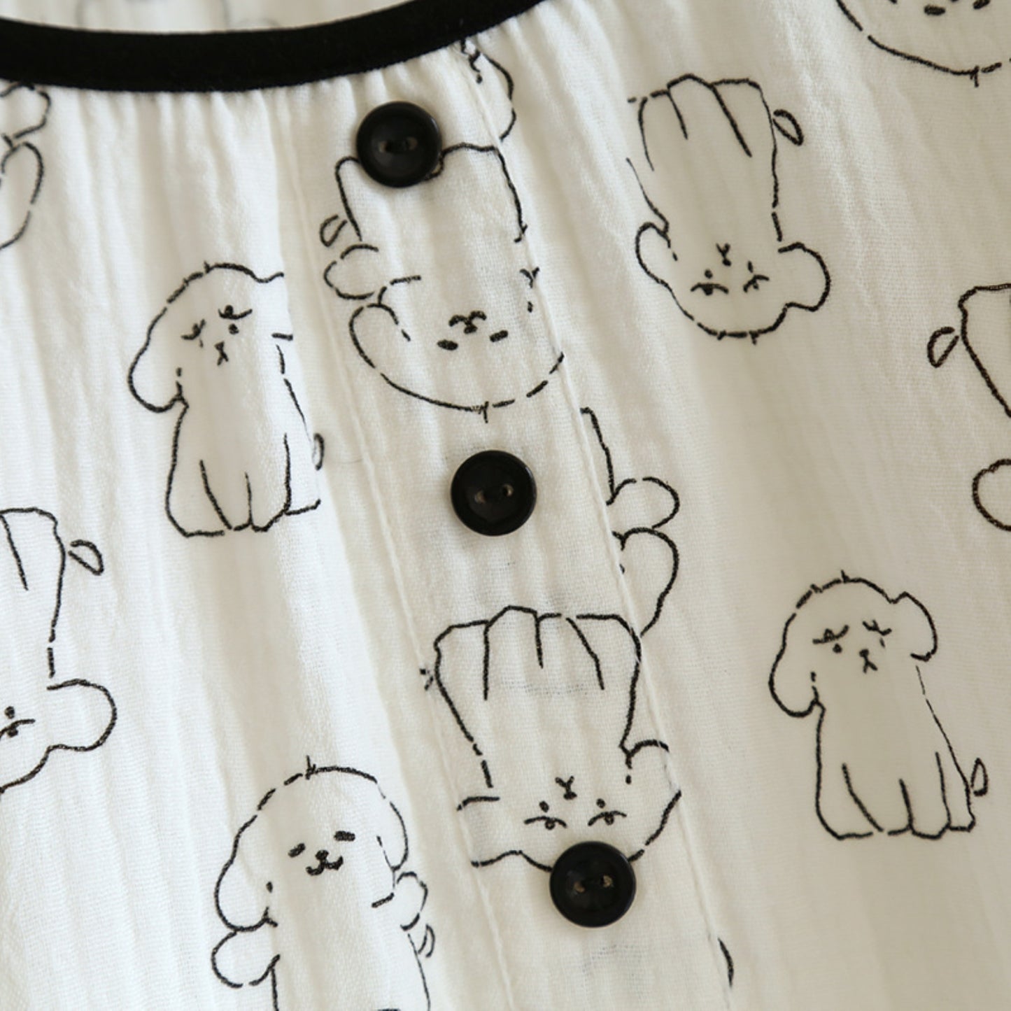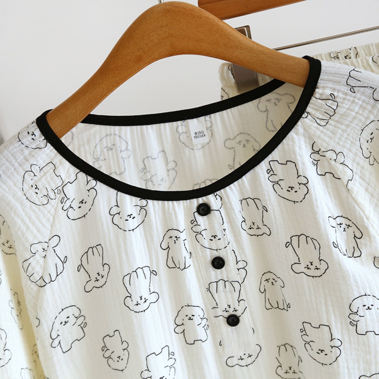 The coordinates are detailed with a cute dog pattern. Features a textured material, round neck, button detail, long sleeve shirt and matching pajama pants. Pair it together with slides for a comfy look.