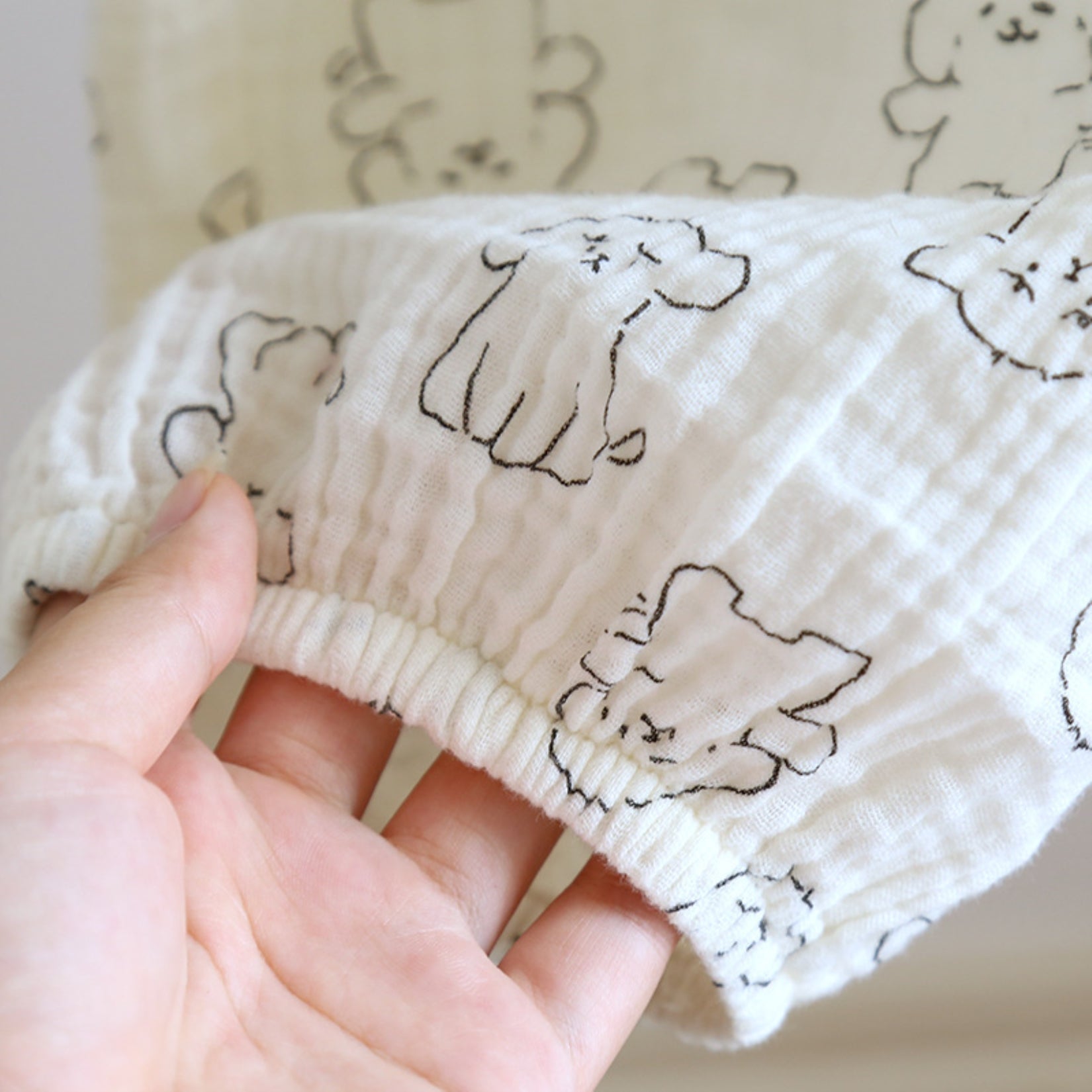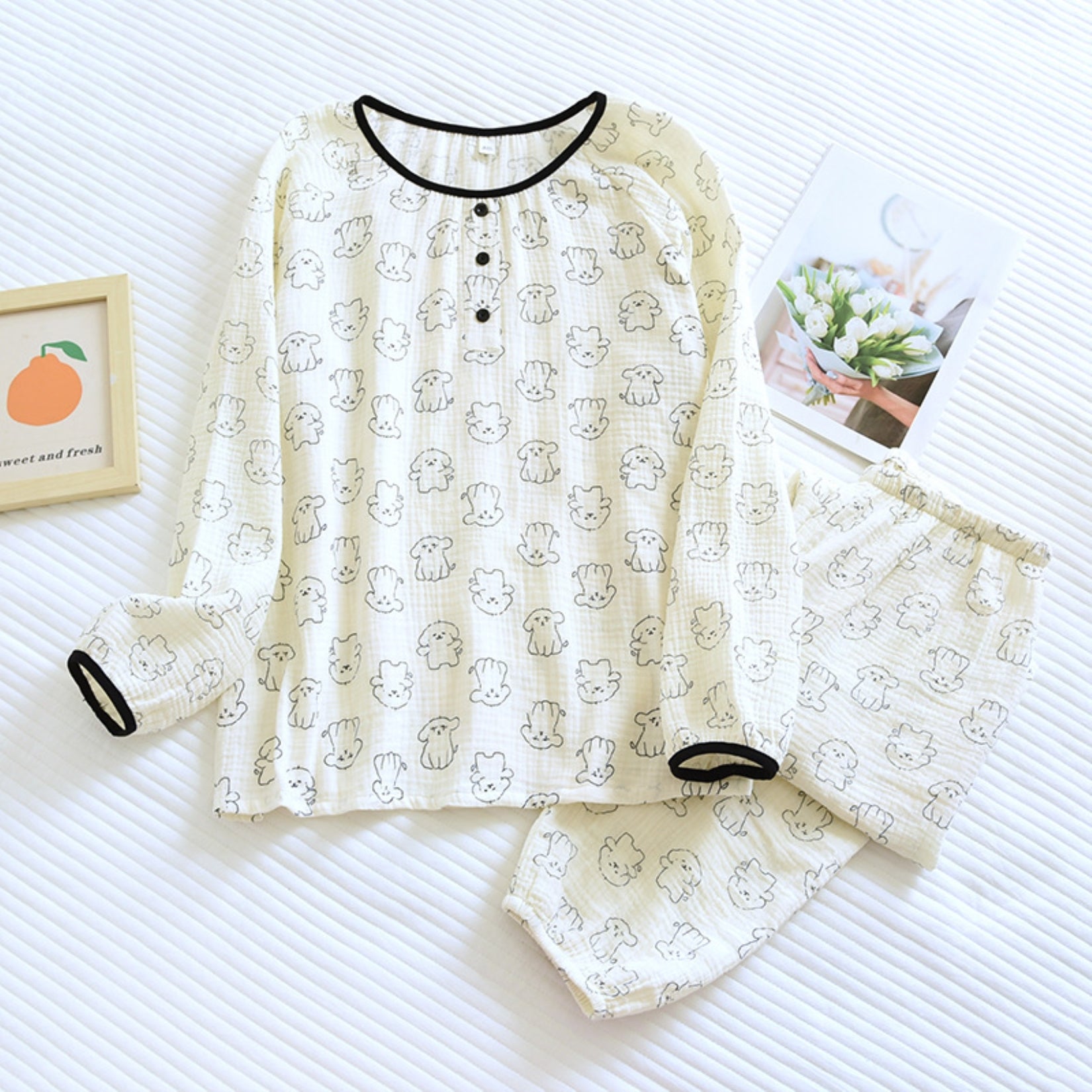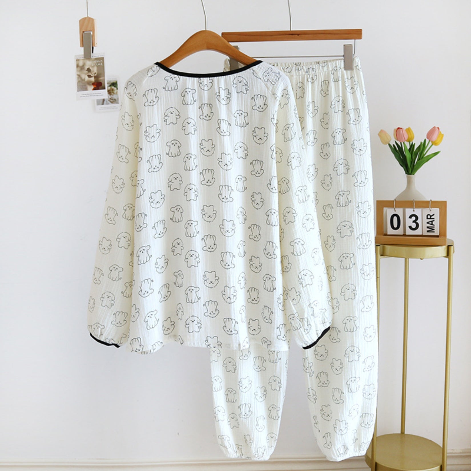 The coordinates are detailed with a cute dog pattern. Features a textured material, round neck, button detail, long sleeve shirt and matching pajama pants. Pair it together with slides for a comfy look.
