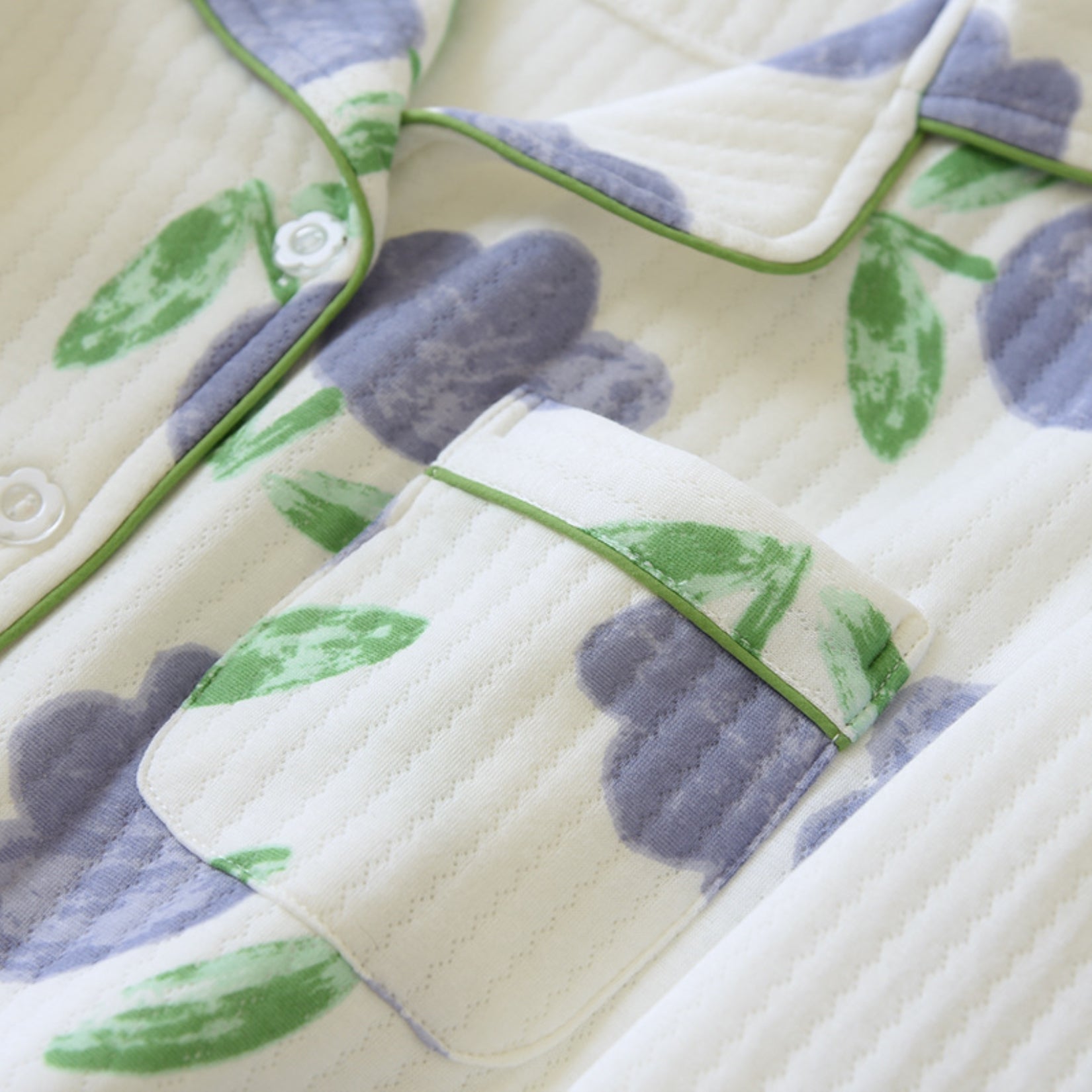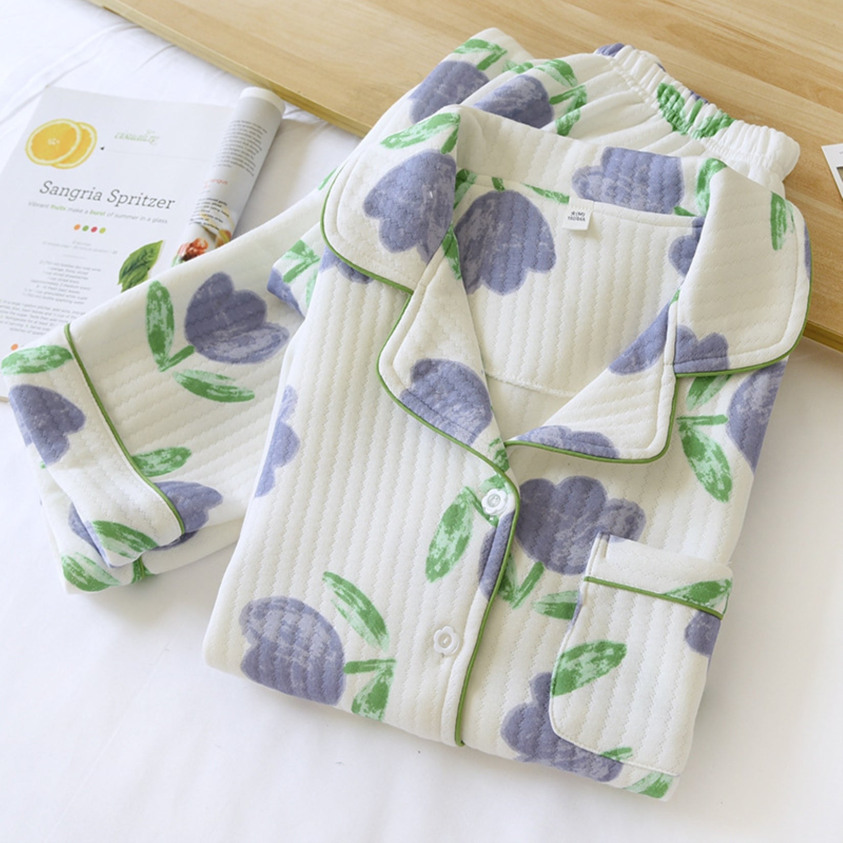 The coordinates are detailed with a lovely tulip pattern. Features a textured material, collar, long sleeve, button front shirt and matching pajama pants. Pair it together with fuzzy slides for a cozy look.