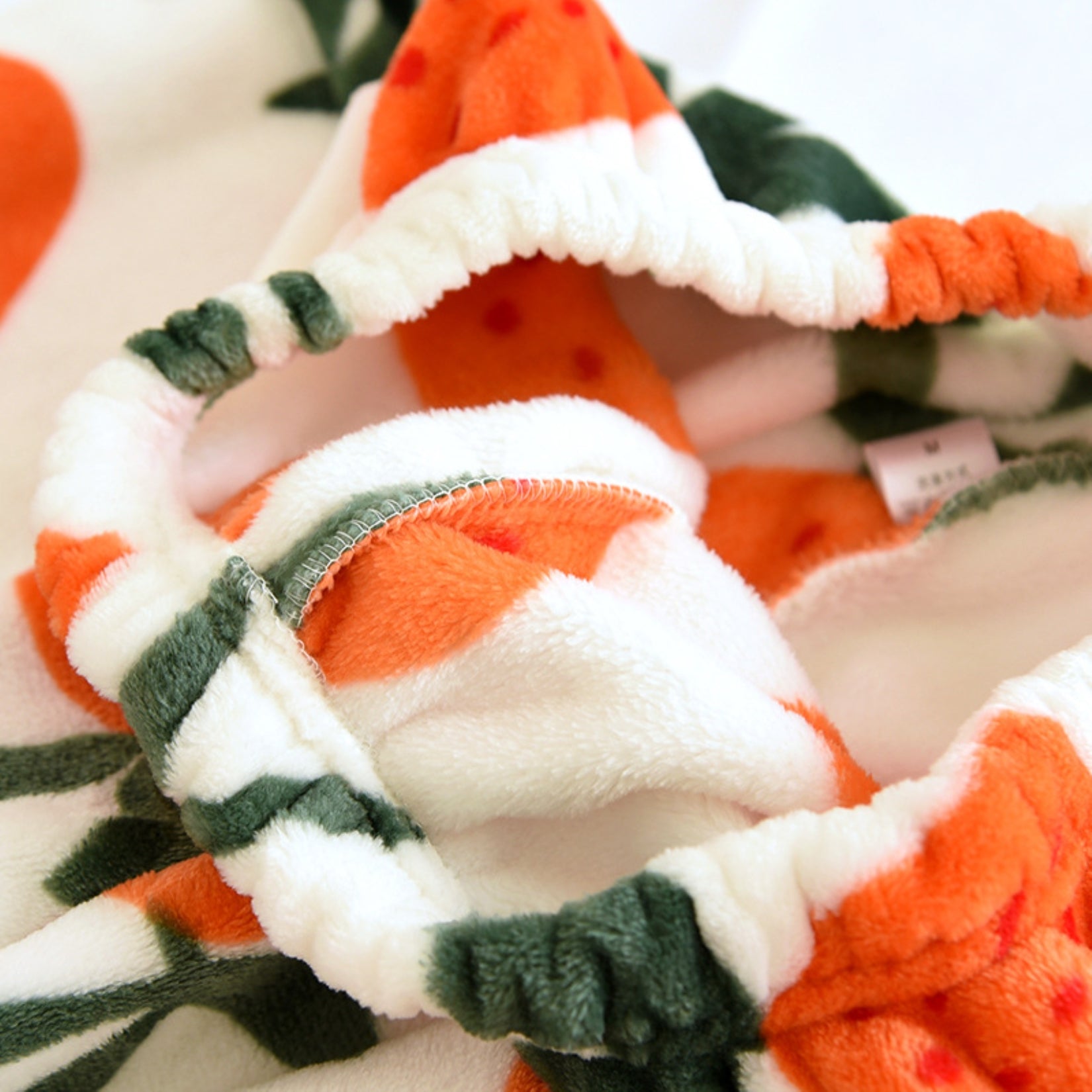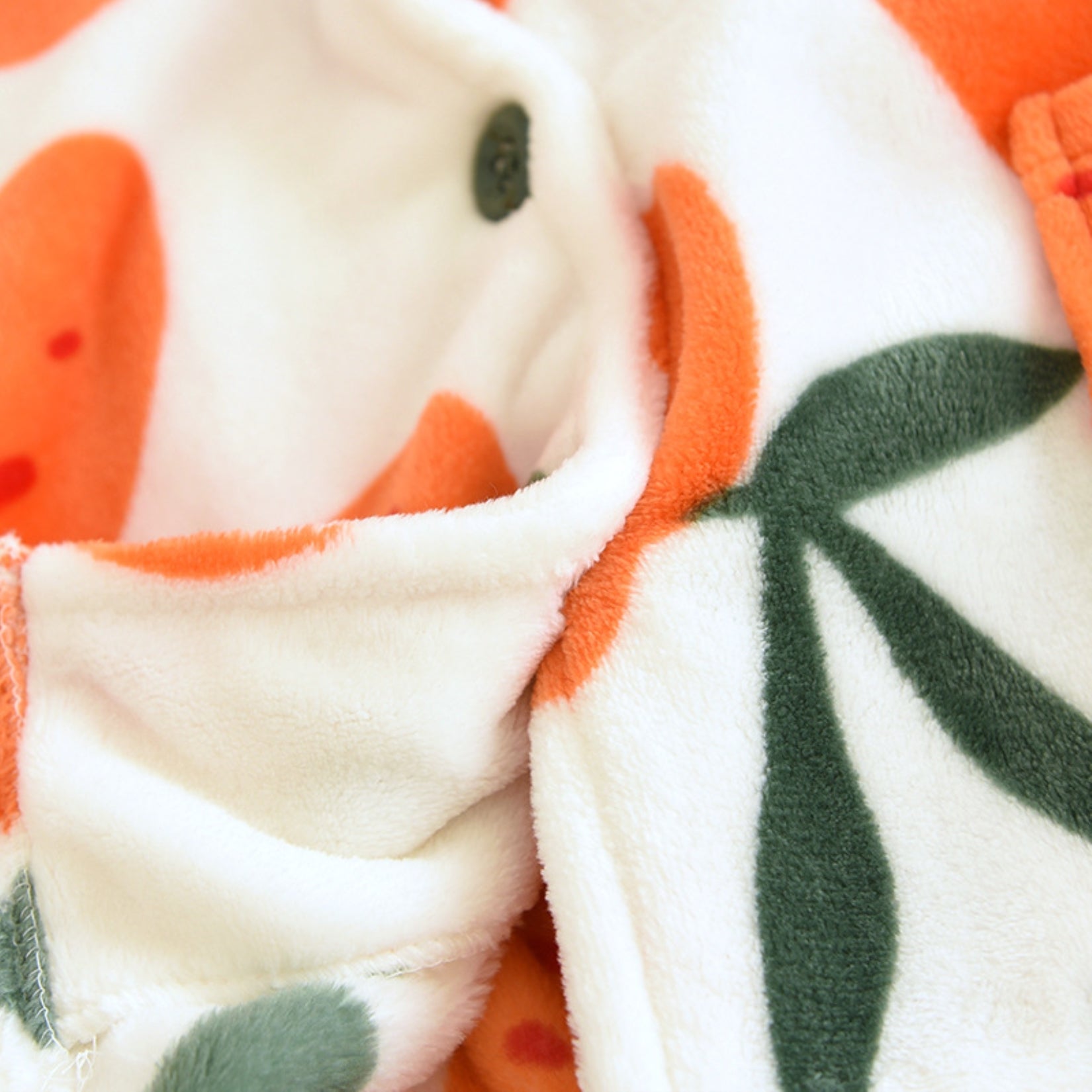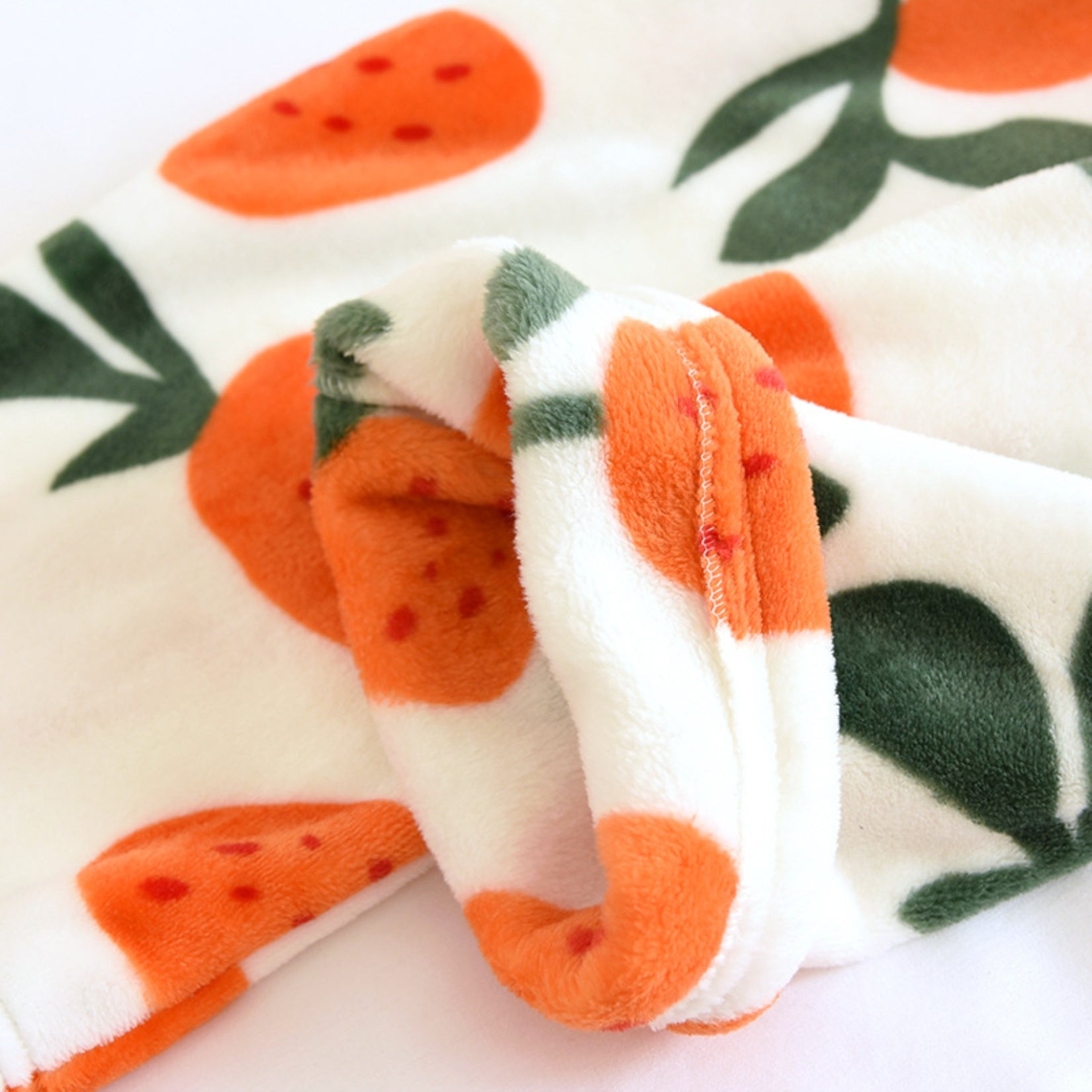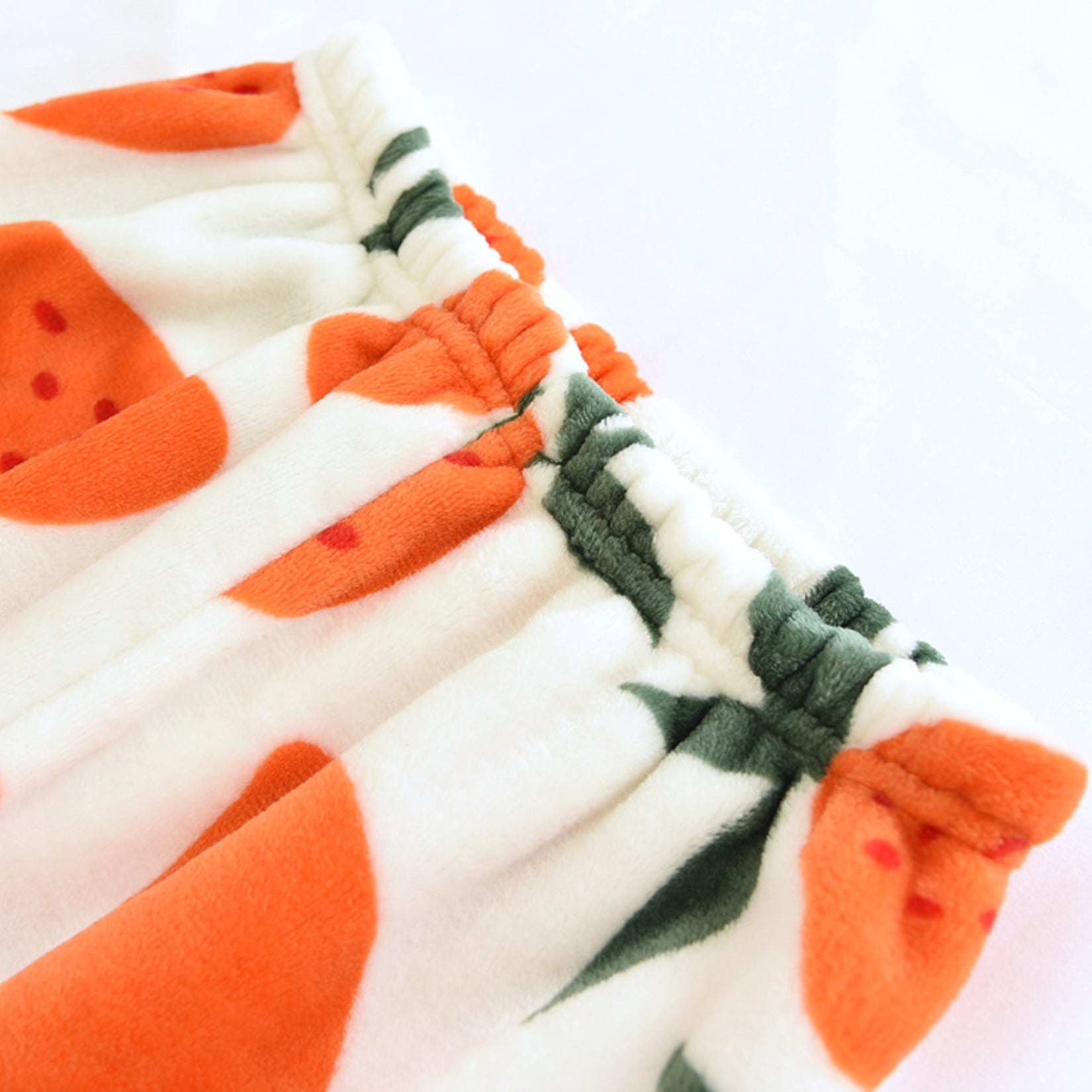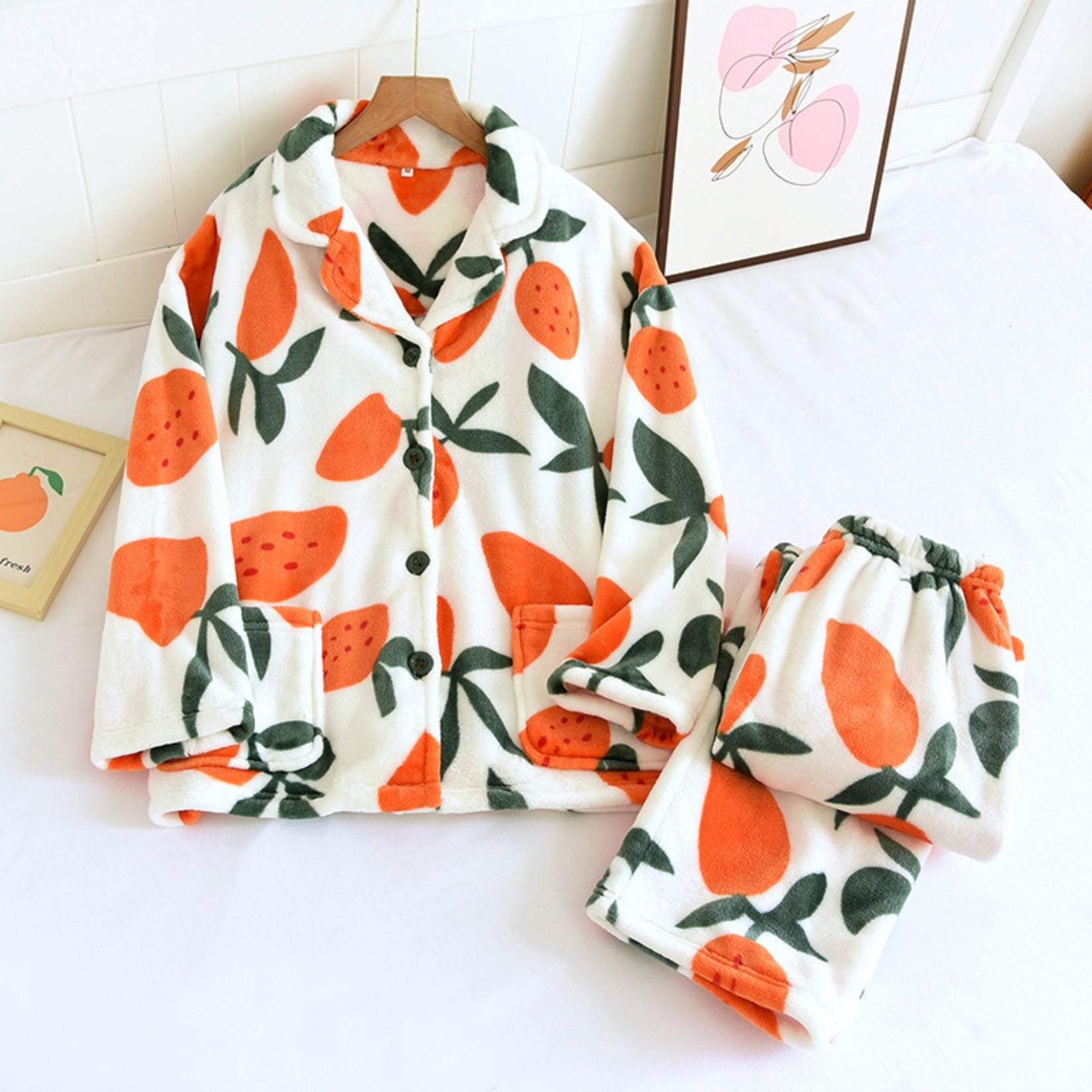 The coordinates are detailed with a funky contrast fruit pattern. Features a collar, button front, long sleeve shirt and matching pajama pants. Pair it together with slides for a cozy look.