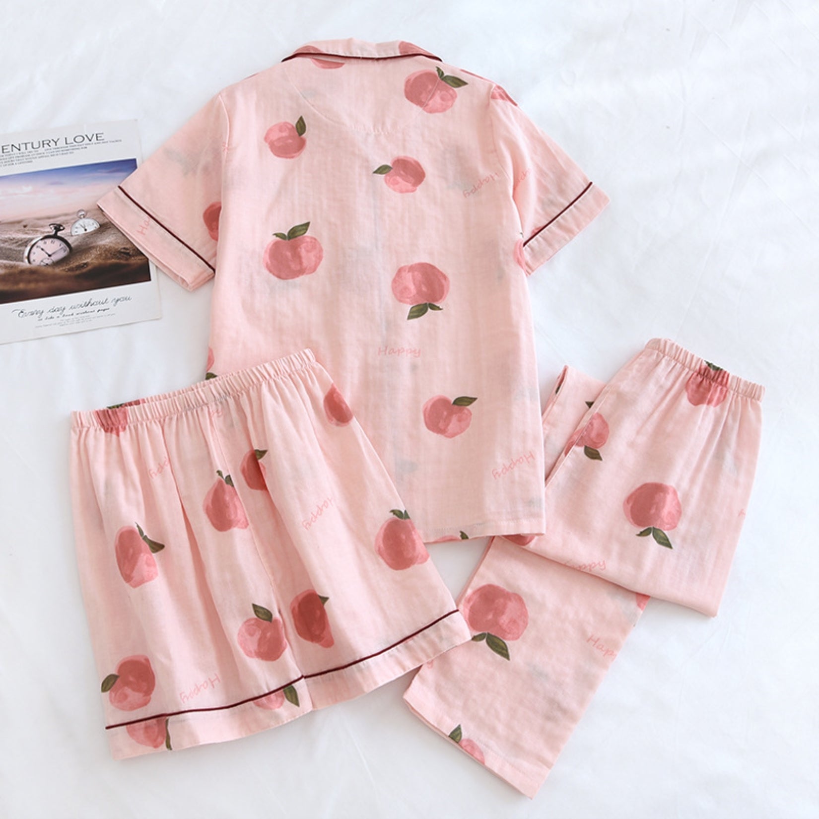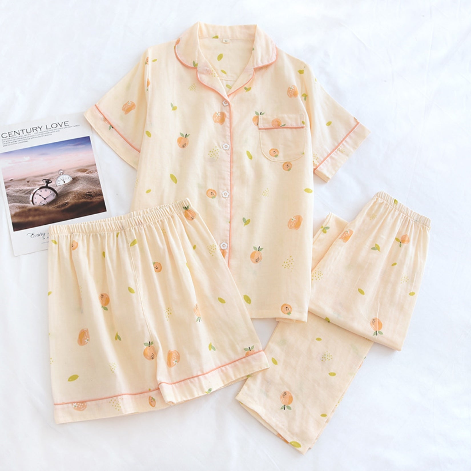 The set is detailed with cute patterns. Features a collar, button front, short sleeve shirt, matching shorts and pajama pants. Mix and match it for a fabulous look.