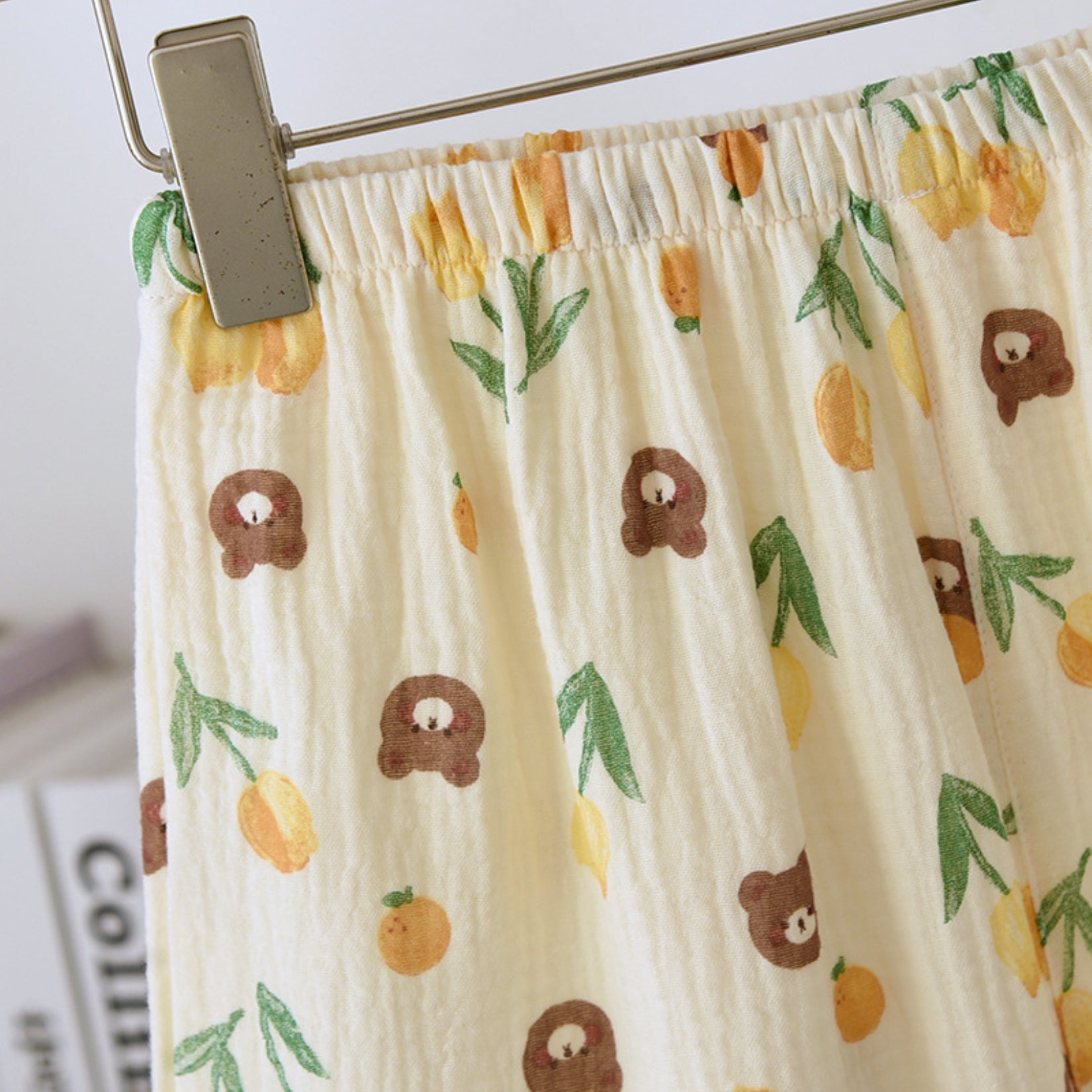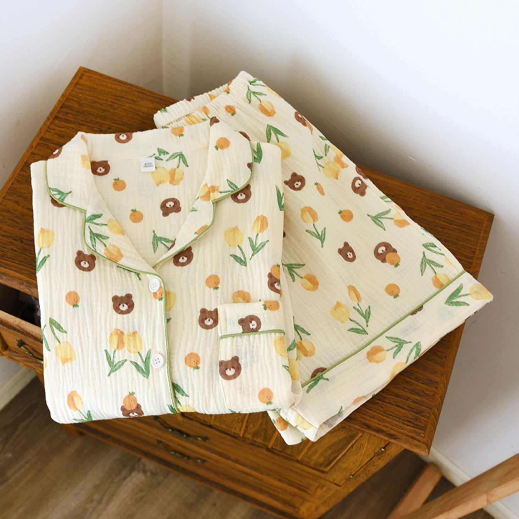 The coordinates are detailed with a fun mixed print. Features a collar, button front, short sleeve top and matching shorts. Pair it together with slides for a cozy look.