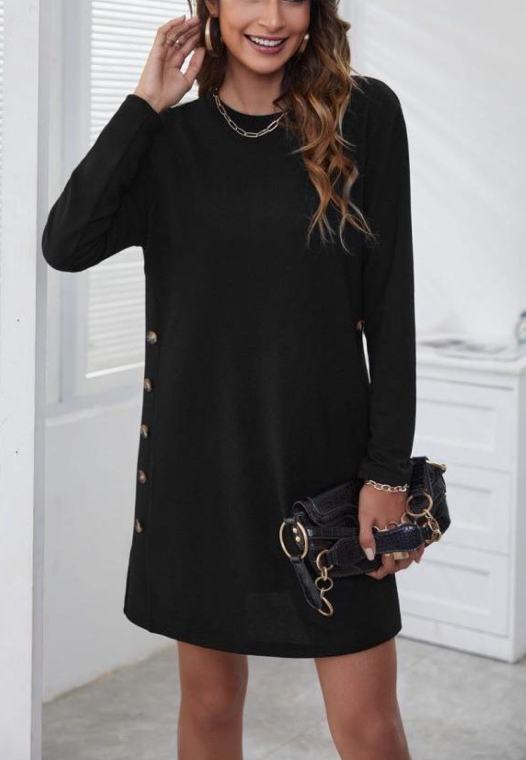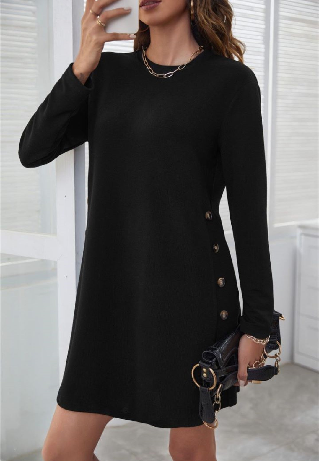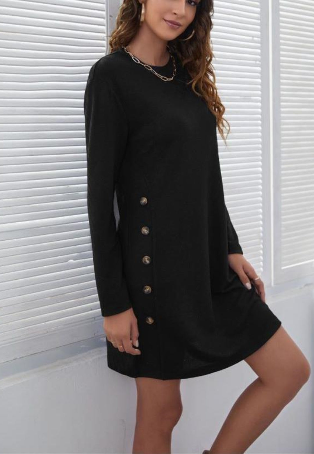 The dress is detailed with a fabulous side button detail. Features solid color, round neck line, long sleeves, straight cut silhouette, and above knee length. Pair it with a beanie and boots for a cozy look.