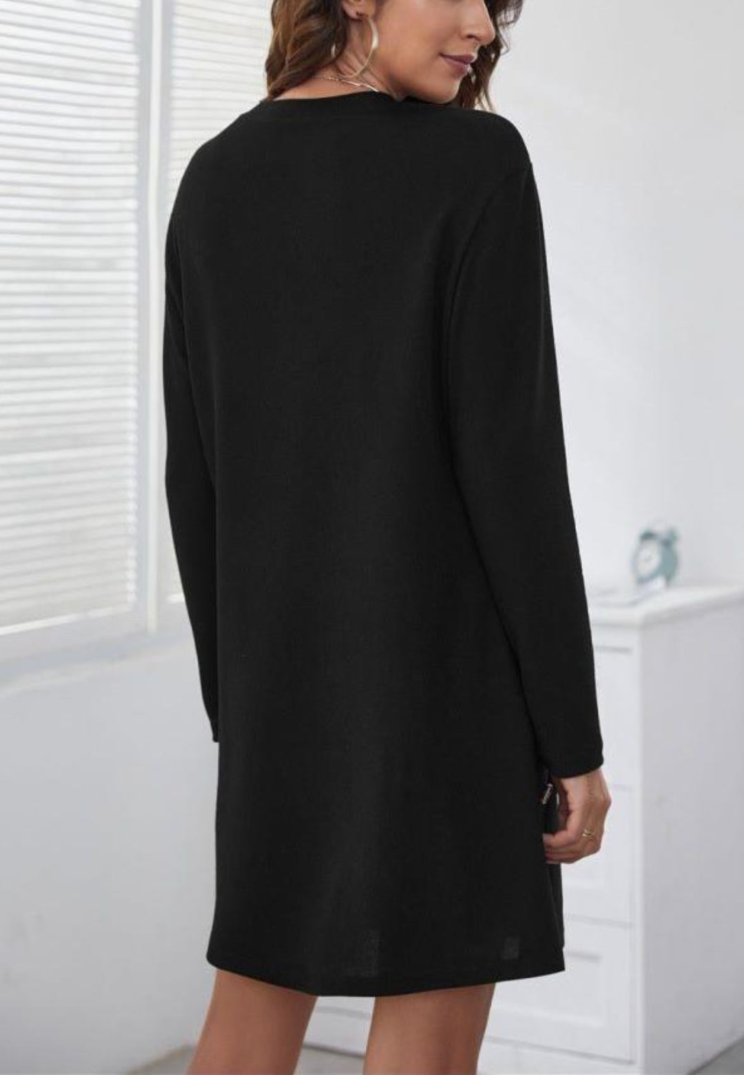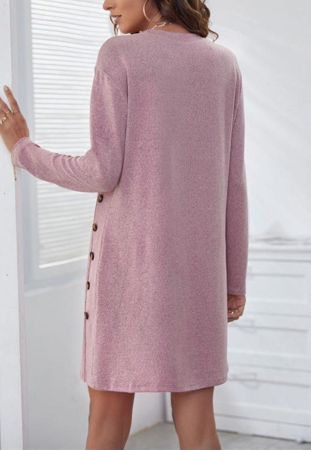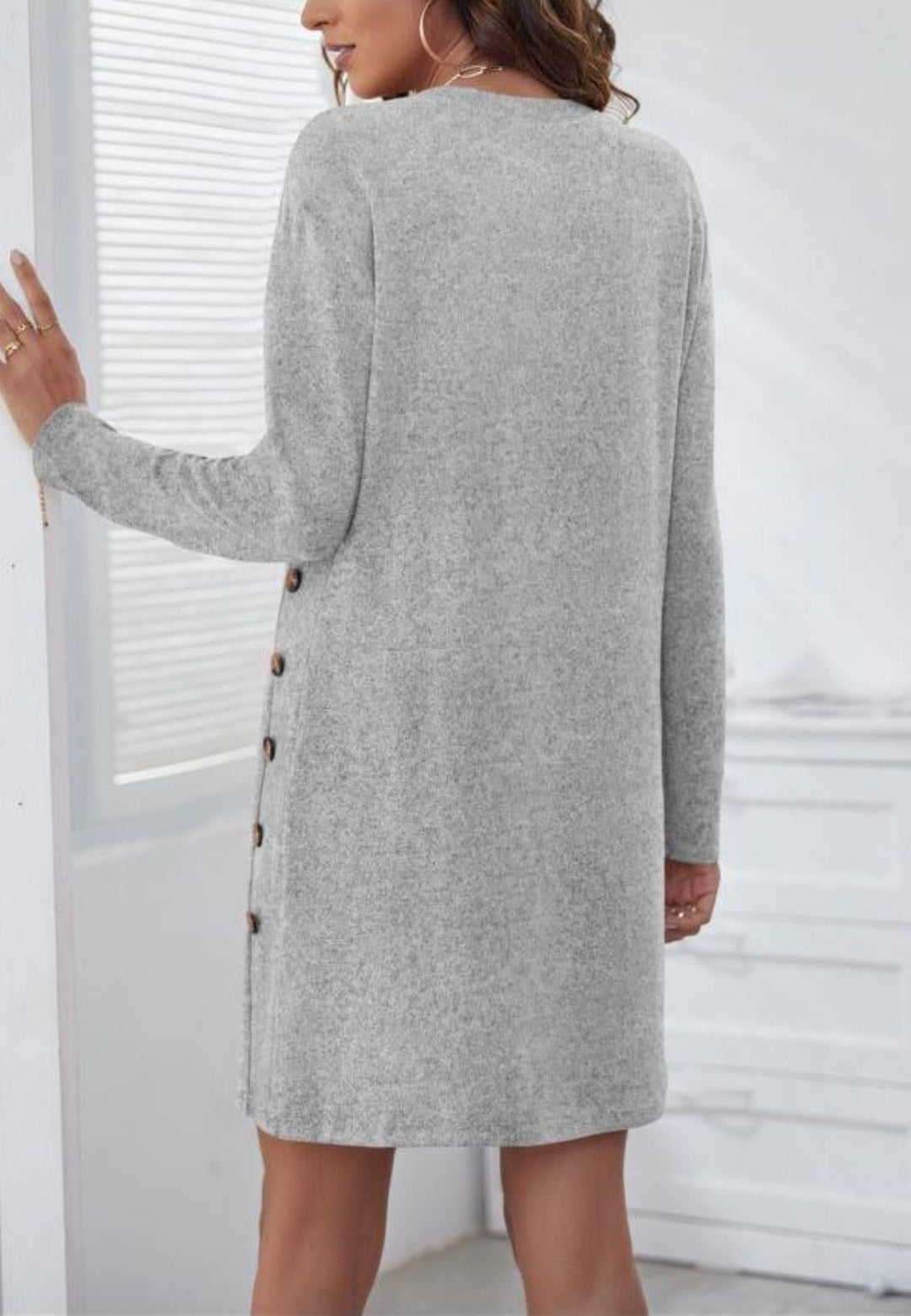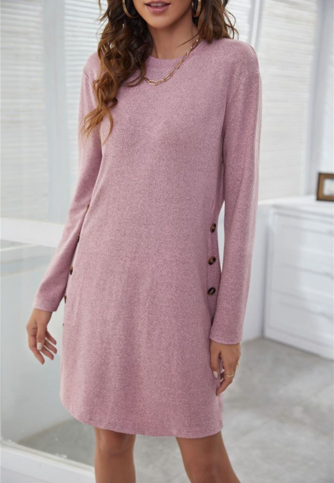 The dress is detailed with a fabulous side button detail. Features solid color, round neck line, long sleeves, straight cut silhouette, and above knee length. Pair it with a beanie and boots for a cozy look.