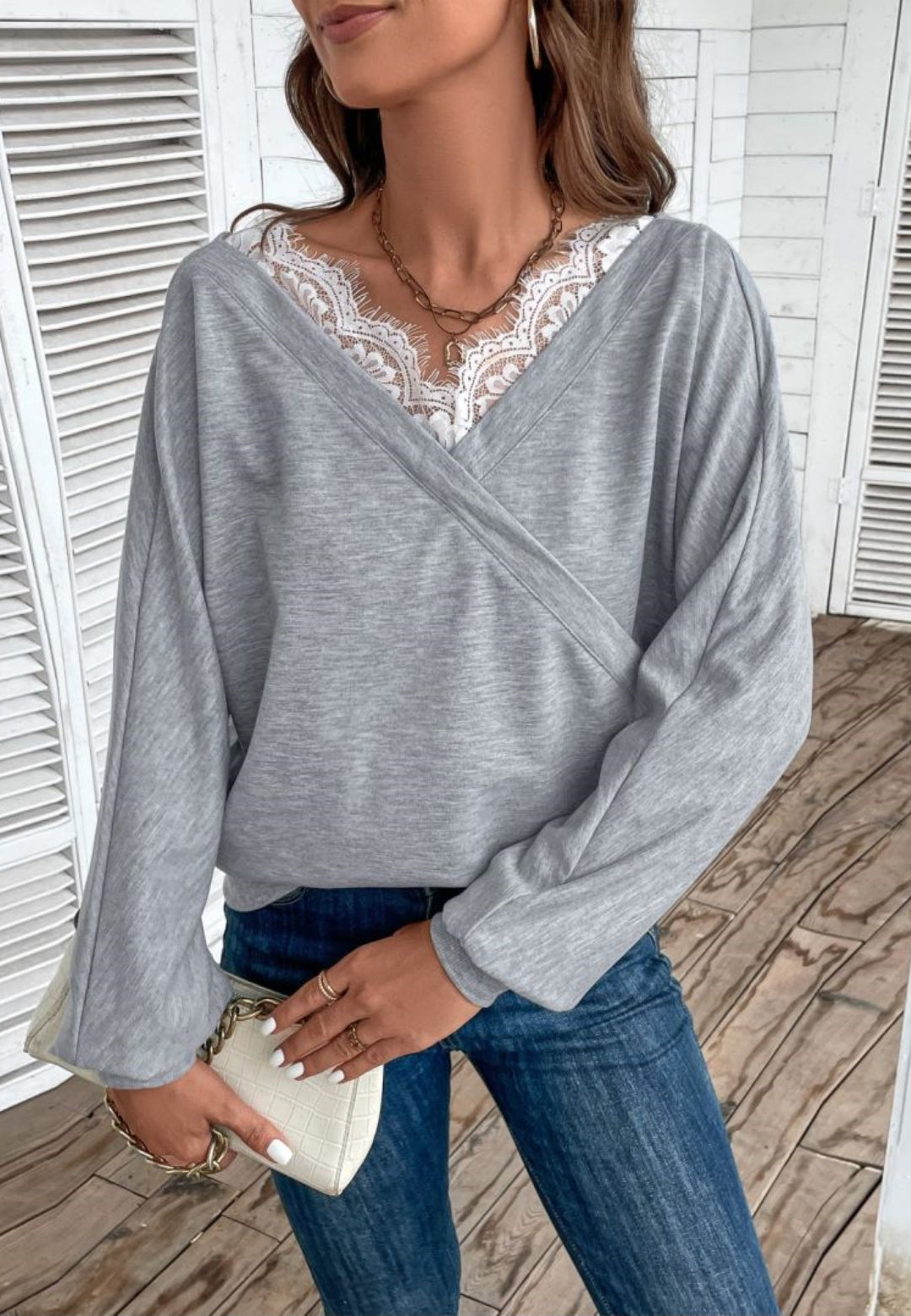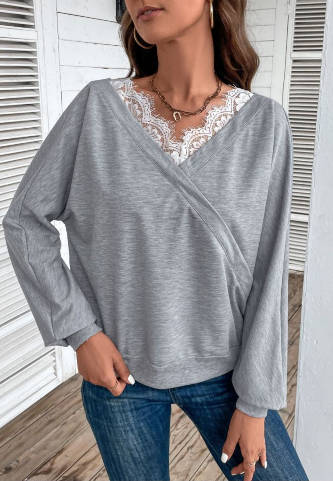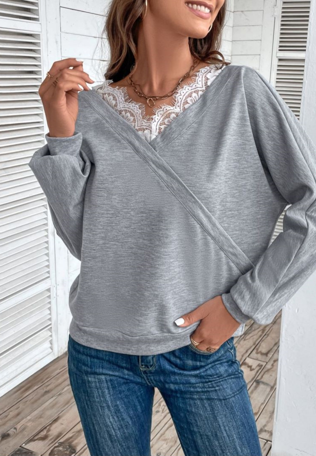 The sweater is detailed with a dainty lace trim. Features a surplice neck line, long sleeves, and regular fit. Pair it with bootcut jeans and sneakers for a fabulous look.