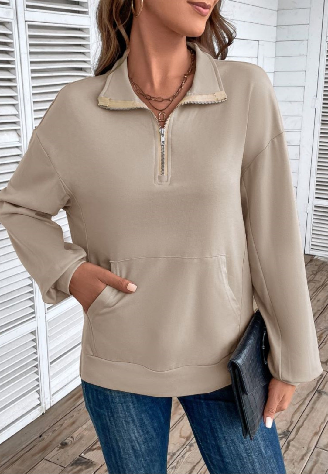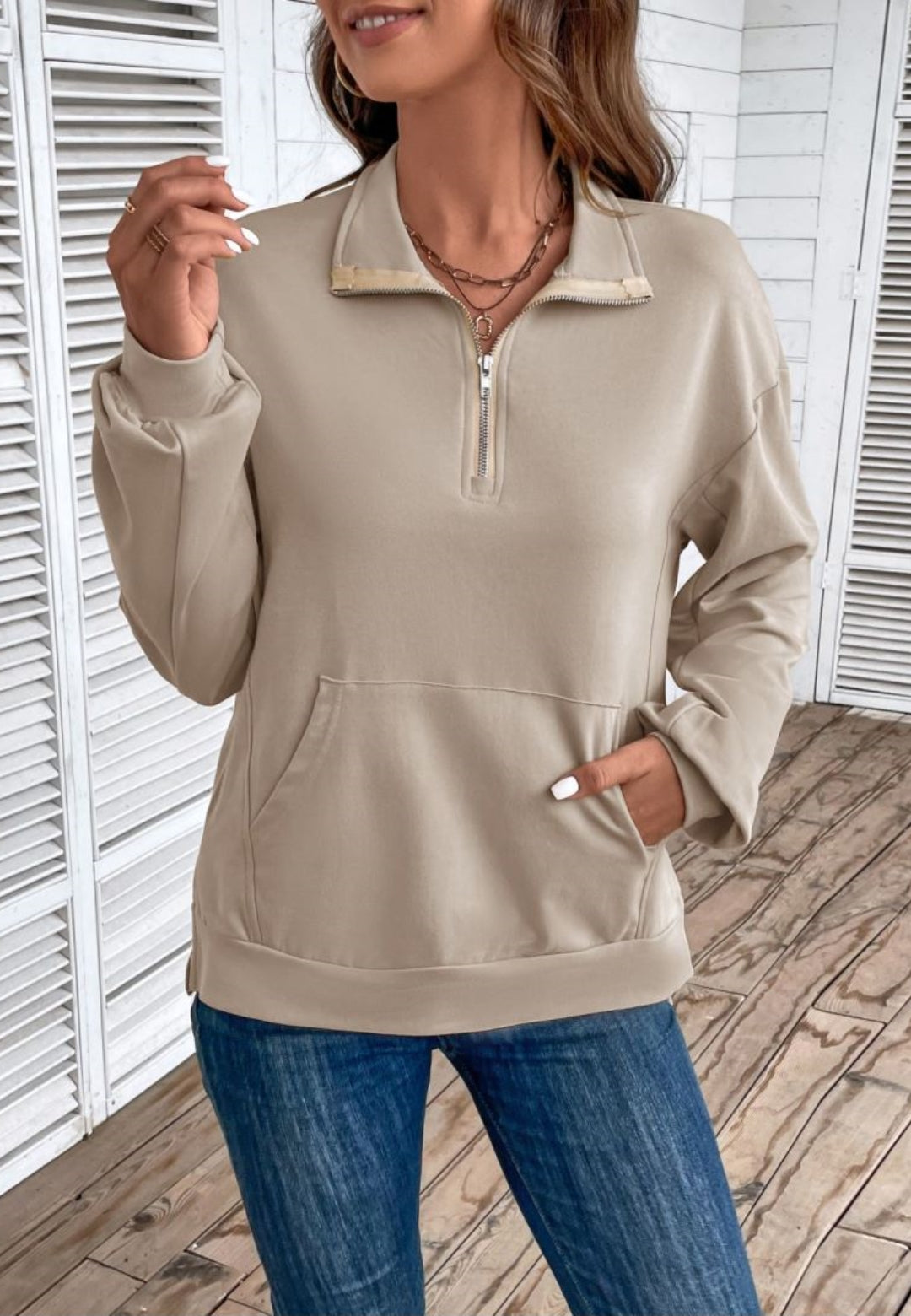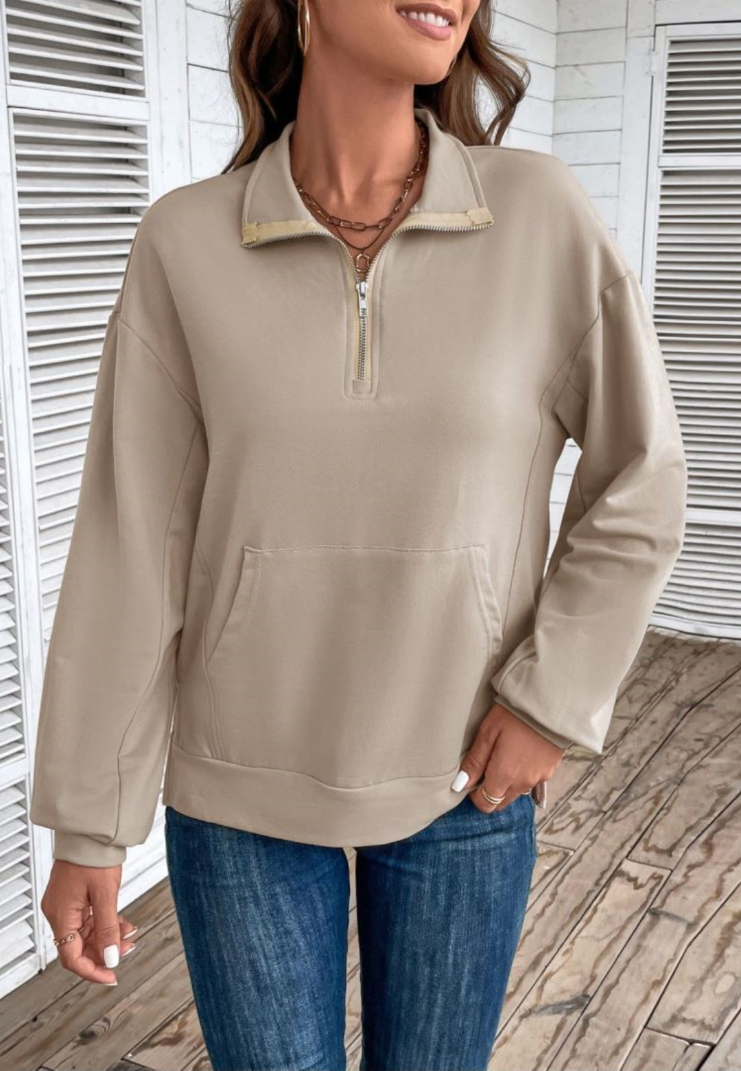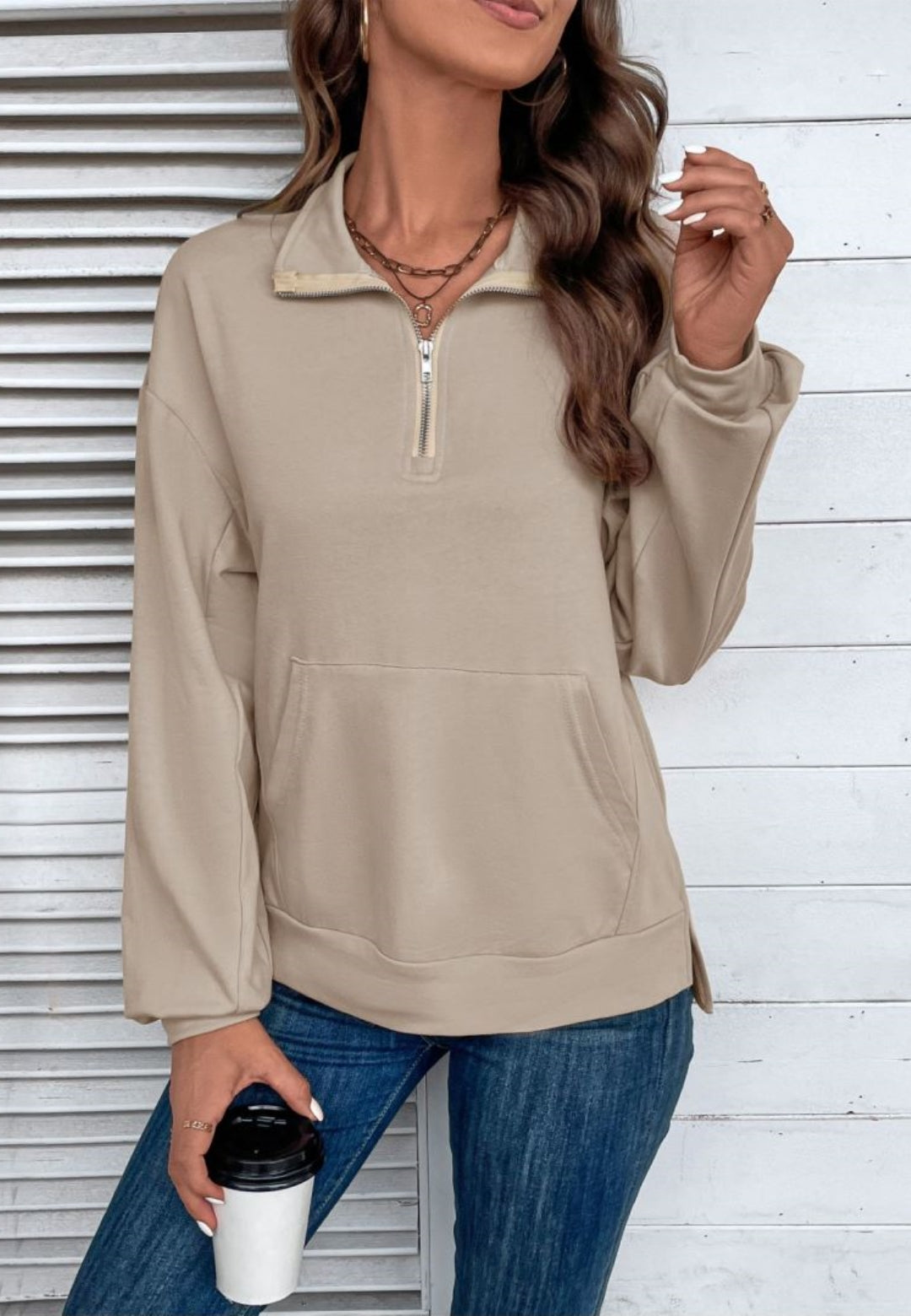 The sweater is detailed with a cool kangaroo pocket. Features a quarter zip neck line, drop shoulder, long sleeves, and loose fit. Pair it with jeans and sneakers for a classic look.