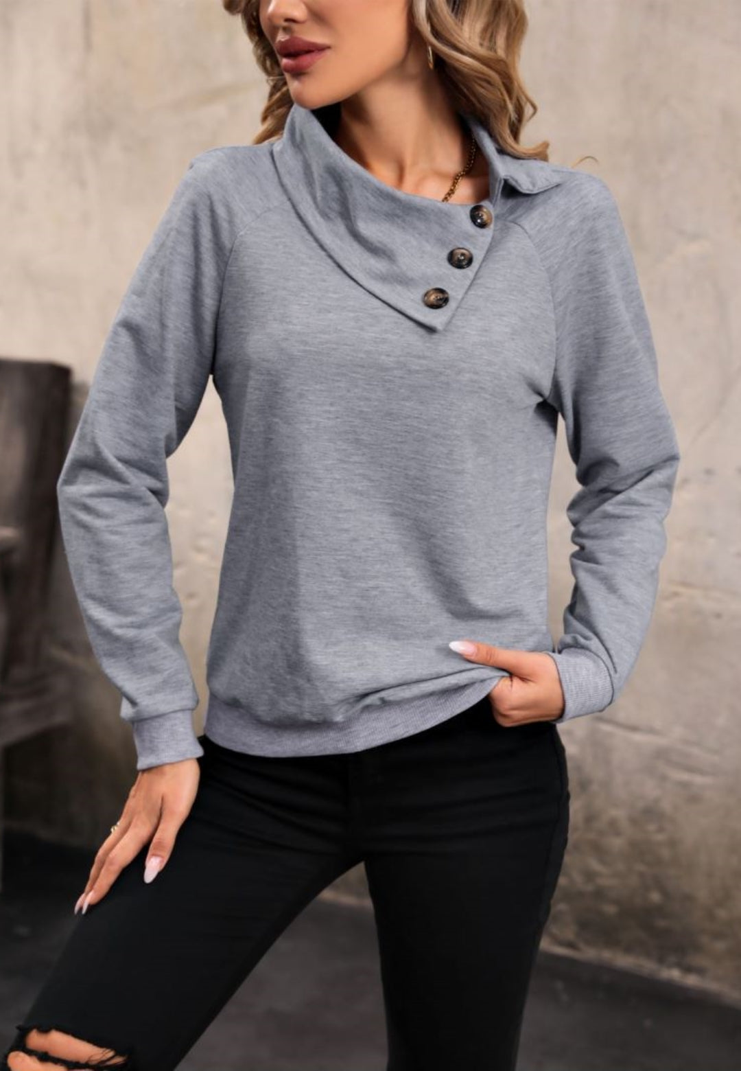 The sweater is detailed with a cool overlap button collar. Features solid color, long sleeves, and regular fit. Pair it with jeans and boots for a fantastic look.