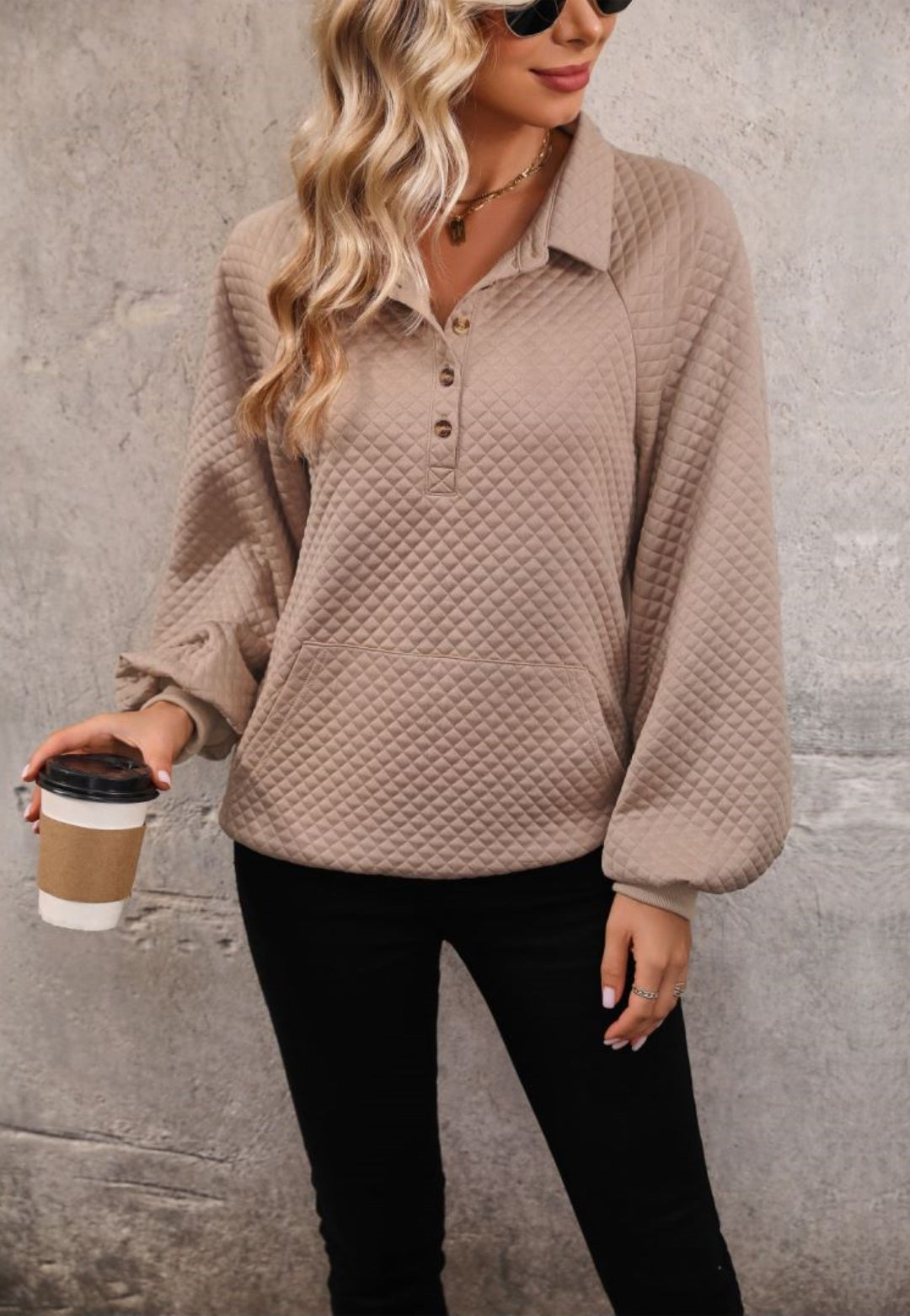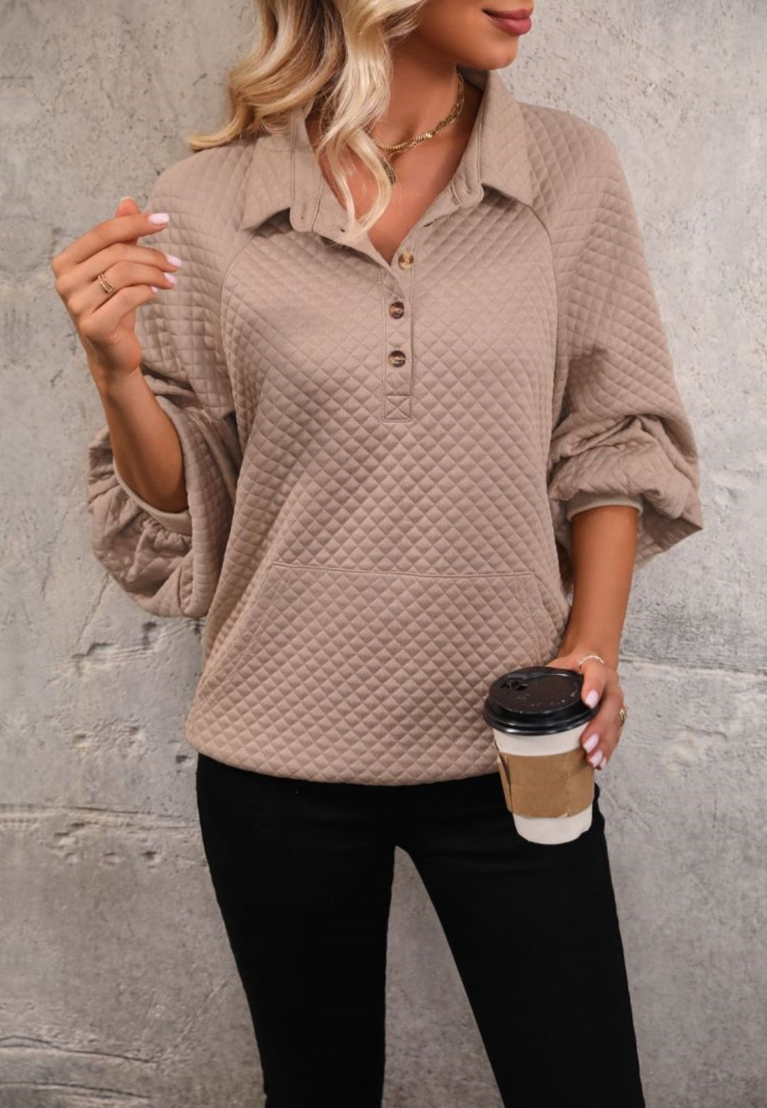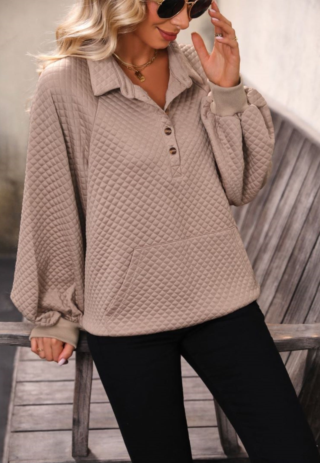 The sweater is detailed with a beautiful quilted knit material. Features solid color, collar, button detail, bishop sleeves, and loose fit. Pair it with leggings and boots for a fantastic look.