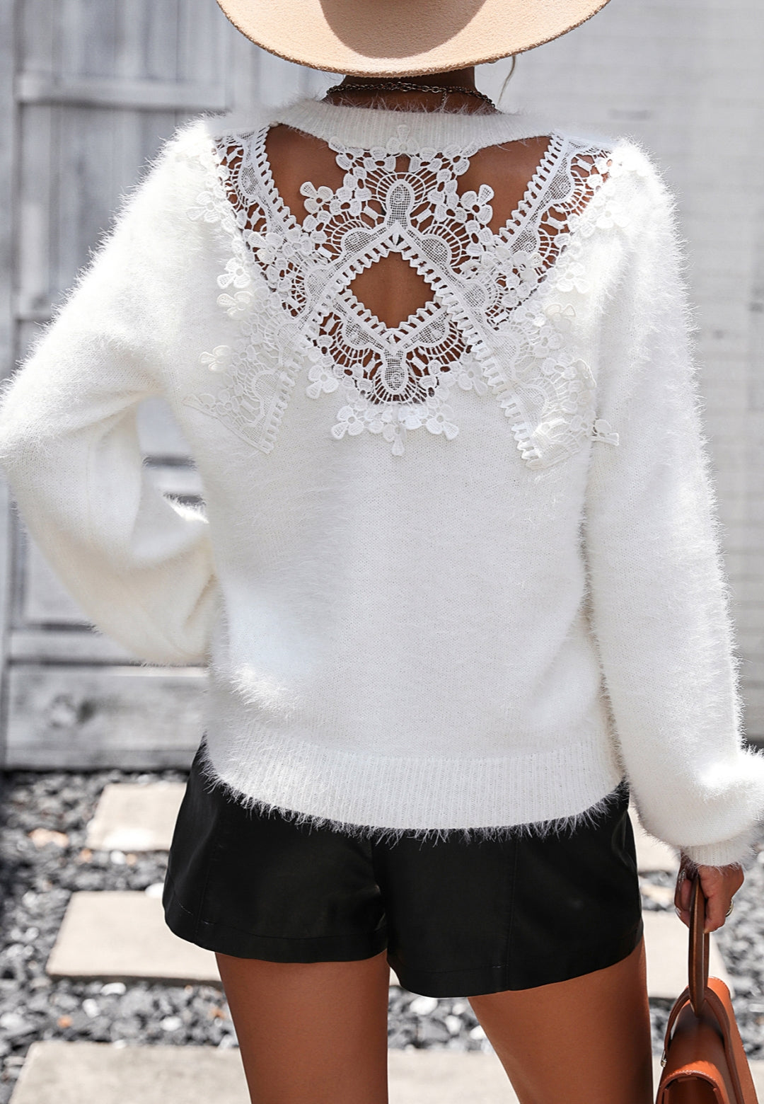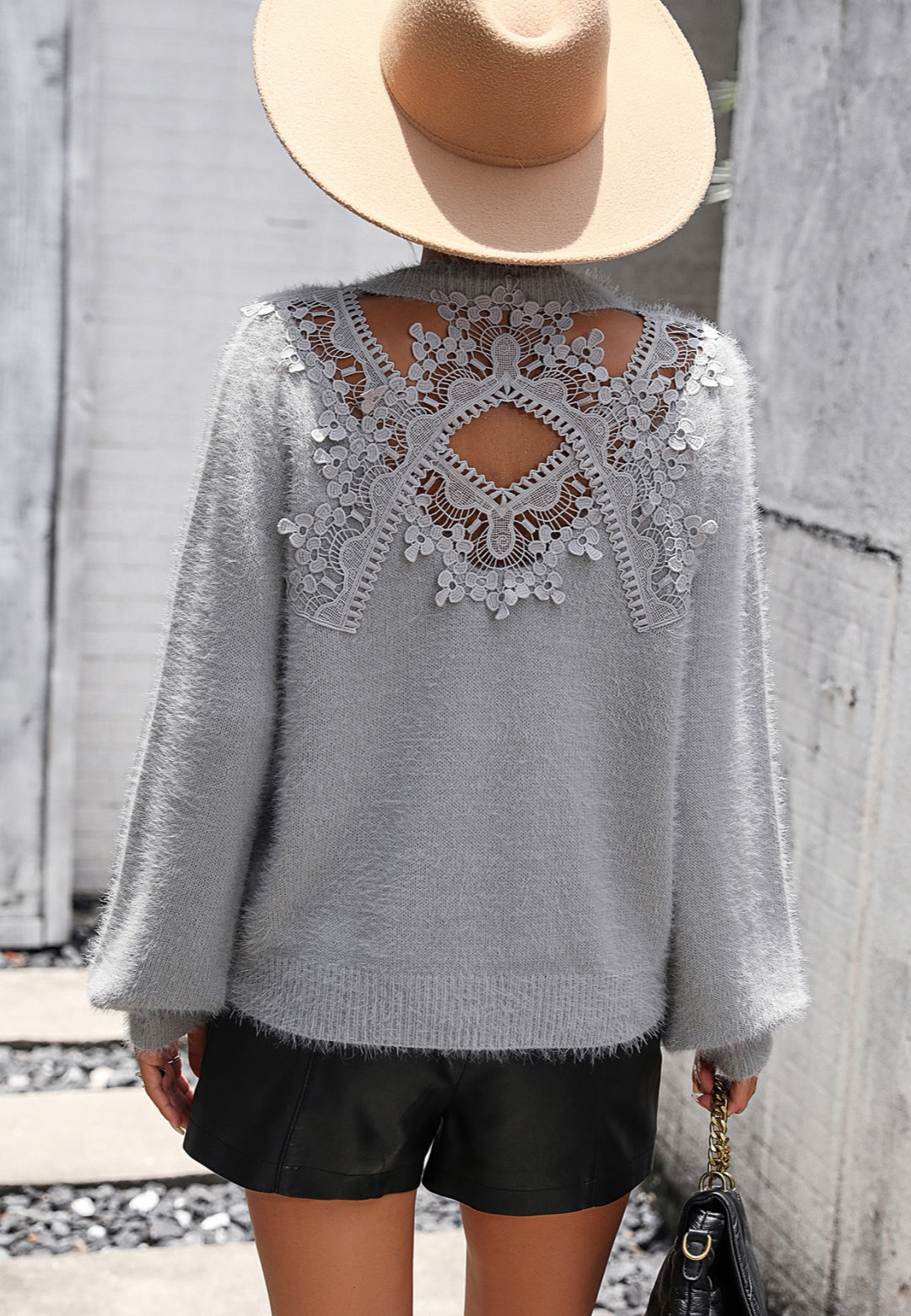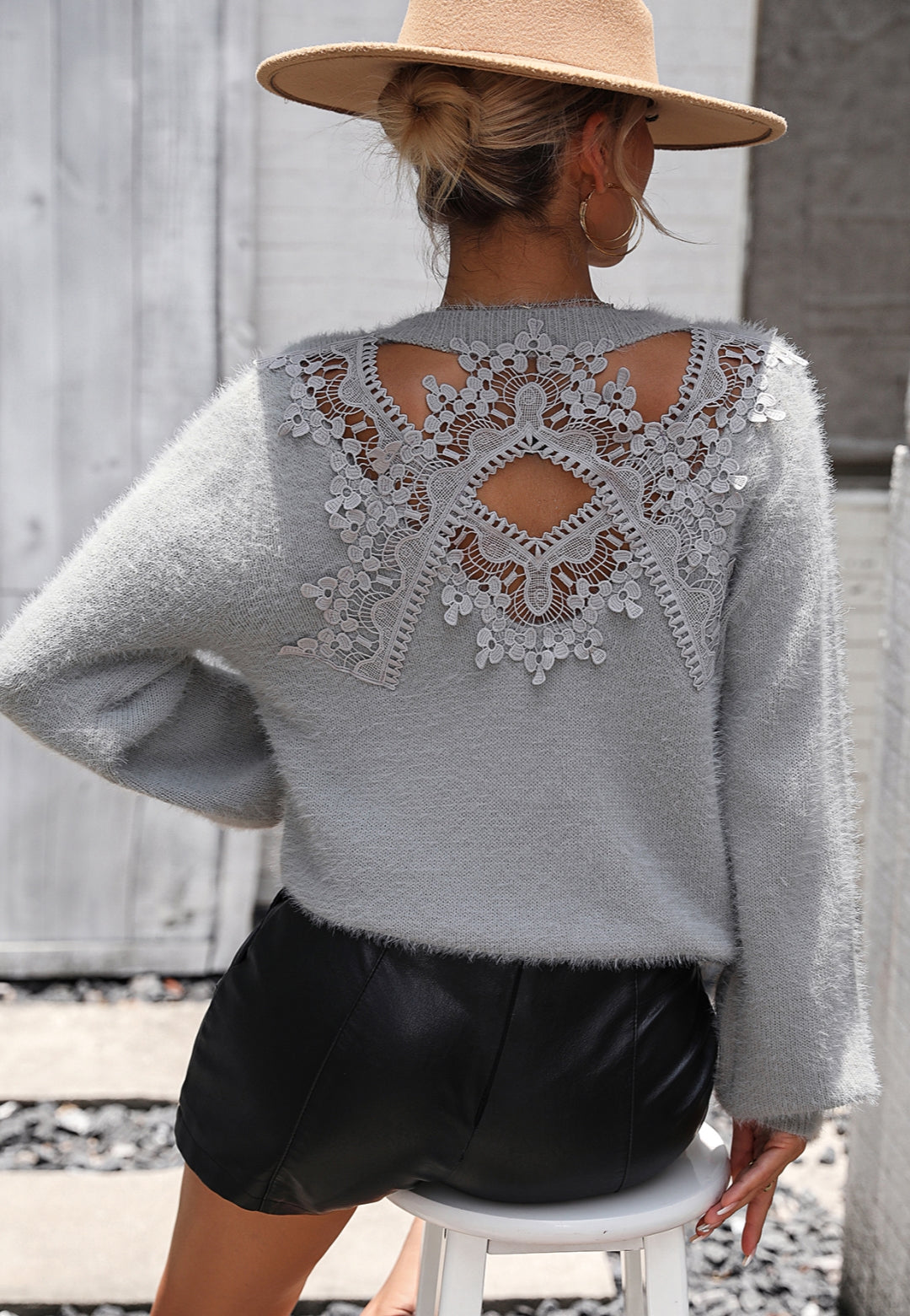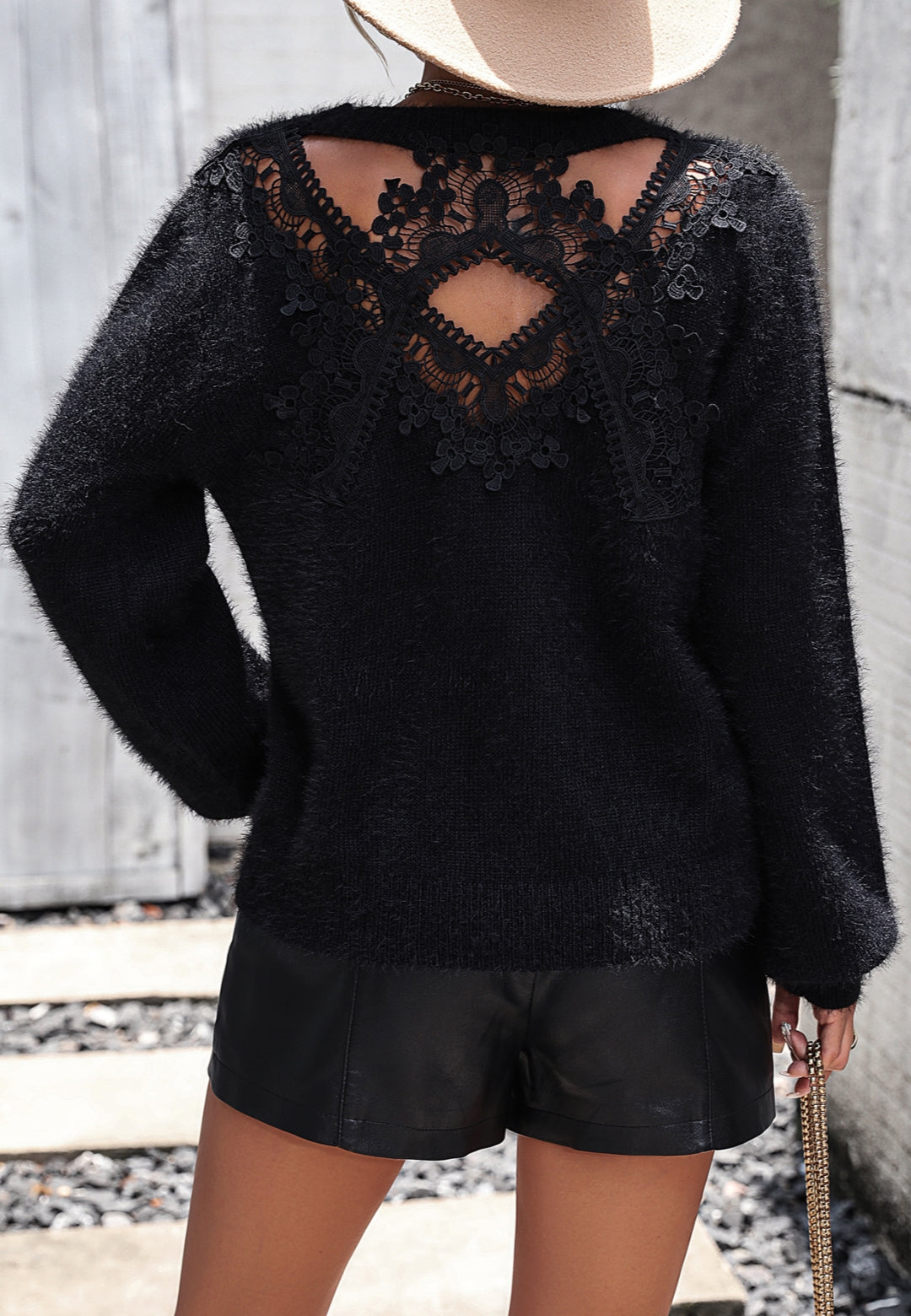 The sweater is detailed with a cute cutout lace back detail. Features solid color, fuzzy material, long sleeves, and regular fit. Pair it with leather pants and boots for a juxtaposing look.