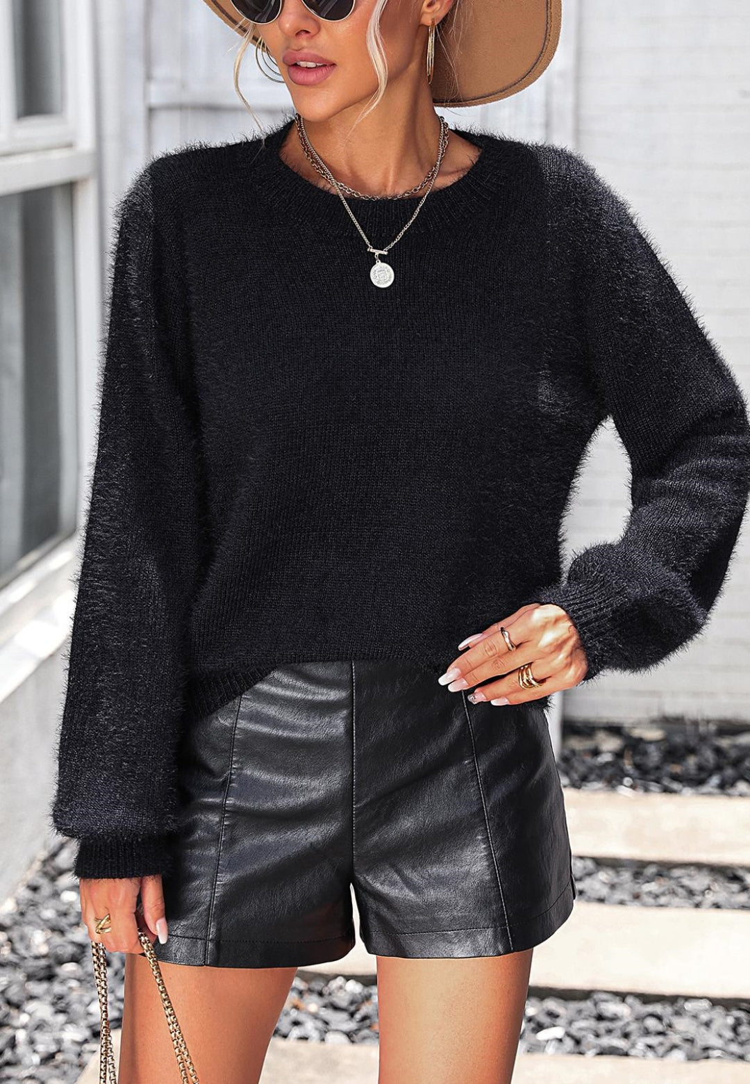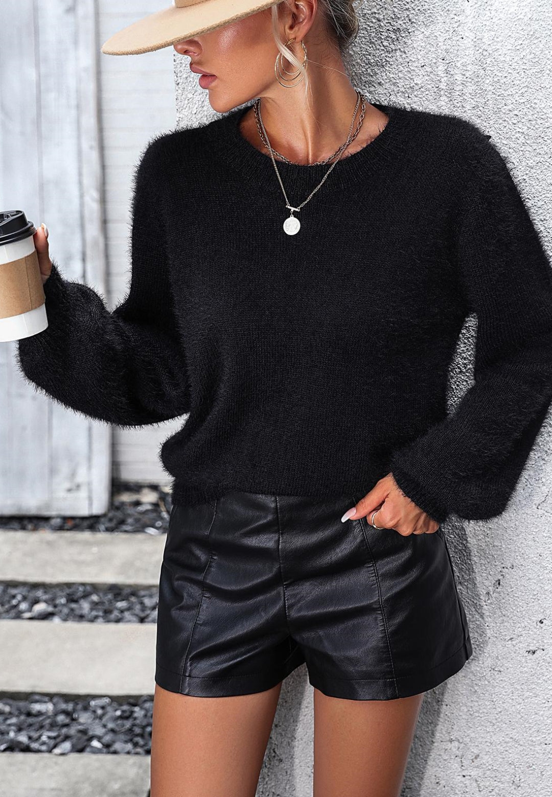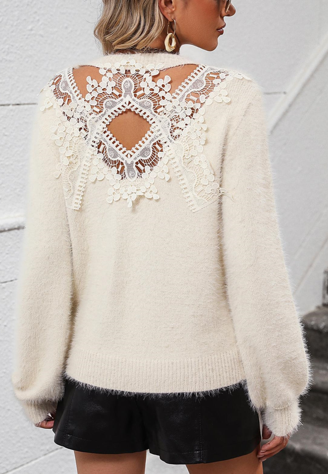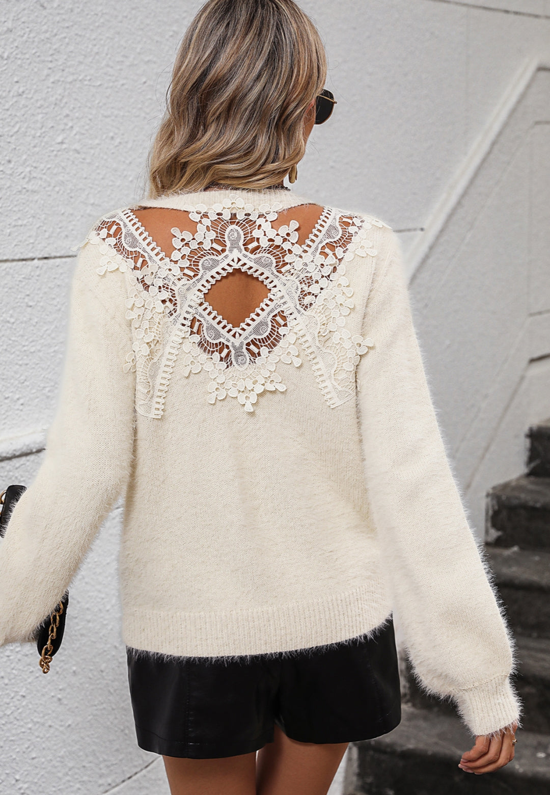The sweater is detailed with a cute cutout lace back detail. Features solid color, fuzzy material, long sleeves, and regular fit. Pair it with leather pants and boots for a juxtaposing look.