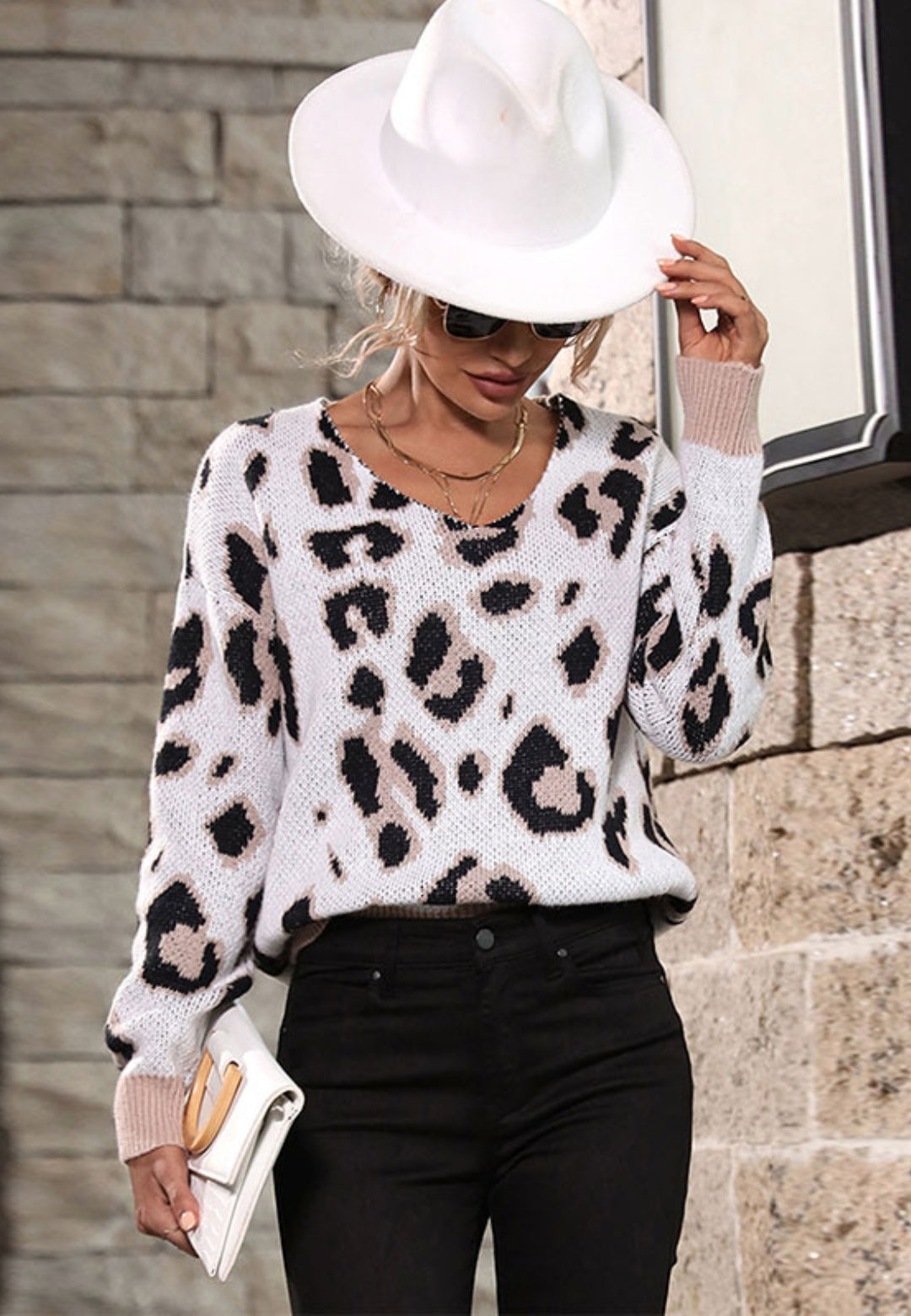 The sweater is detailed with a bold leopard print. Features a textured knit material, v neck line, drop shoulder, long sleeves, and loose fit. Pair it with jeans and sneakers for an easygoing look.