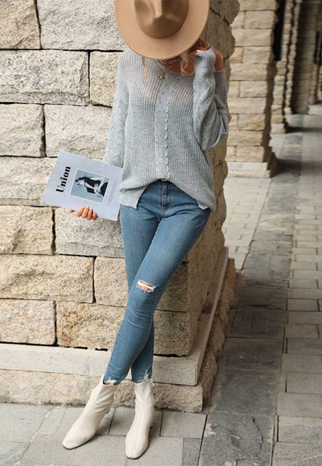 The sweater is detailed with a beautiful textured knit detailed design. Features a v neck line, drop shoulder, long sleeves, and loose fit. Pair it with jeans and boots for a laidback look.