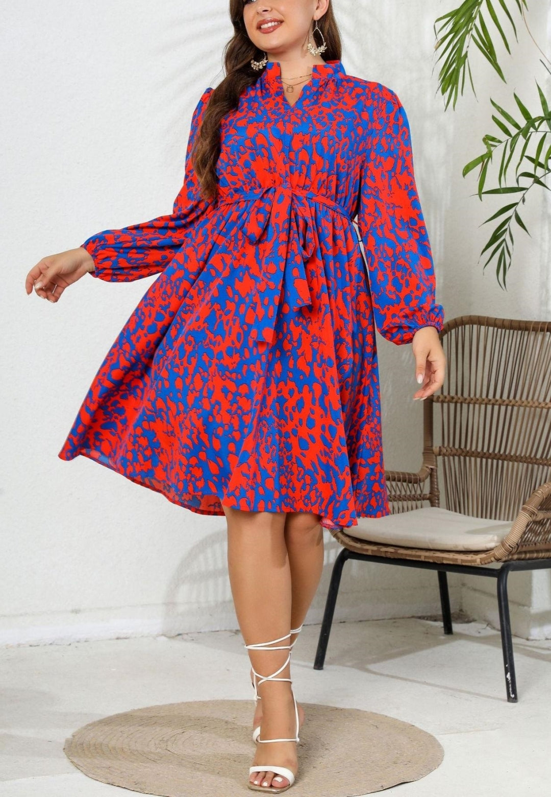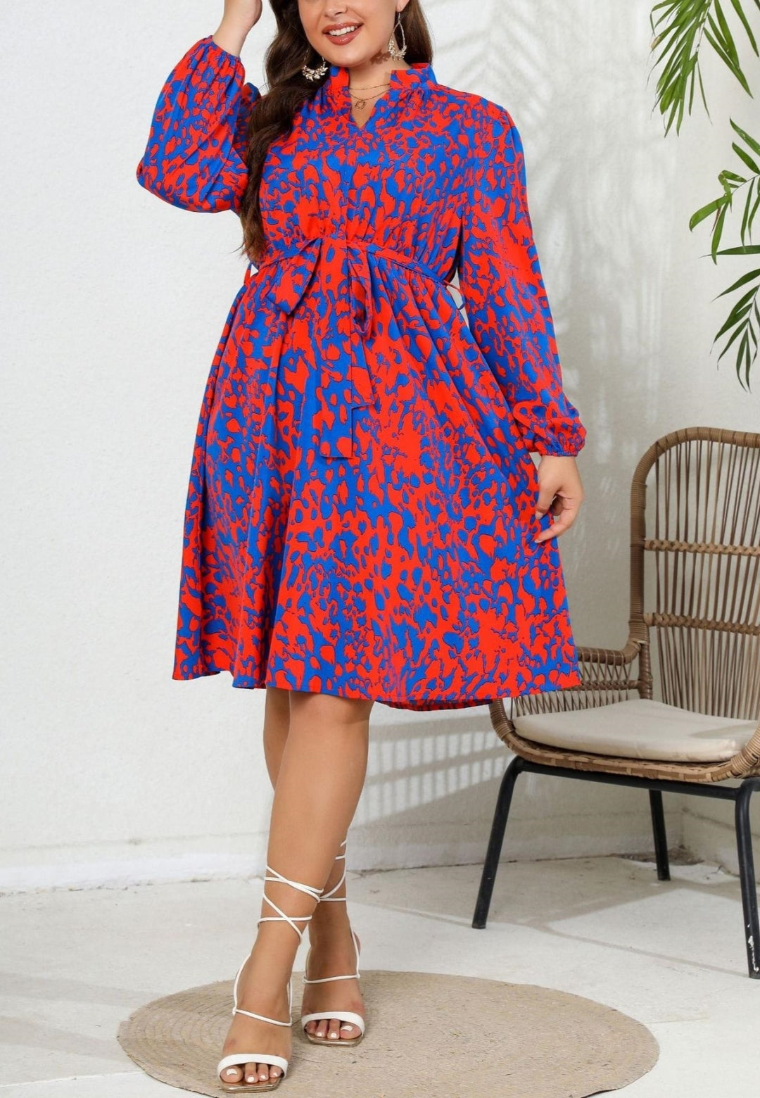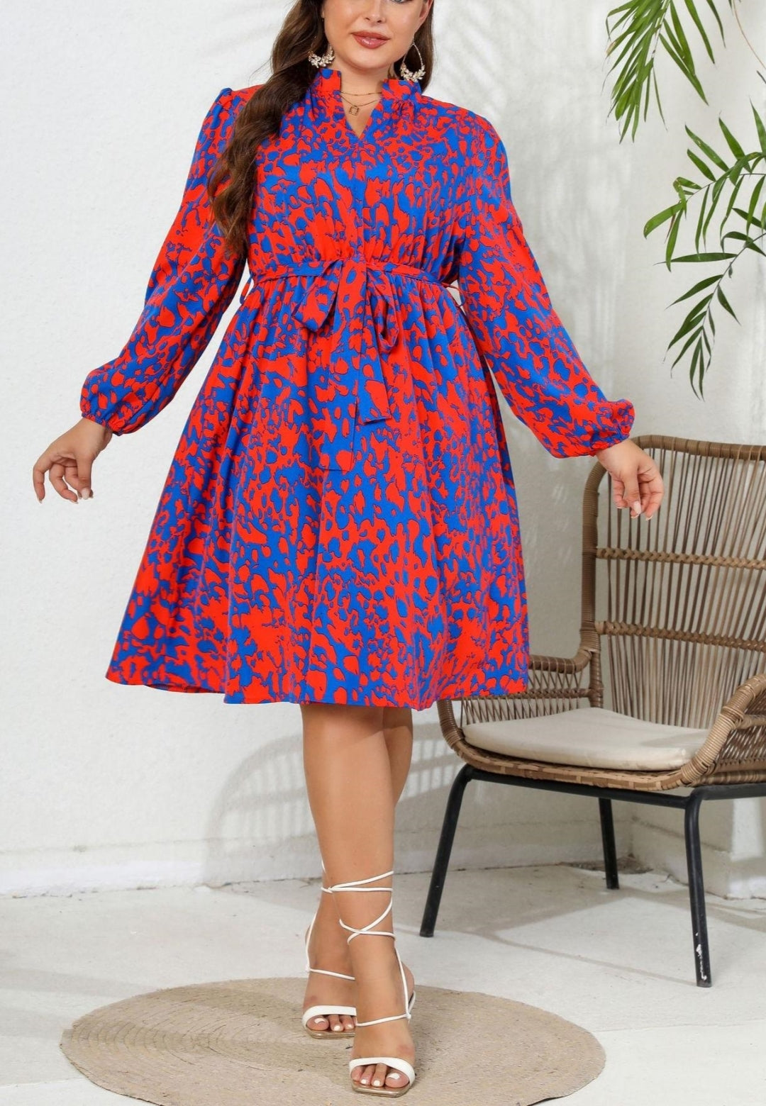 The plus size dress is detailed with a funky abstract print. Features a collar, long sleeves, tie waist detail, and knee length. Pair it with a handbag and heels for a beautiful look.