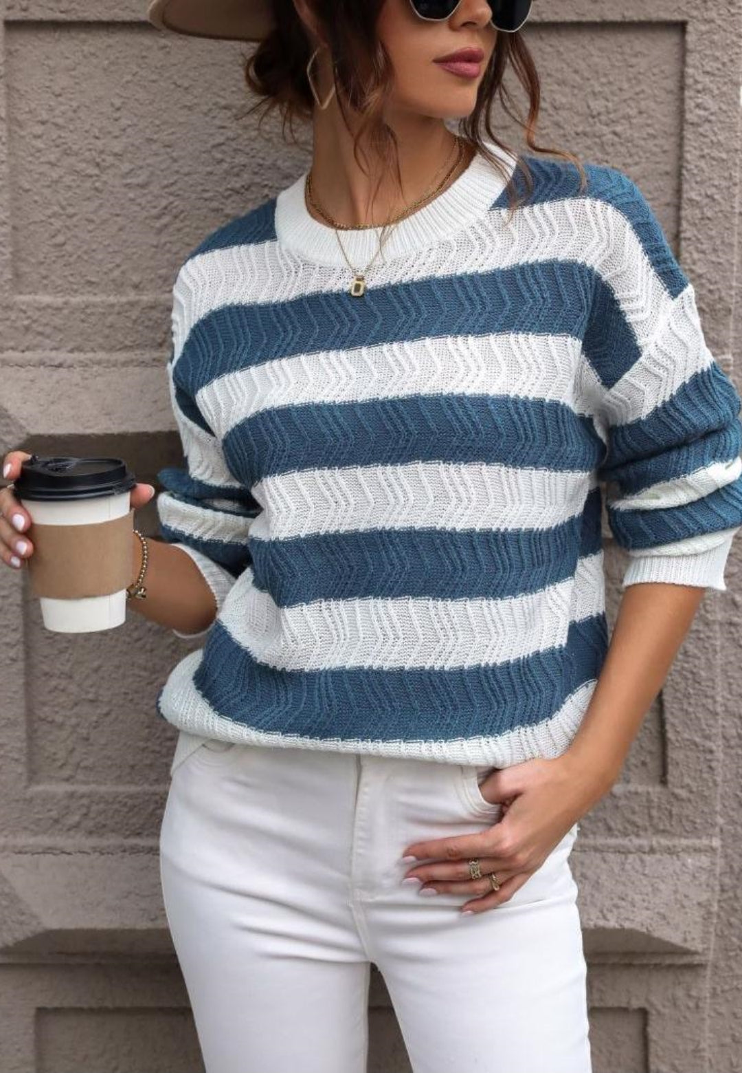 The sweater is detailed with a cozy textured knit material. Features a striped pattern, round neck line, drop shoulder, long sleeves, and regular fit. Pair it with jeans and sneakers for a laidback look.