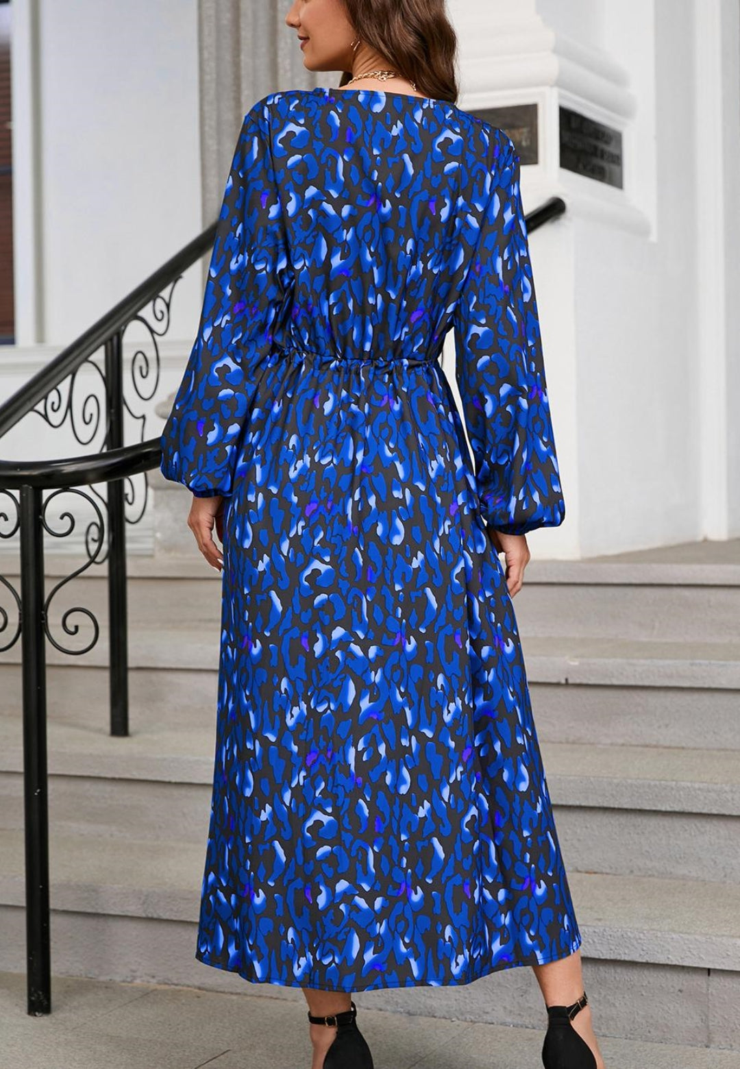 The dress is detailed with an edgy leopard print. Features a surplice neck line, long sleeves, front slit, and above ankle length. Pair it with sunnies and sandals for a fabulous look.