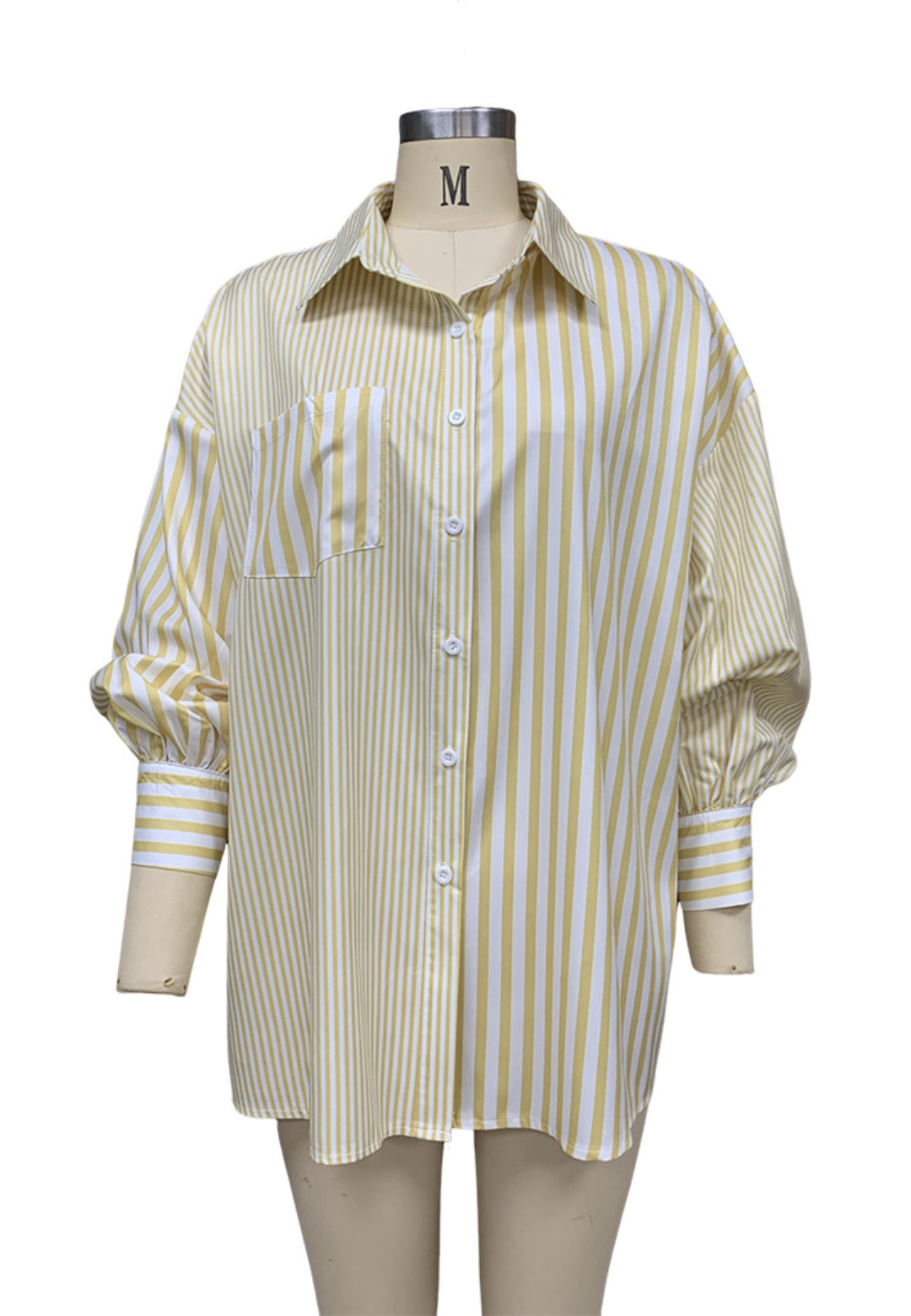 The shirt is detailed with a funky multi striped print. Features a collar, button down closure, drop shoulder, three quarter sleeves, and loose fit. Pair it with trousers and heels for a classic look.
