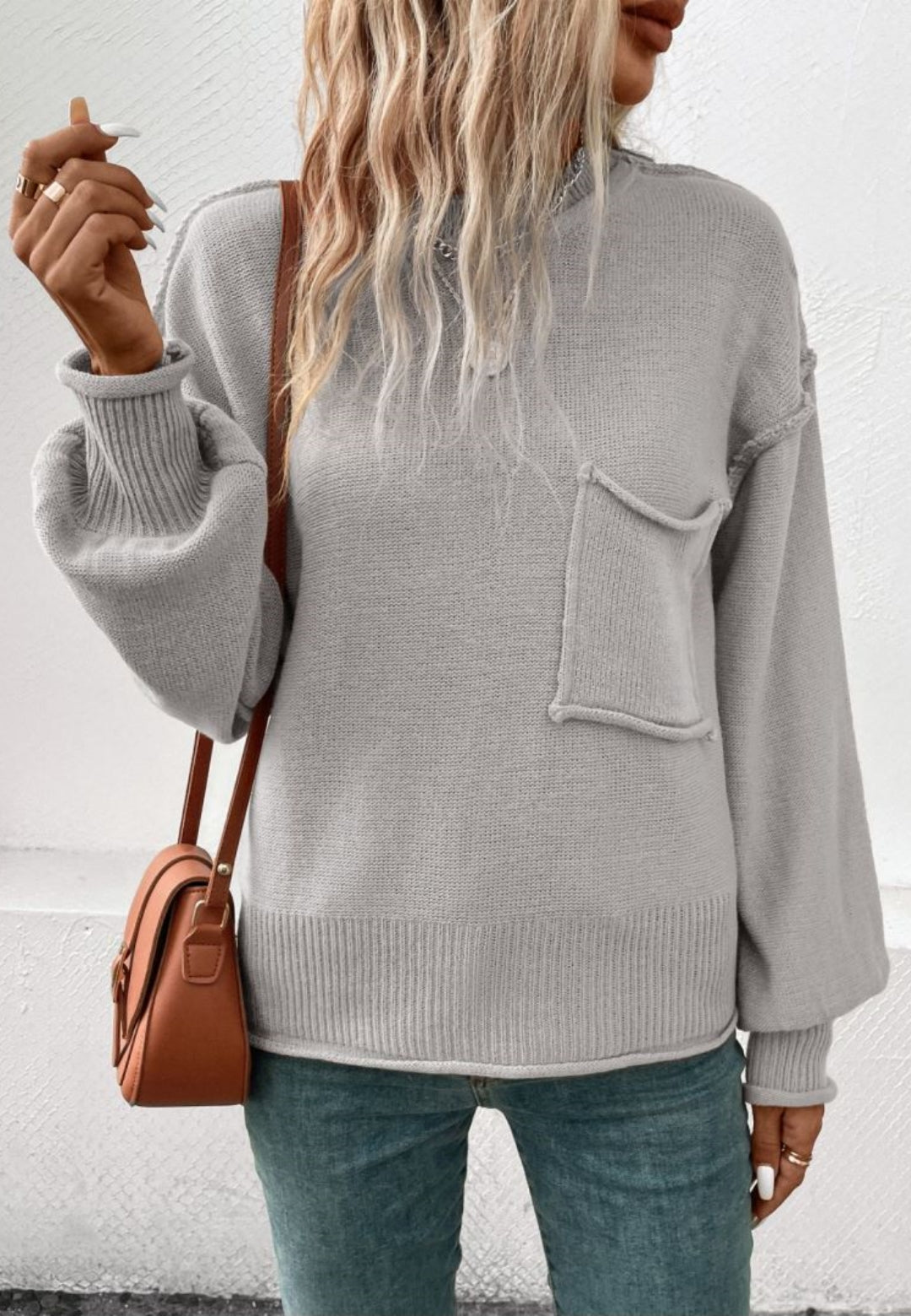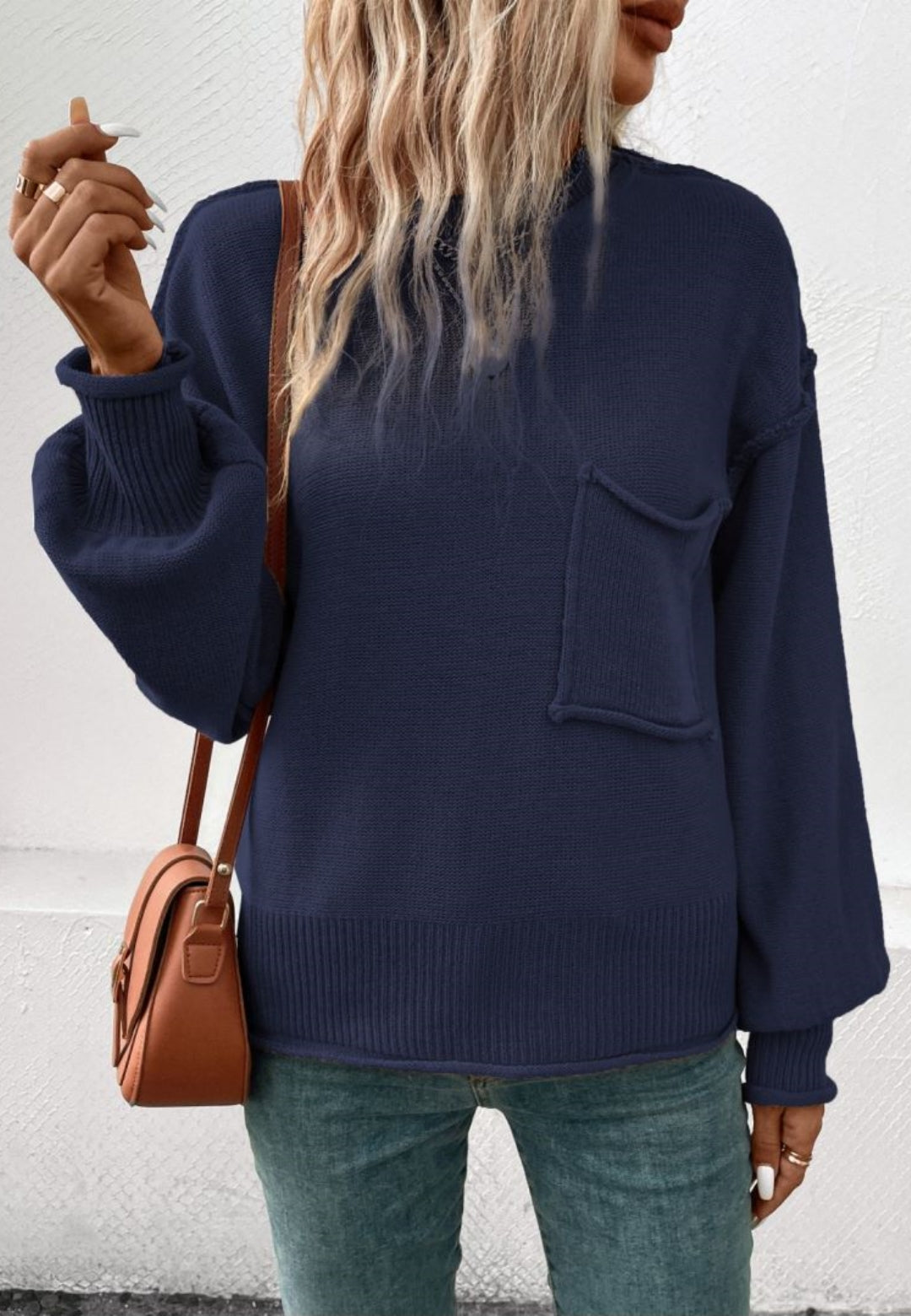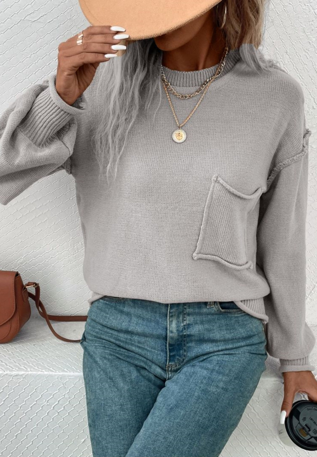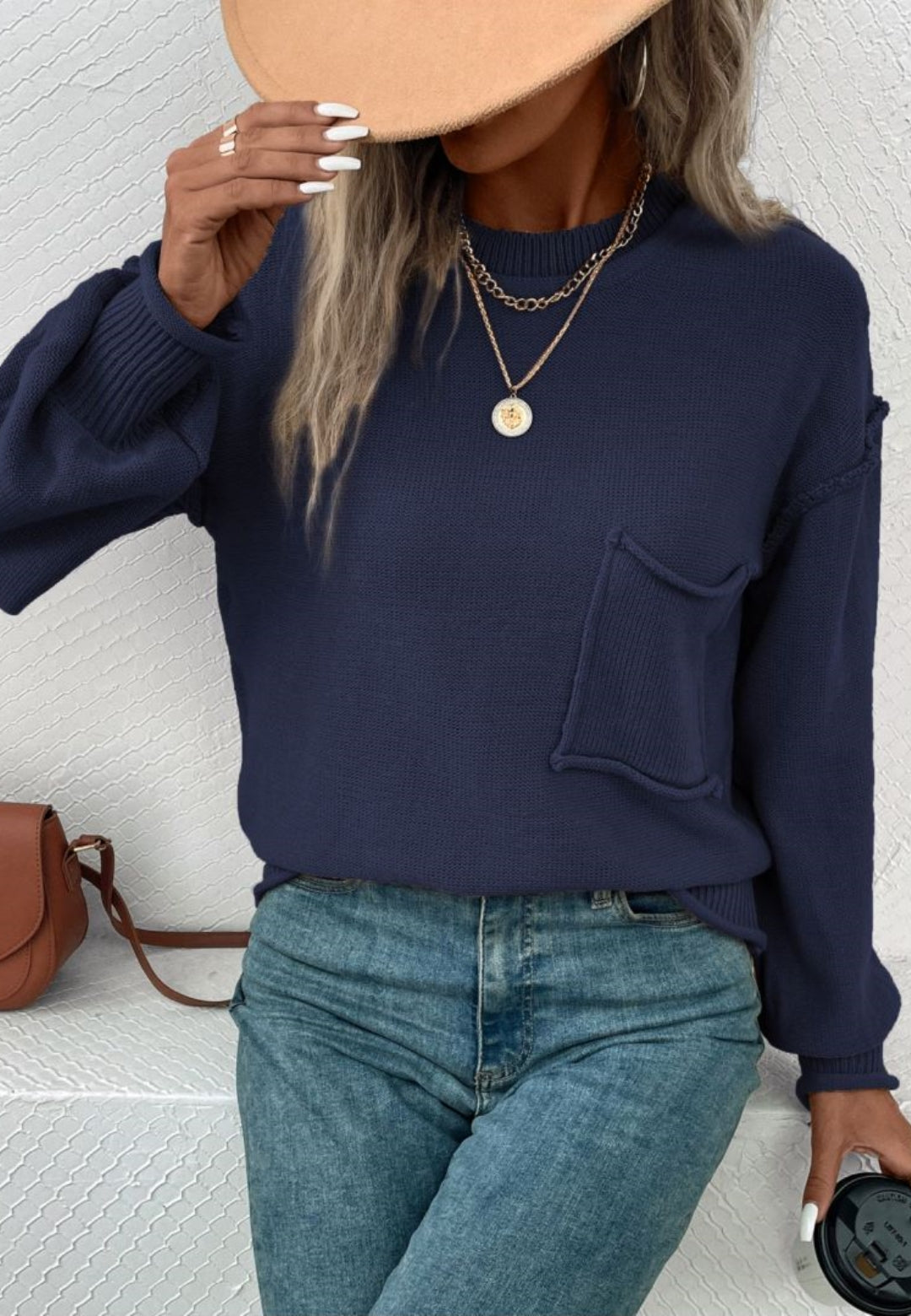The sweater is detailed with a cozy textured knit material. Features a round neck line, drop shoulder, patch pocket, long sleeves, and loose fit. Pair it with leggings and boots for an easygoing look.