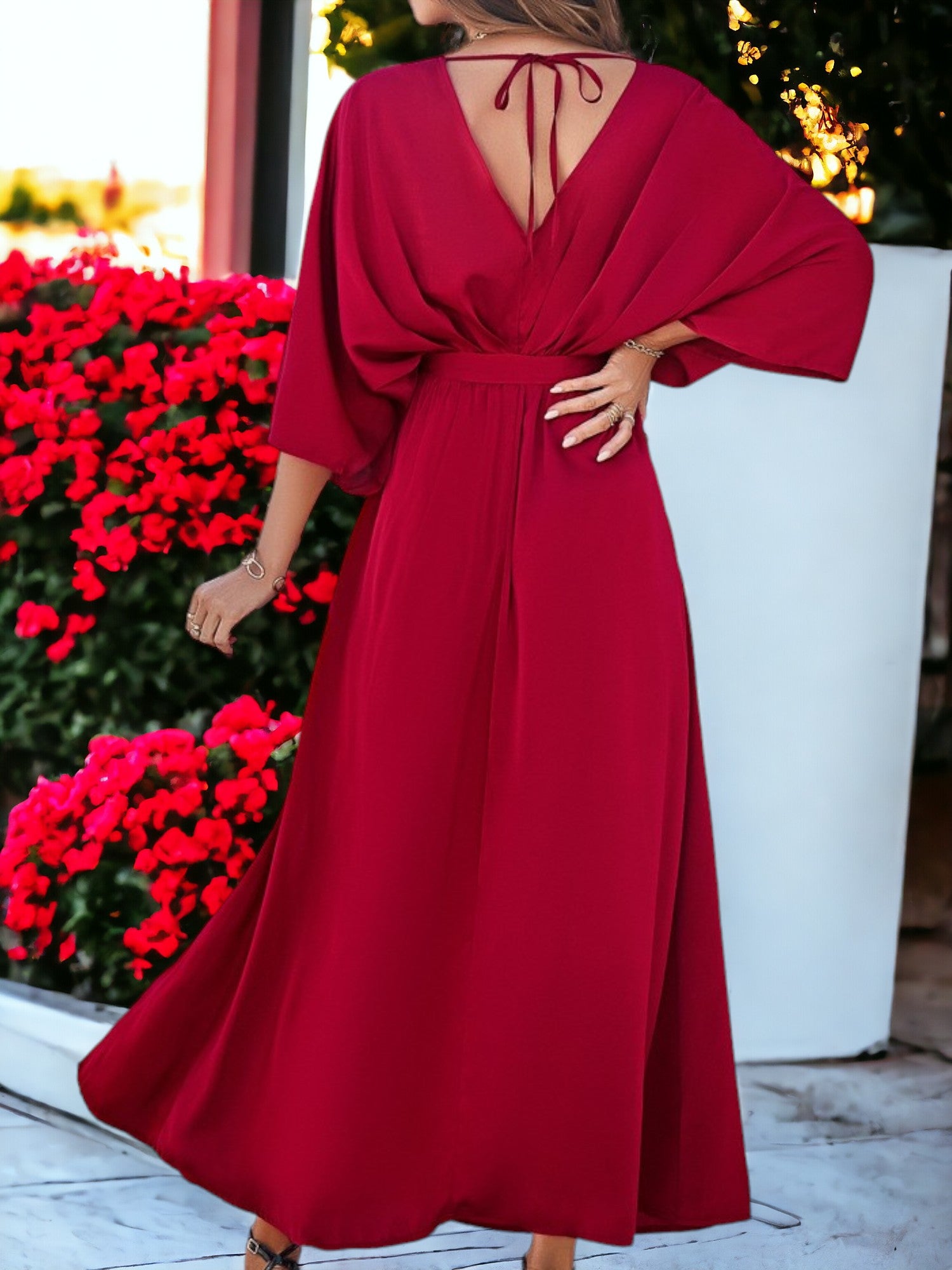 Women's Elegant V-Neck High Waisted Tie Loose Long Split Maxi Dress