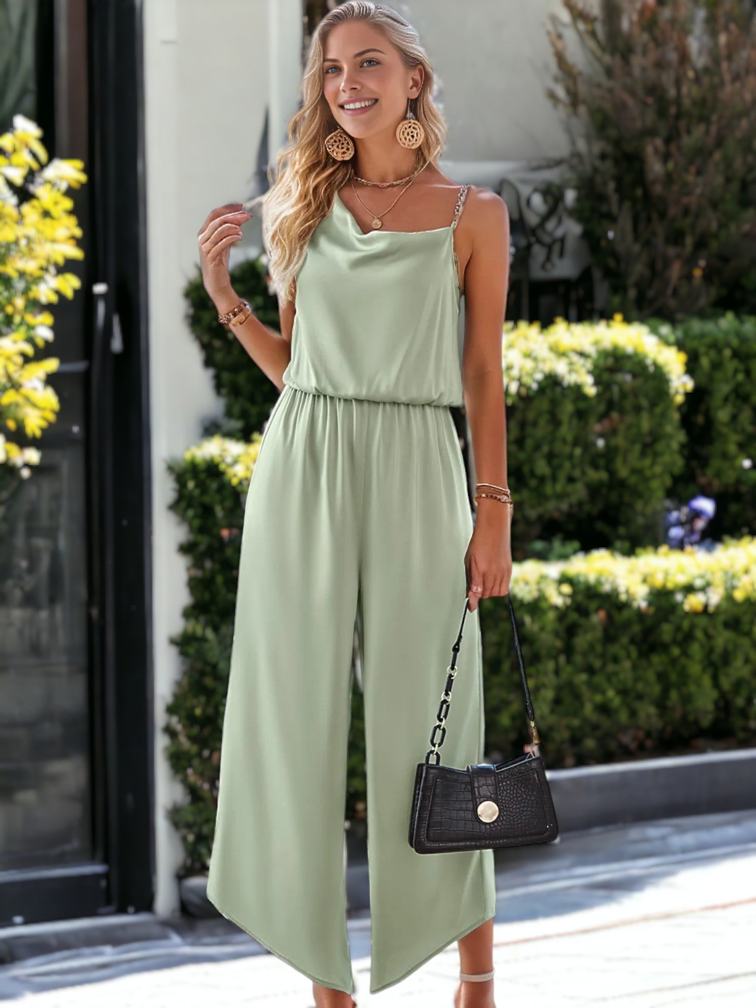 Asymmetric Shoulder Strap Draped Flared Leg Jumpsuit