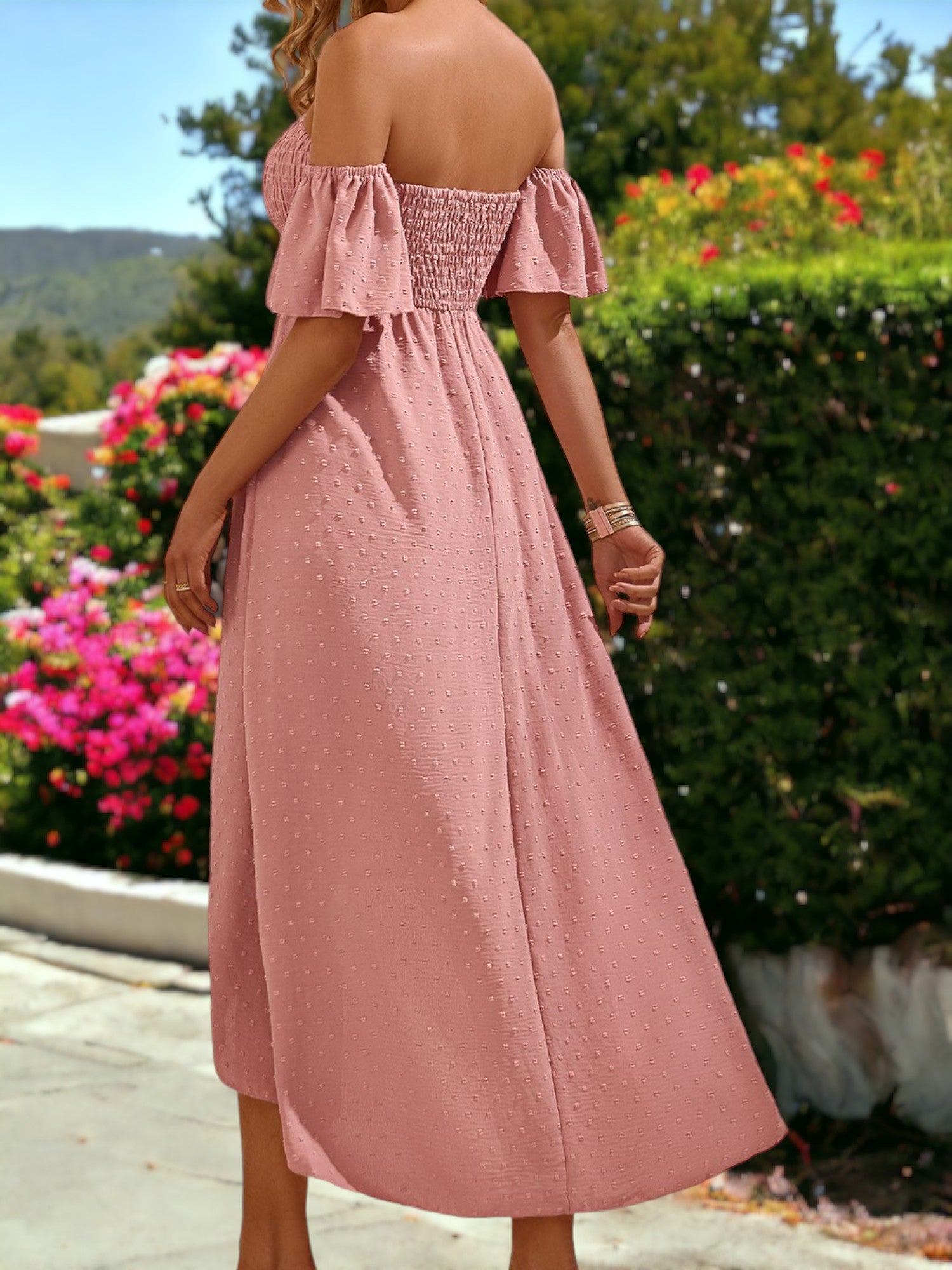 Step into effortless elegance with our Off Shoulder Smock Wrap Skirt Style Dress. This stunning dress features a flattering off-shoulder neckline and a smocked bodice that hugs your curves comfortably. The wrap skirt style adds a touch of sophistication and allows for easy movement, making it perfect for both casual outings and special occasions. Embrace the blend of style and comfort with this versatile dress, a must-have addition to your fashion-forward wardrobe.