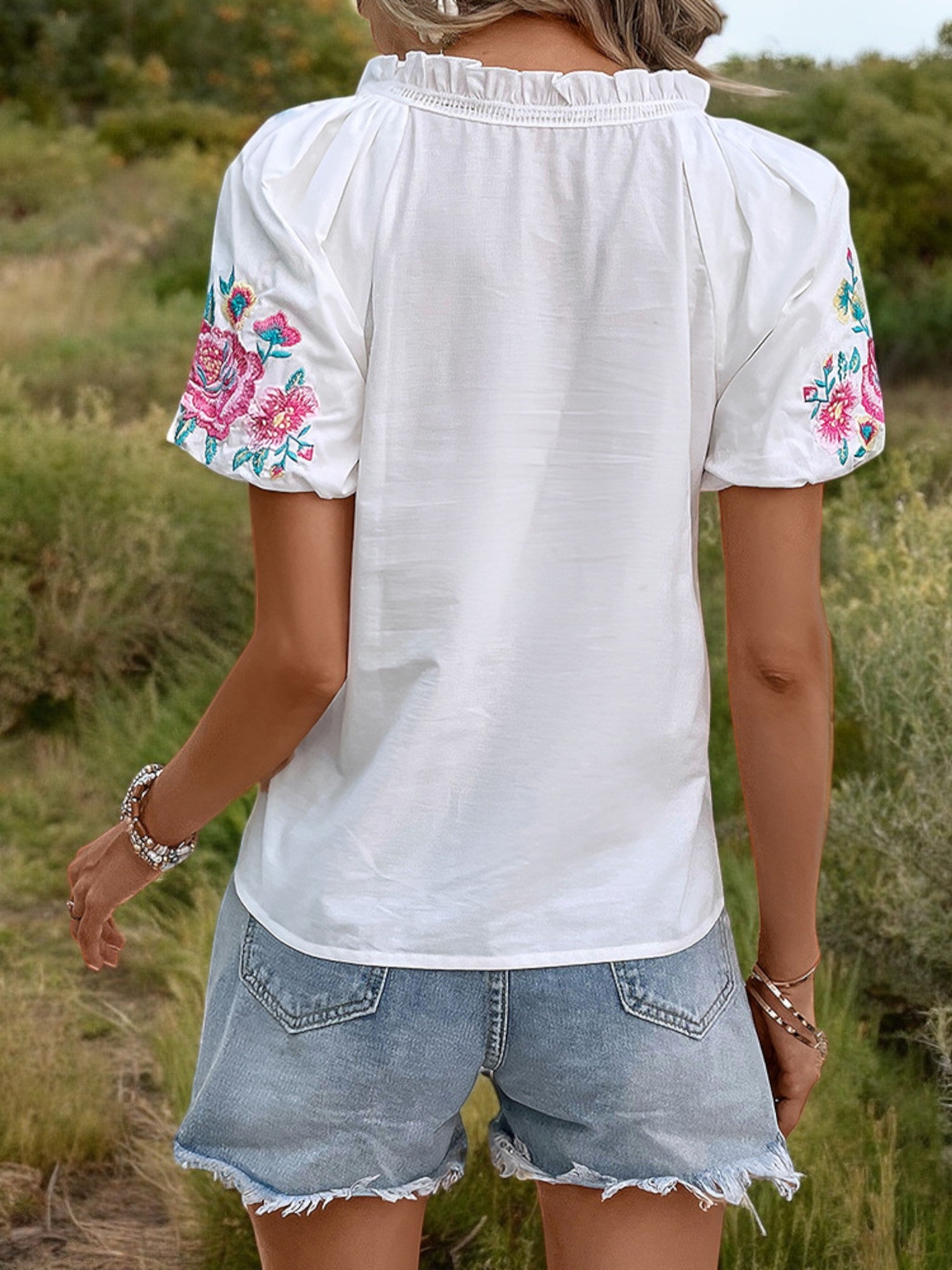 Anna-Kaci Women's V-Neck Embroidered Puff Sleeve Top