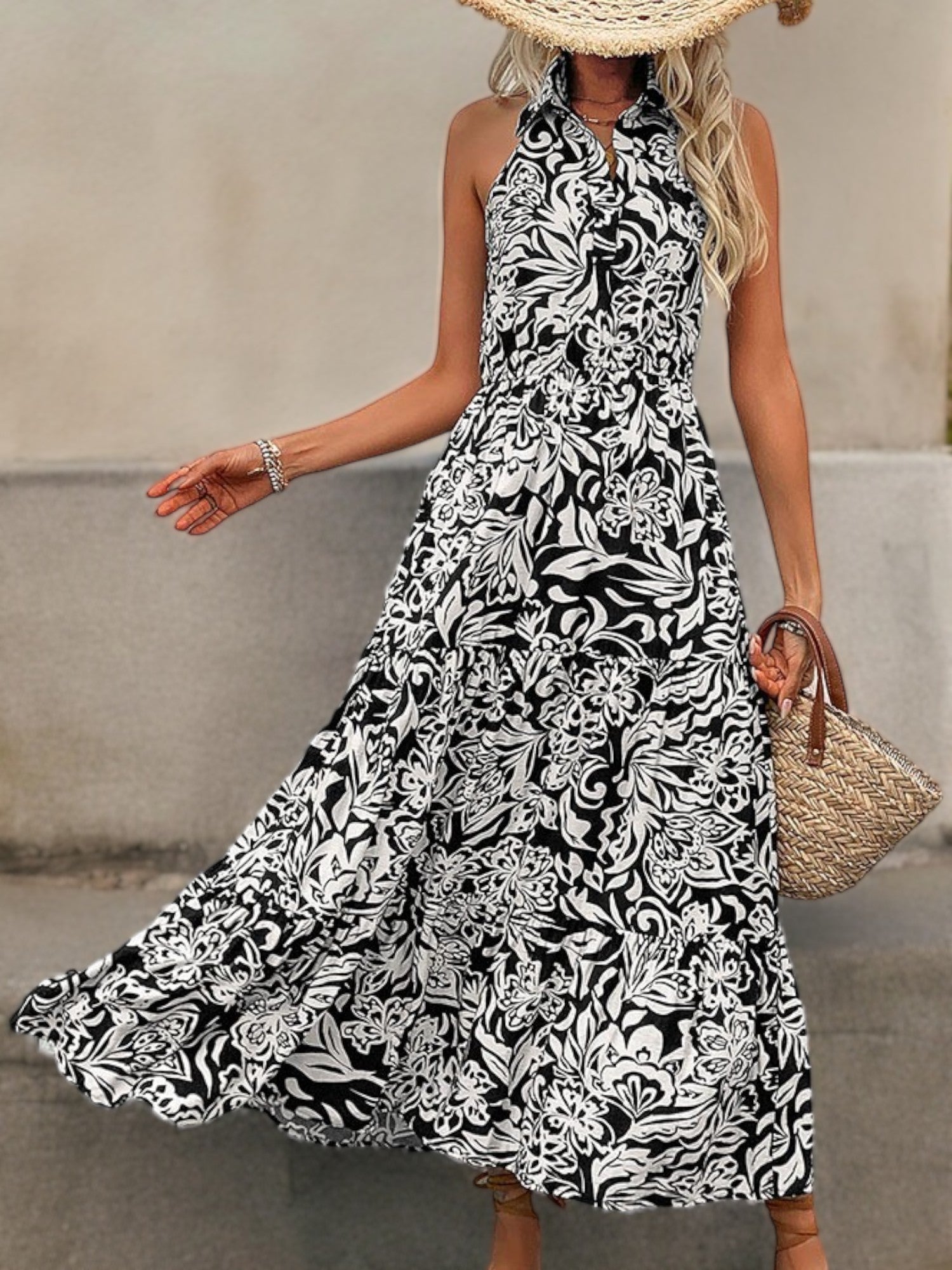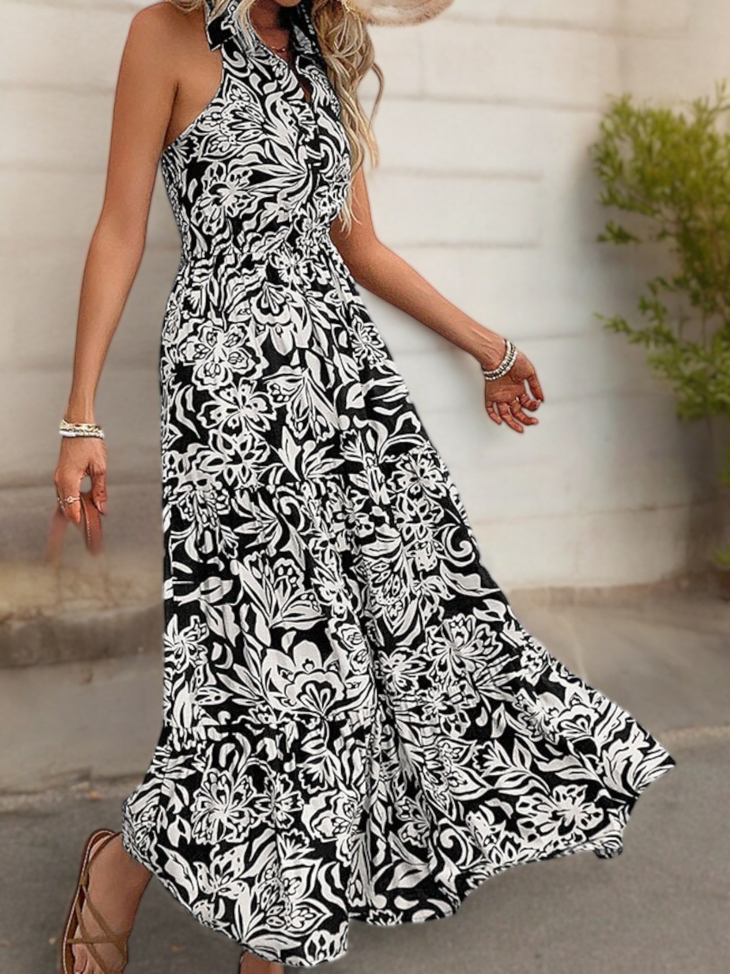 Halter Neck Maxi Dress with Black and White Floral Print