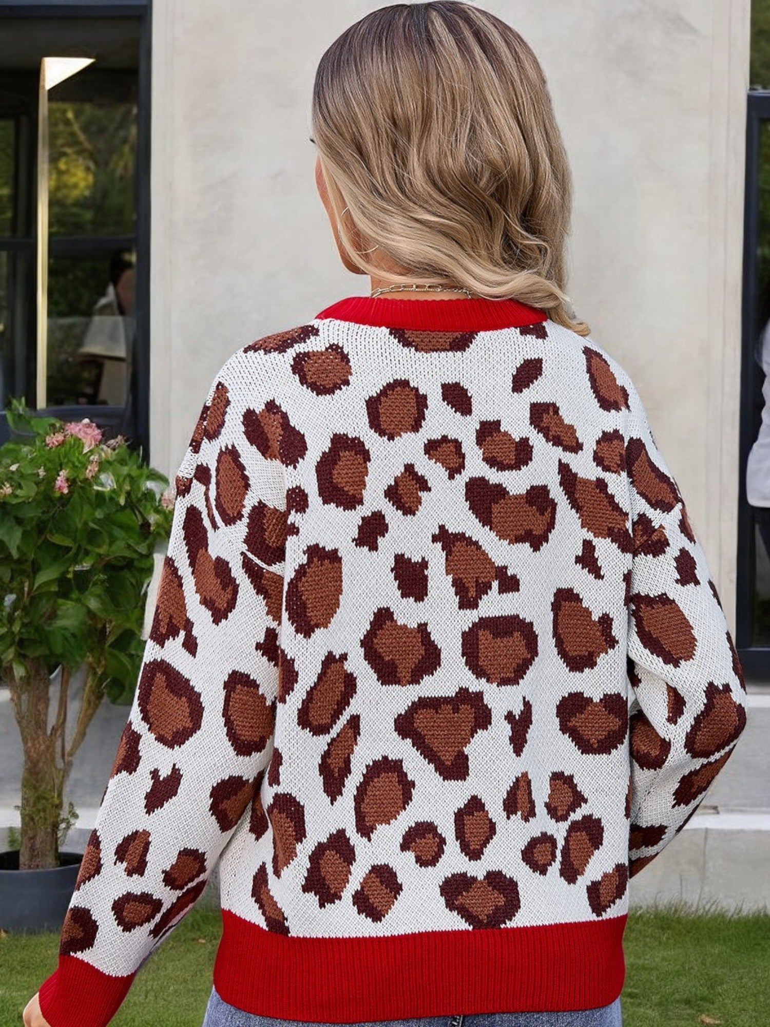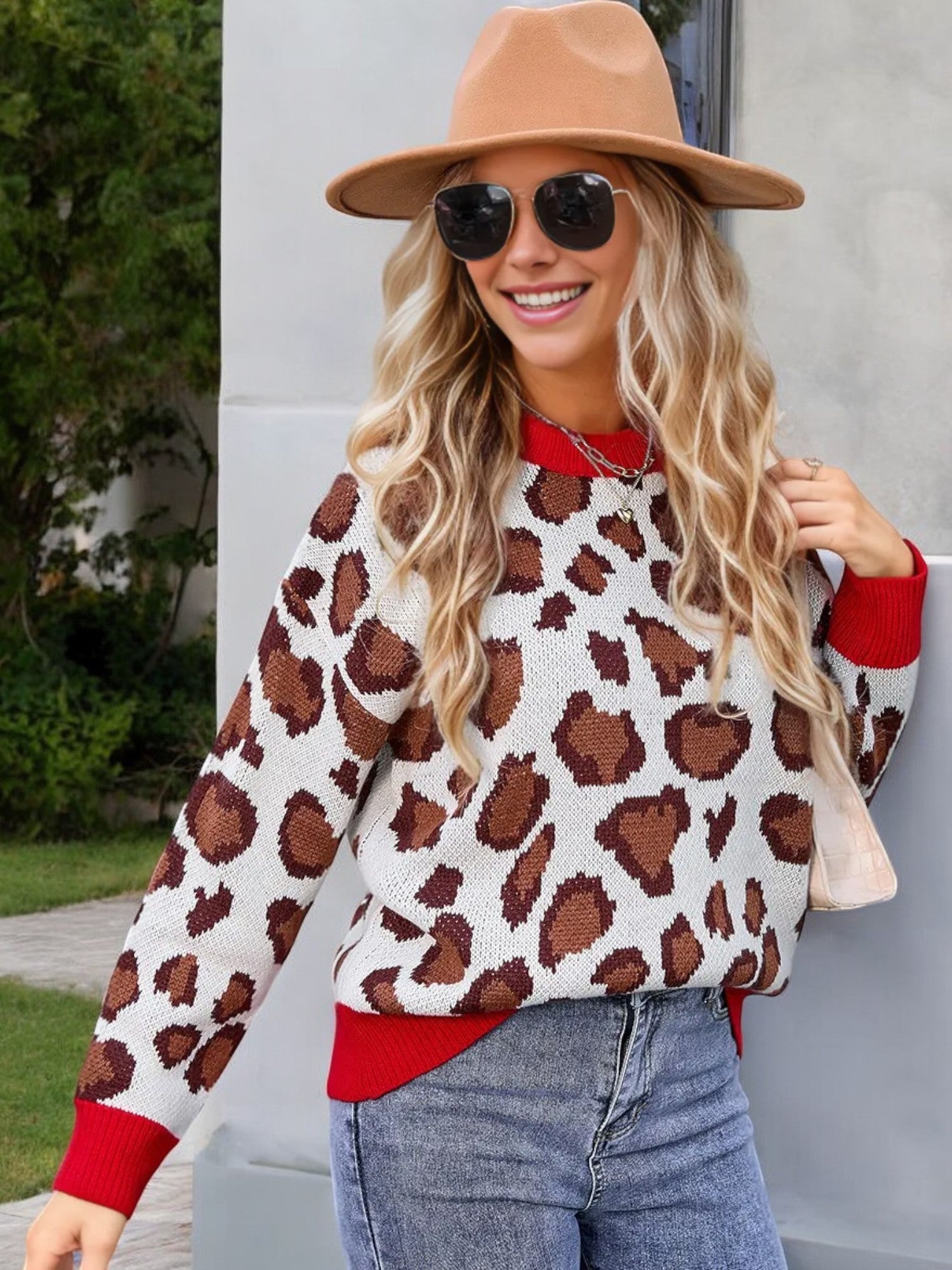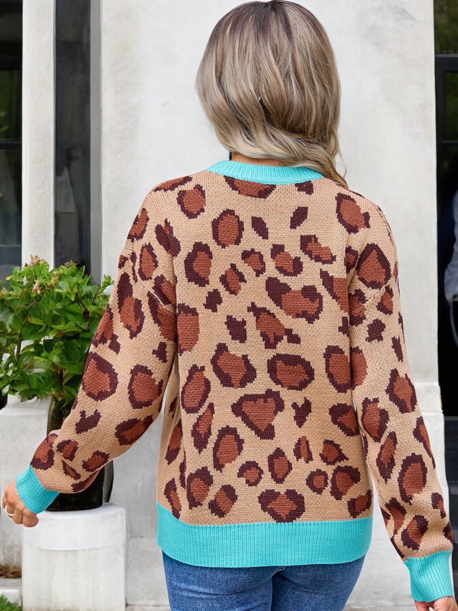 Anna-Kaci Women's Long Sleeve Leopard Print Knit Sweater with Contrast Trim