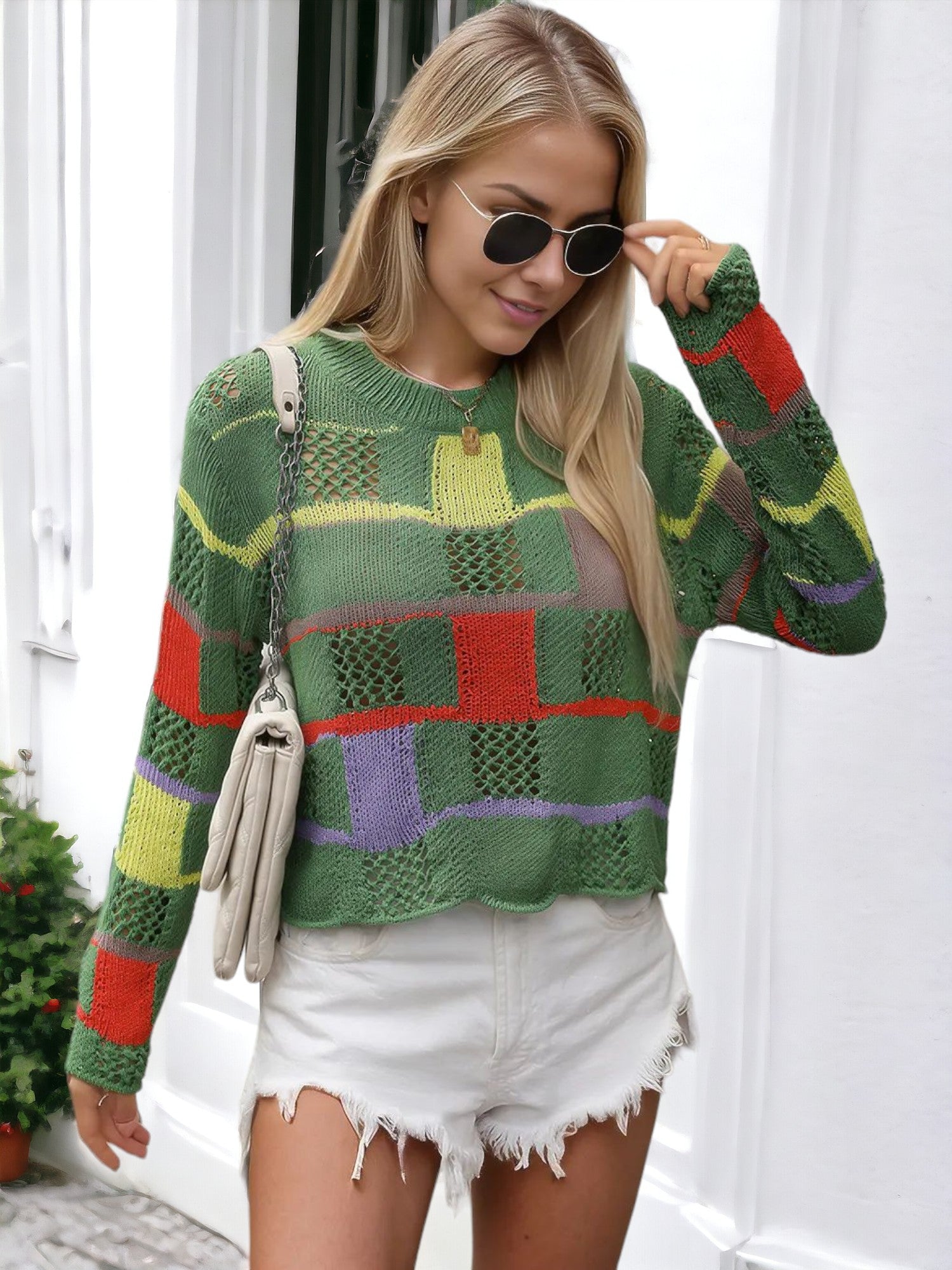 Anna-Kaci Women's Patchwork Knit Sweater with Colorful Geometric Design and Cropped Hem