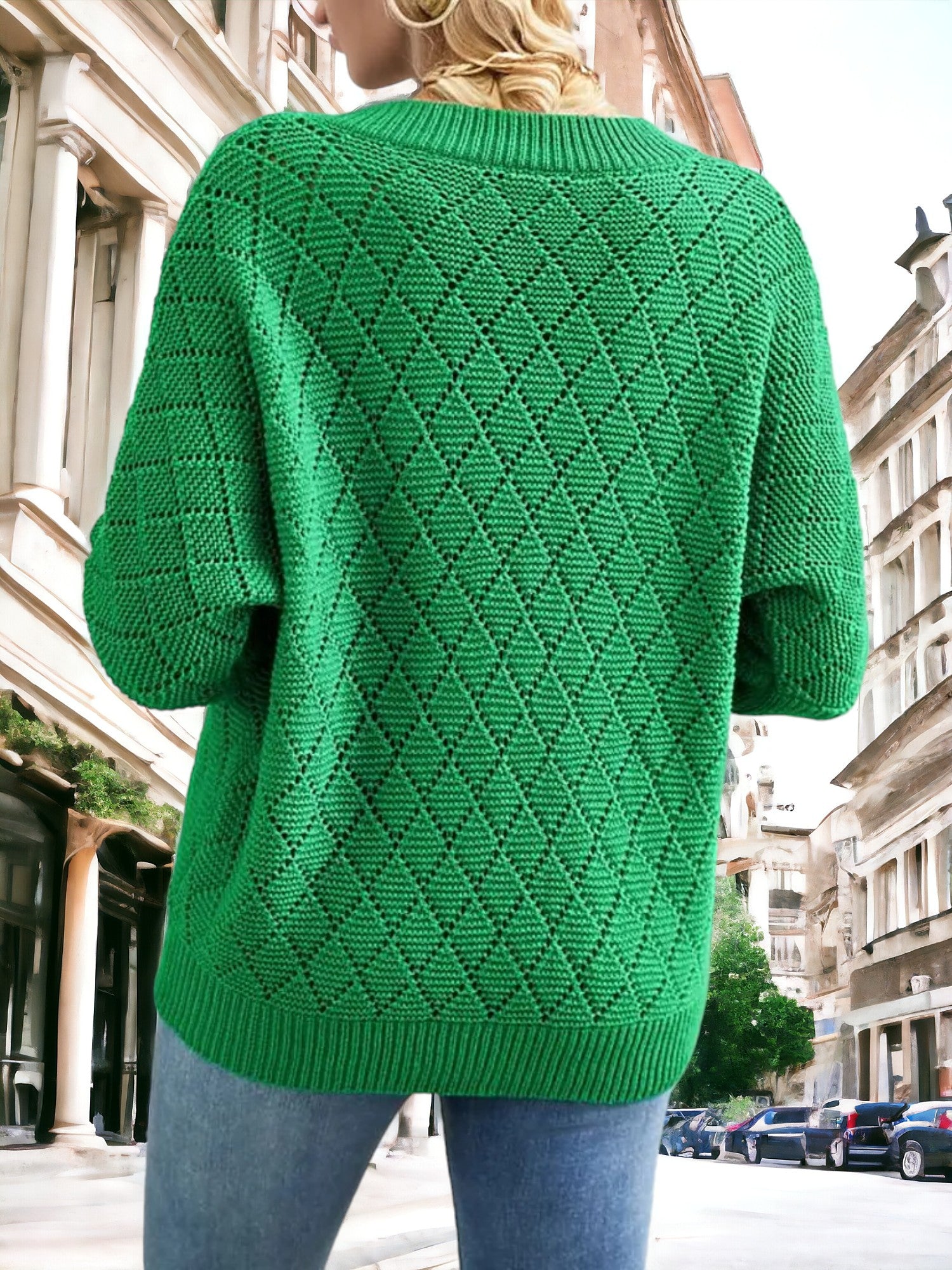 Anna-Kaci Women's Green V-Neck Diamond Knit Sweater with Relaxed Fit