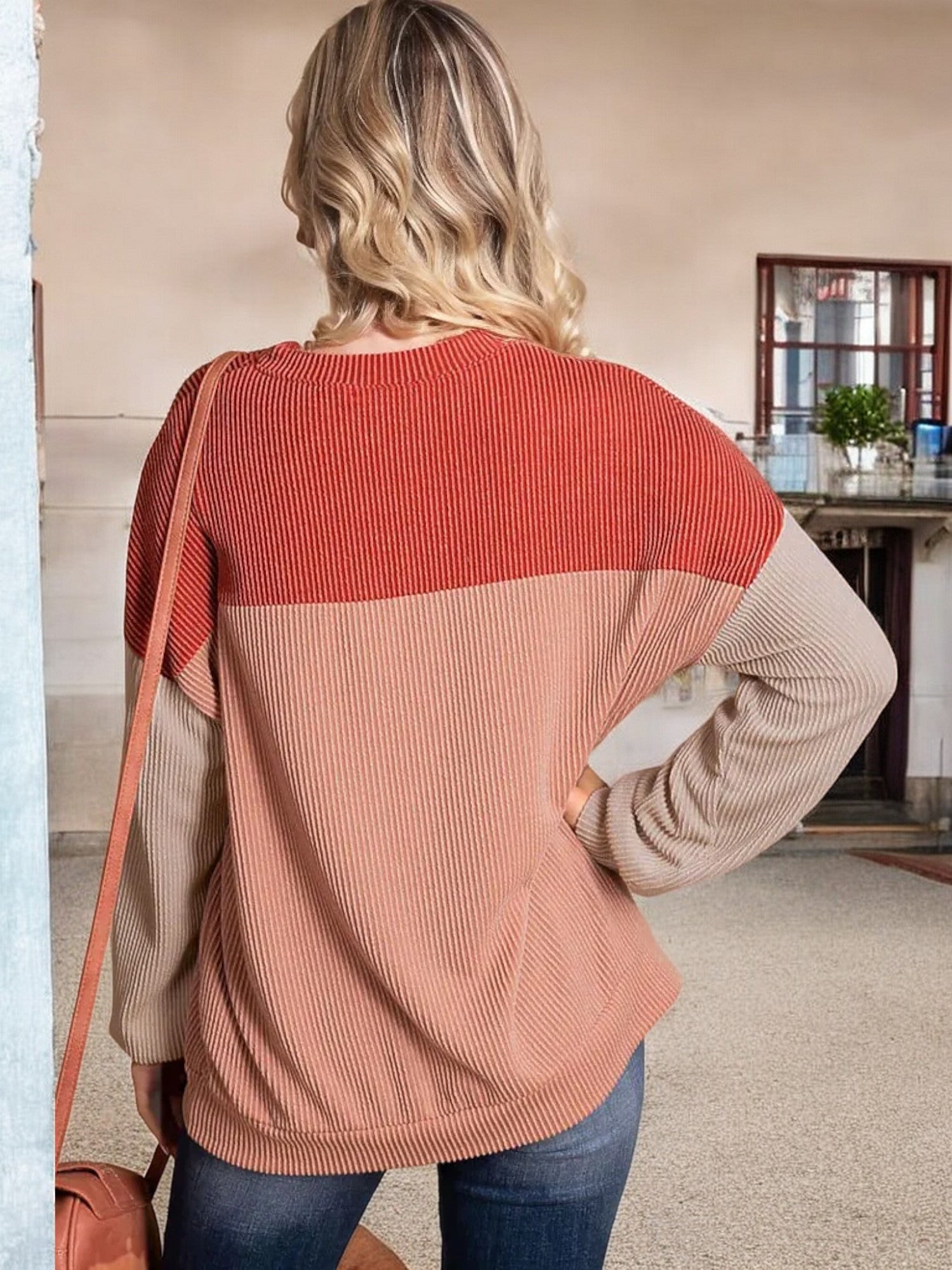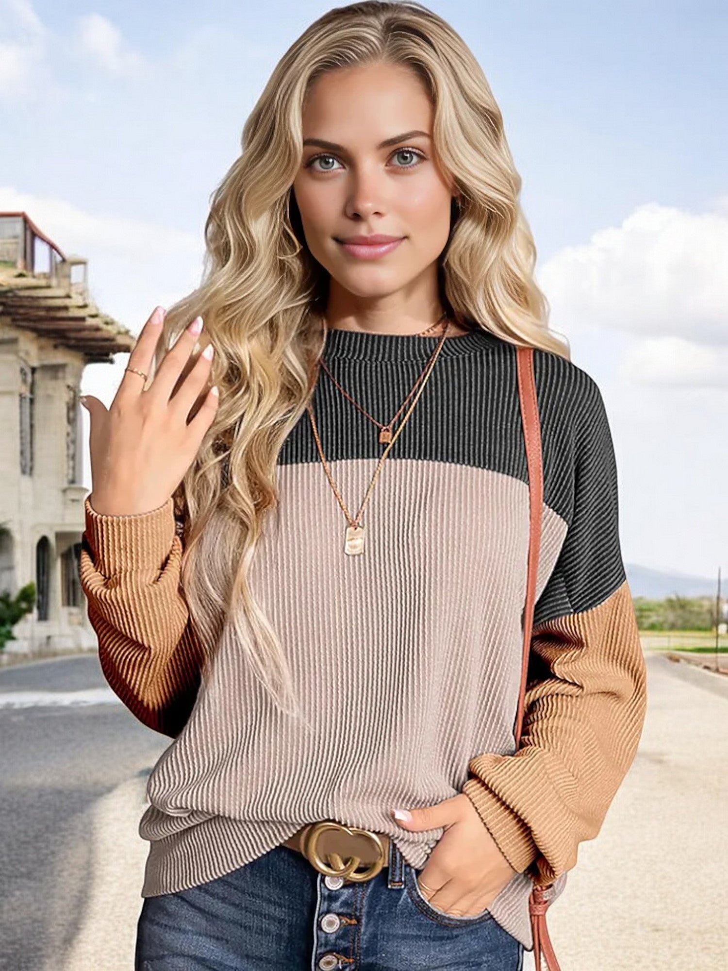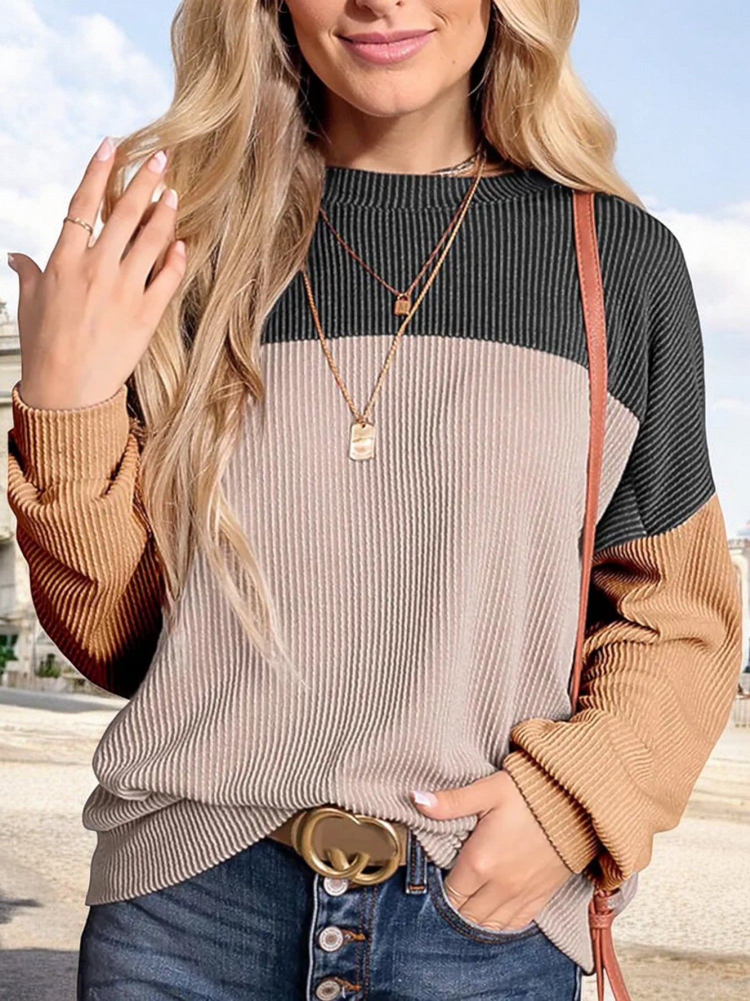 Anna-Kaci Women's Color Block Ribbed Knit Sweater with Long Sleeves and Crew Neckline