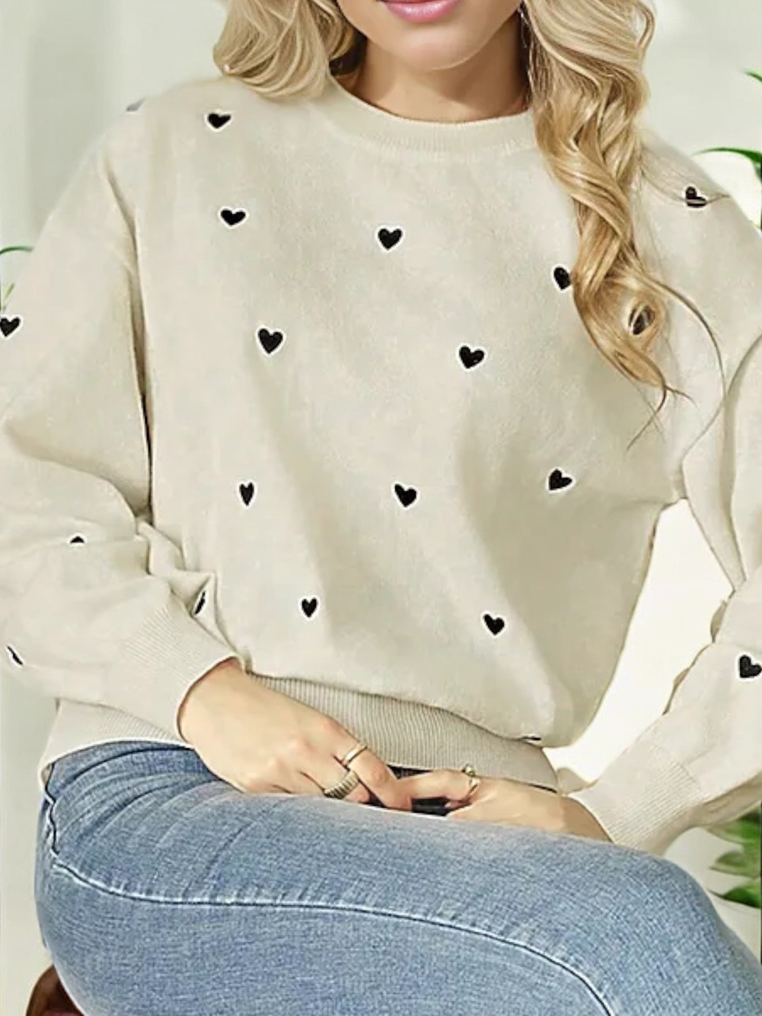 Anna-Kaci Women's Heart Embroidered Knit Sweater with Long Sleeves and Crew Neckline