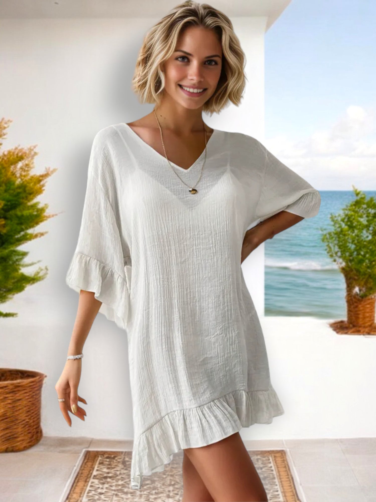 The Anna-Kaci Women's V-Neck Ruffle Hem Loose Fit Tunic Dress is a delightful addition to your wardrobe, offering a blend of casual elegance and comfort. Featuring a flattering V-neckline and charming ruffle hem, this tunic dress exudes a relaxed yet chic vibe, perfect for any casual occasion. Made from lightweight, breathable fabric, it ensures all-day comfort while maintaining a stylish look. The loose fit design allows for easy movement, making it an ideal choice for warm-weather outings or lounging at home. Pair it with sandals or sneakers for a laid-back, fashionable ensemble that will keep you looking effortlessly beautiful.