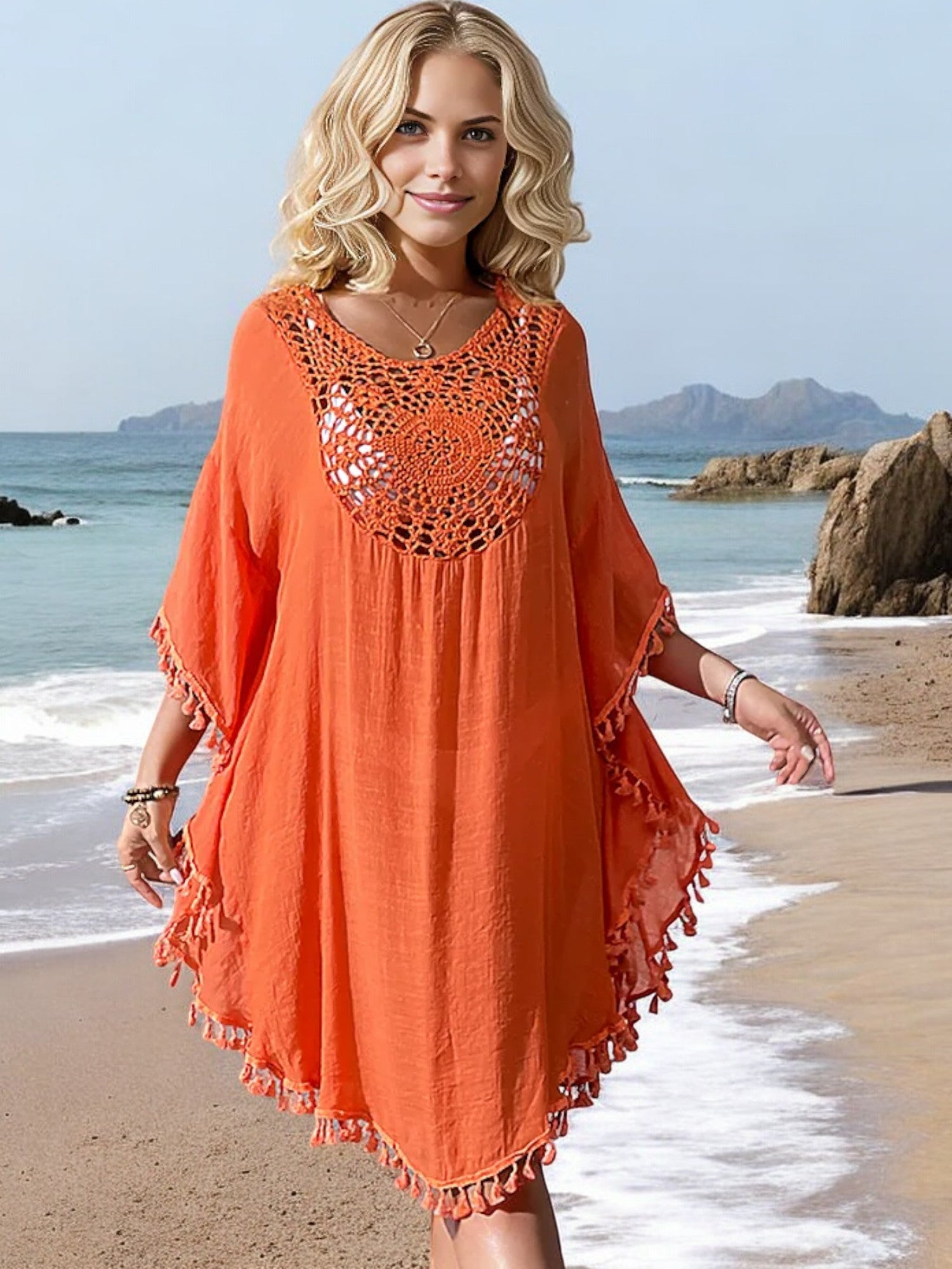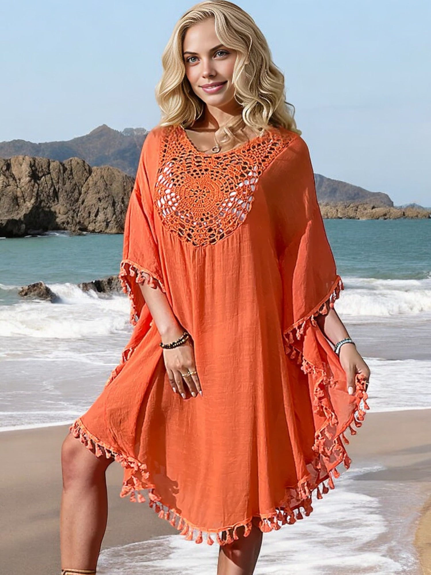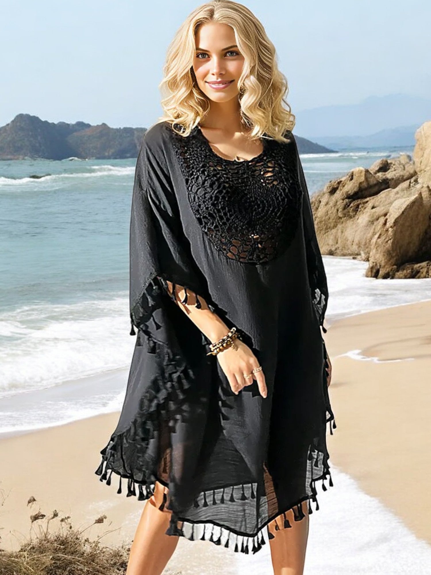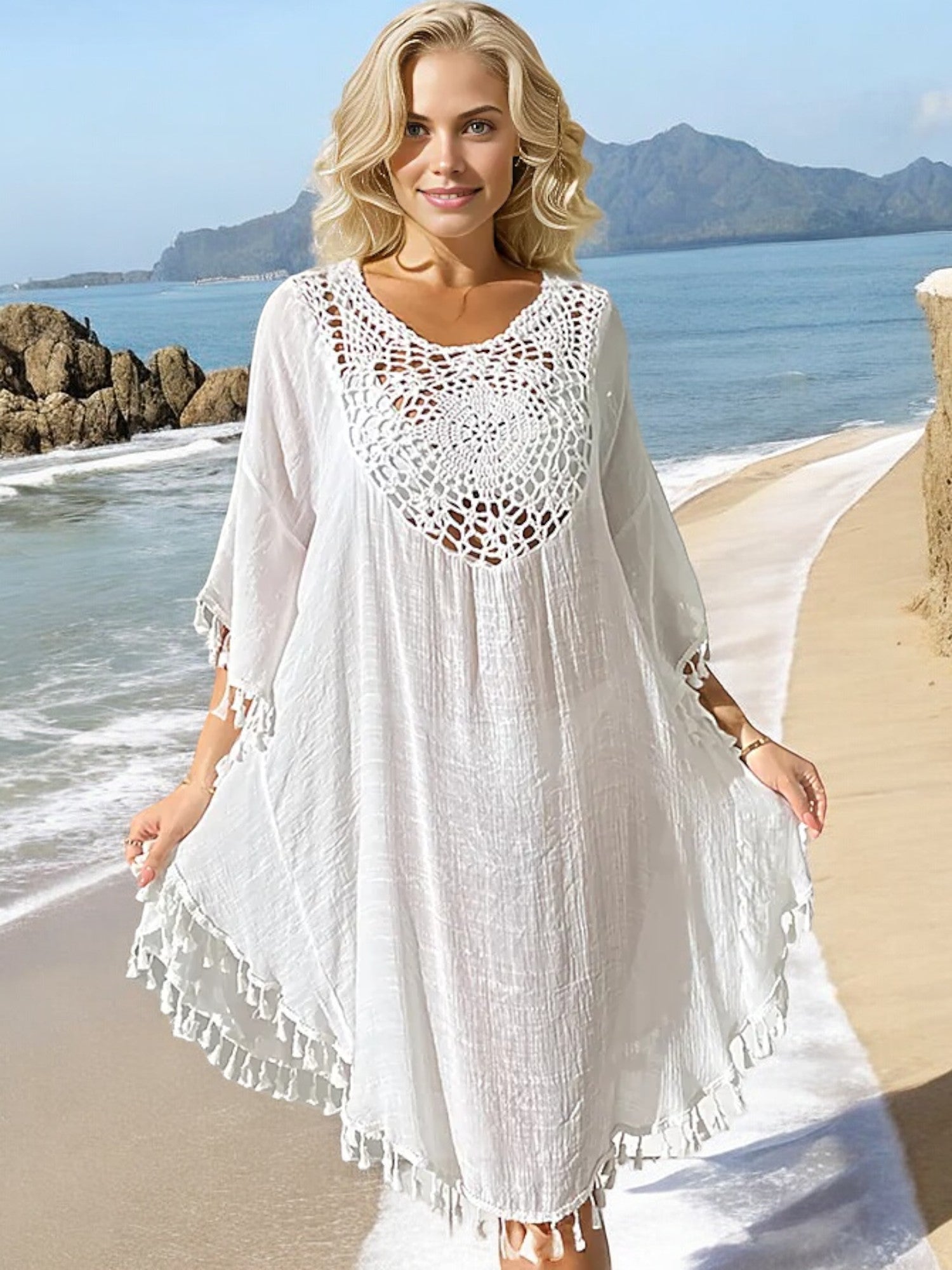 Anna-Kaci Women's Beach Cover-Up with Crochet Detailing and Tassel Trim