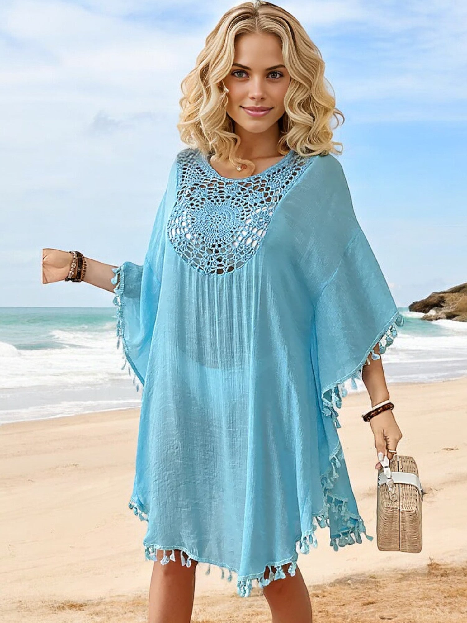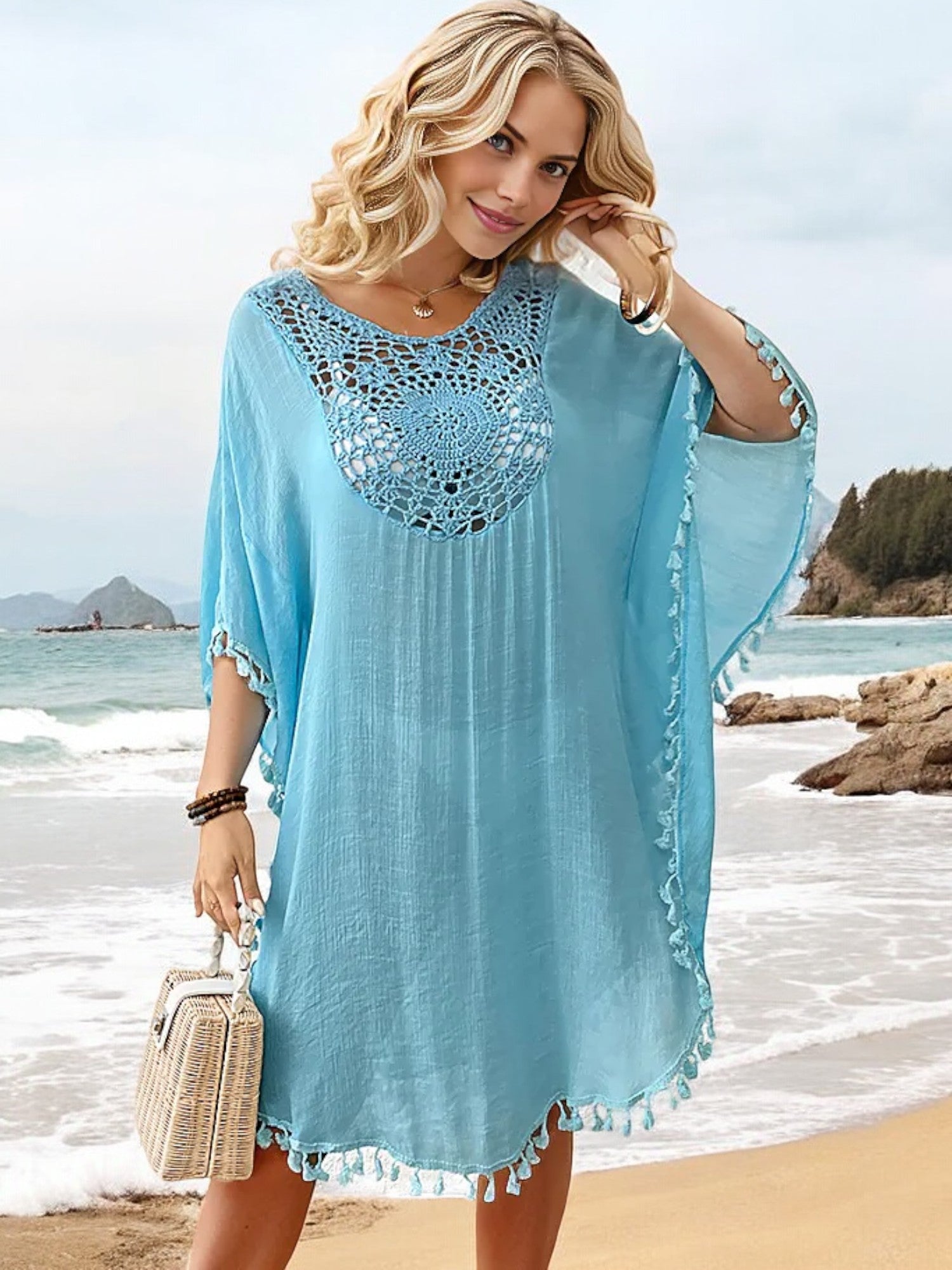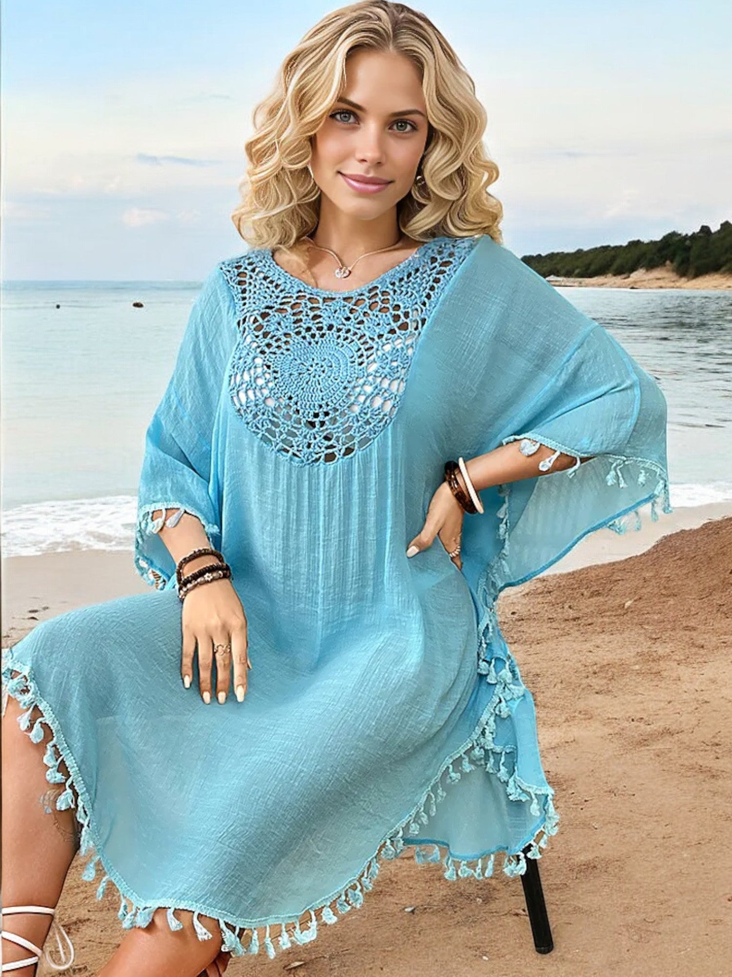 The Anna-Kaci Women's Beach Cover-Up is a must-have for your summer wardrobe. Featuring intricate crochet detailing at the neckline and a stylish tassel trim, this cover-up offers a blend of elegance and bohemian charm. The lightweight, flowy fabric drapes beautifully, providing coverage while keeping you cool on hot days. Perfect for slipping on over your swimsuit, this versatile piece transitions effortlessly from the beach to casual seaside dining. The loose fit ensures comfort and ease, making it an essential addition to your vacation essentials.