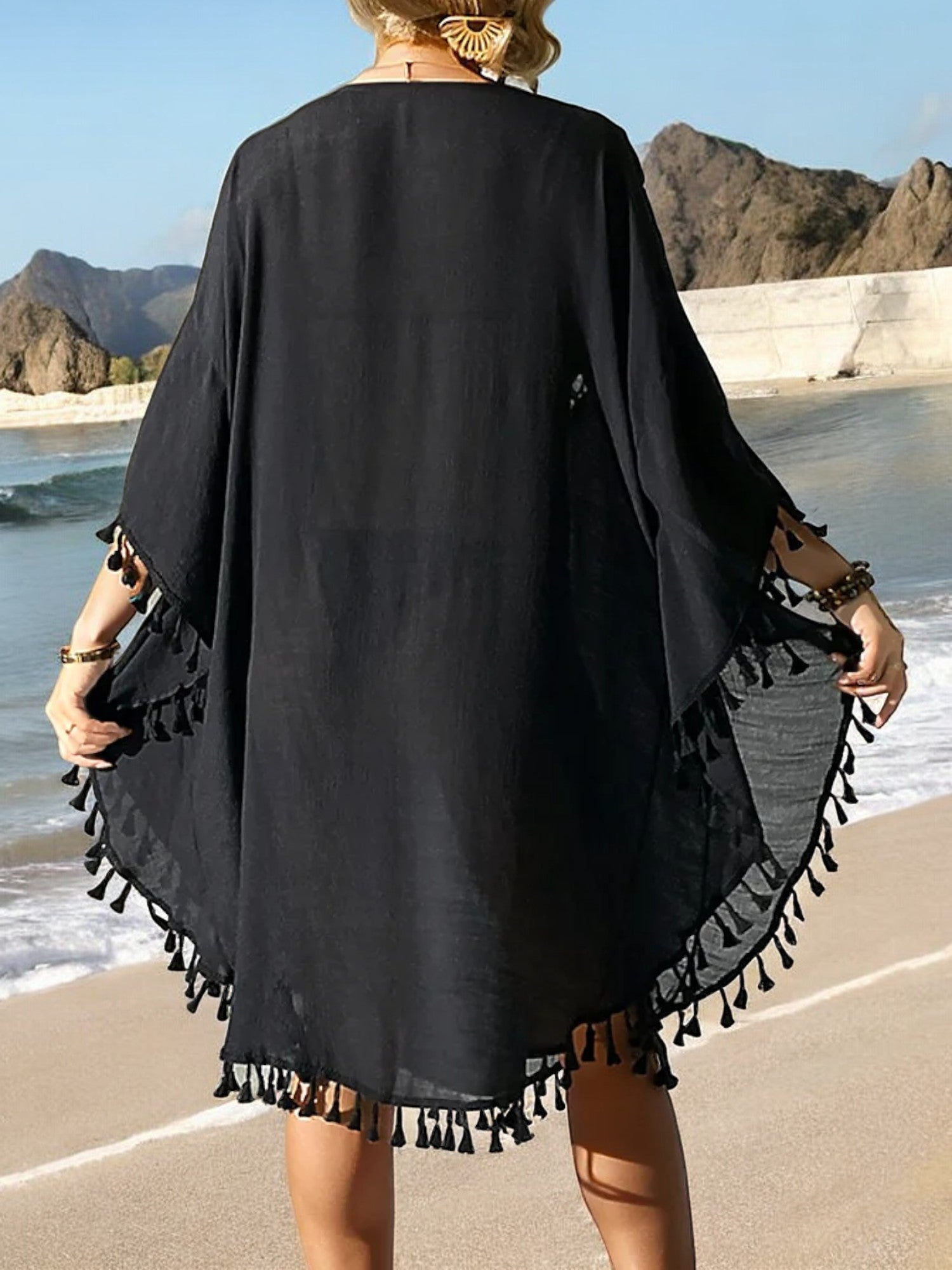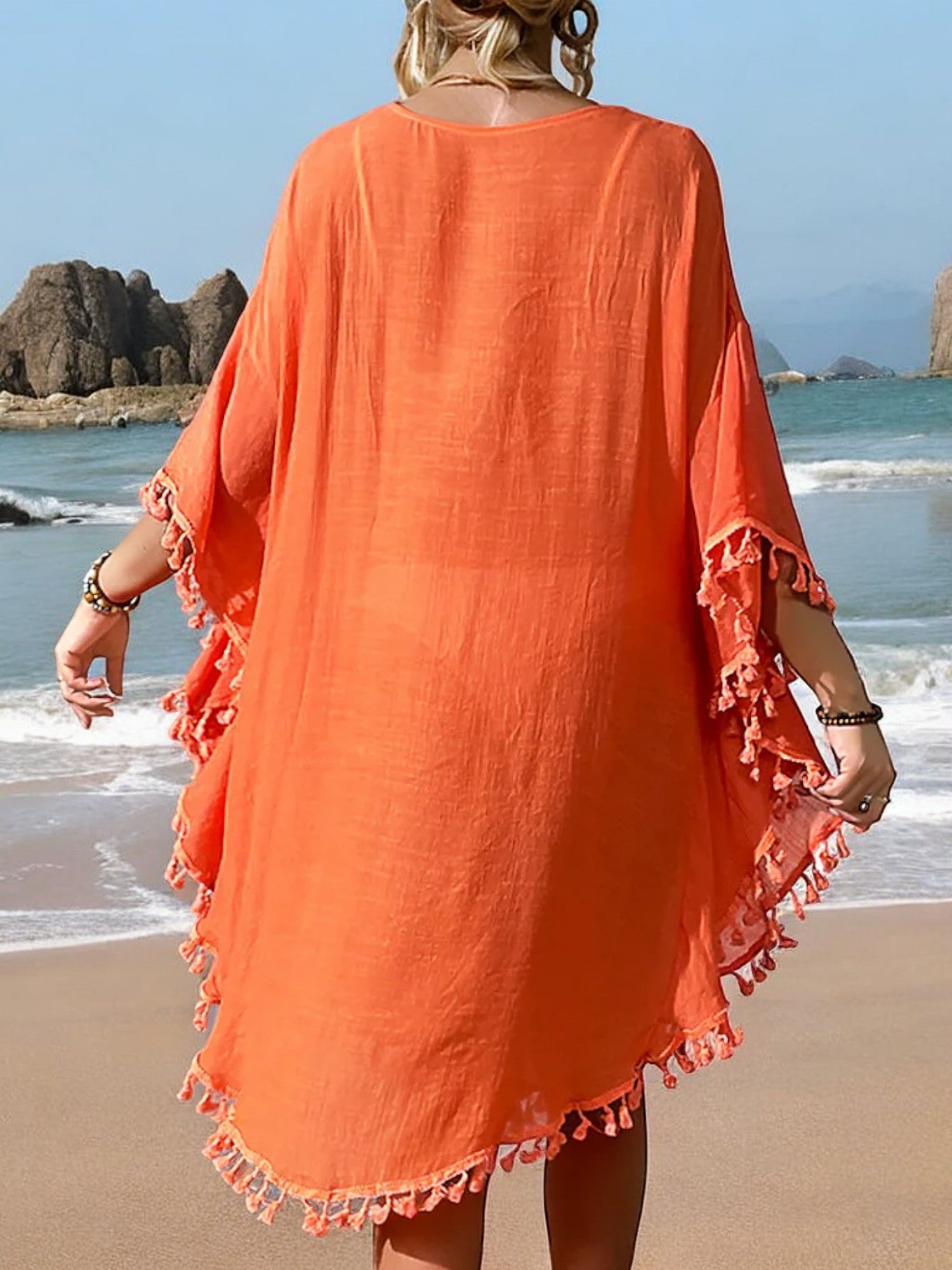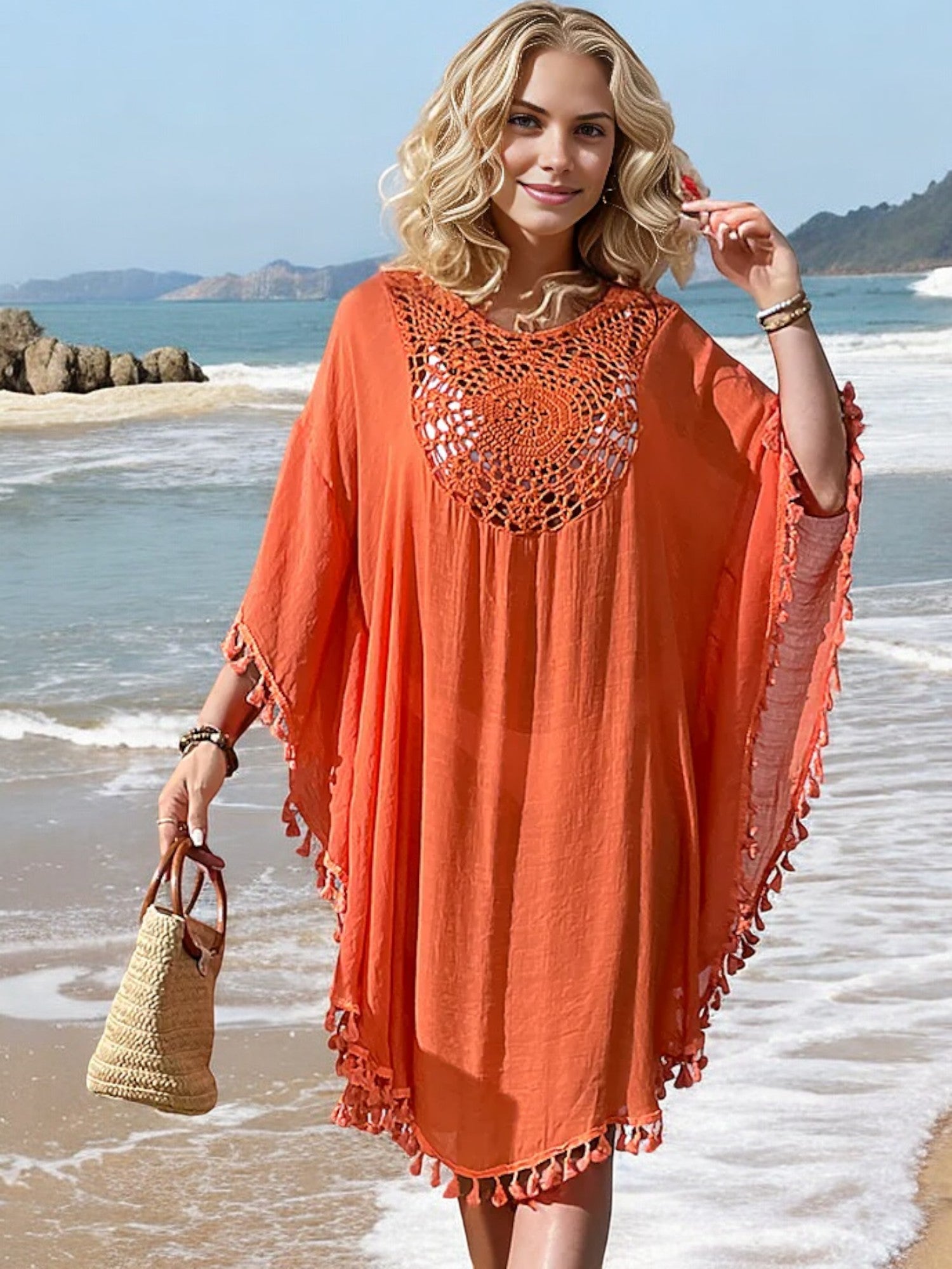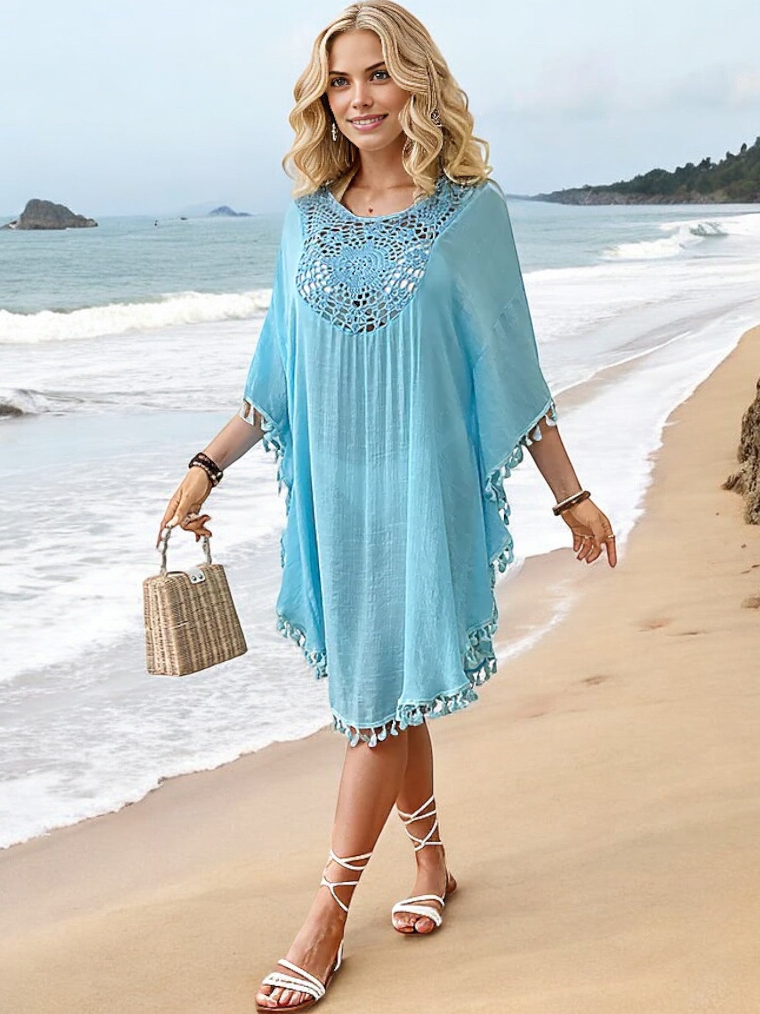 The Anna-Kaci Women's Beach Cover-Up is a must-have for your summer wardrobe. Featuring intricate crochet detailing at the neckline and a stylish tassel trim, this cover-up offers a blend of elegance and bohemian charm. The lightweight, flowy fabric drapes beautifully, providing coverage while keeping you cool on hot days. Perfect for slipping on over your swimsuit, this versatile piece transitions effortlessly from the beach to casual seaside dining. The loose fit ensures comfort and ease, making it an essential addition to your vacation essentials.
