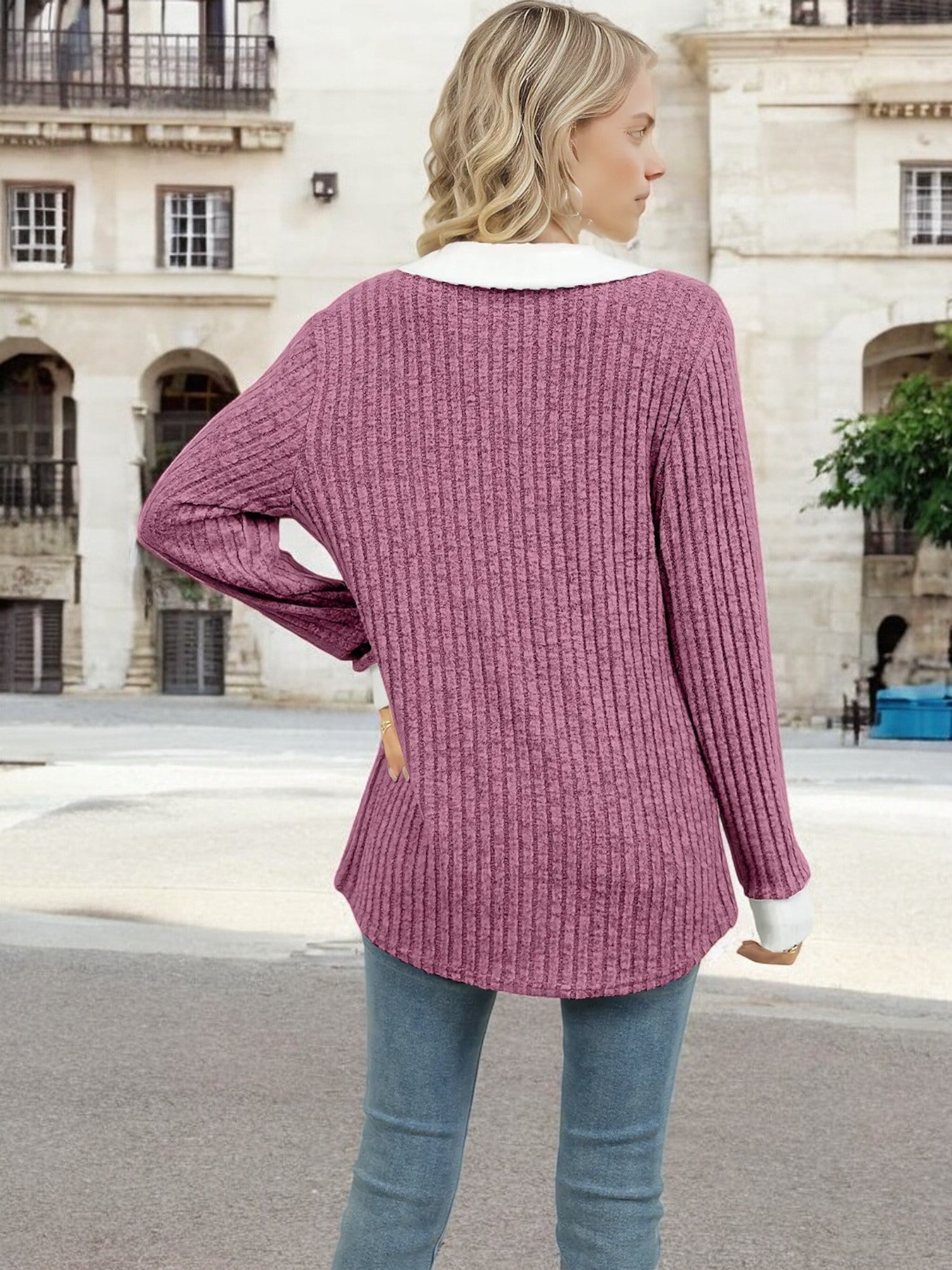Anna-Kaci Women's Ribbed V-Neck Sweater with Contrast Collar and Cuffs