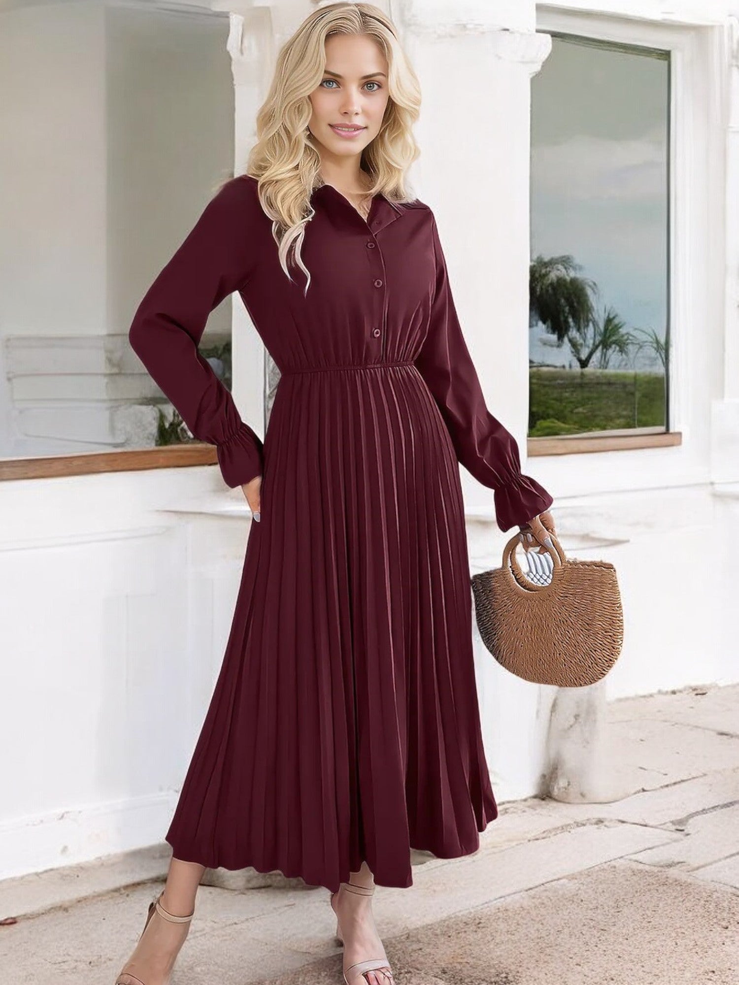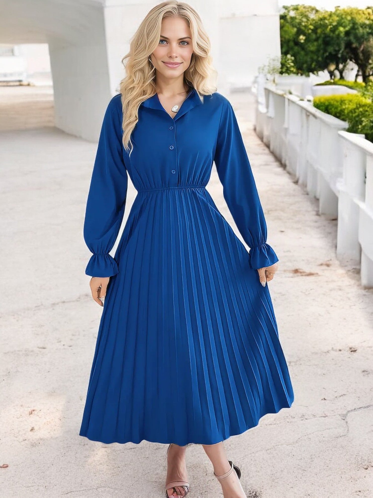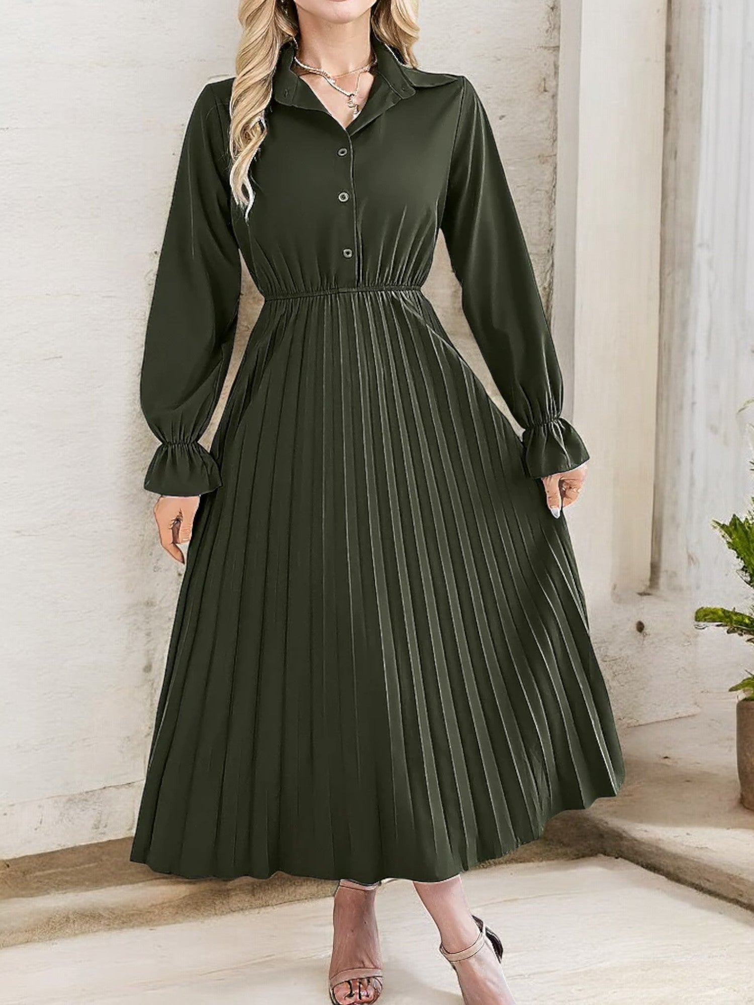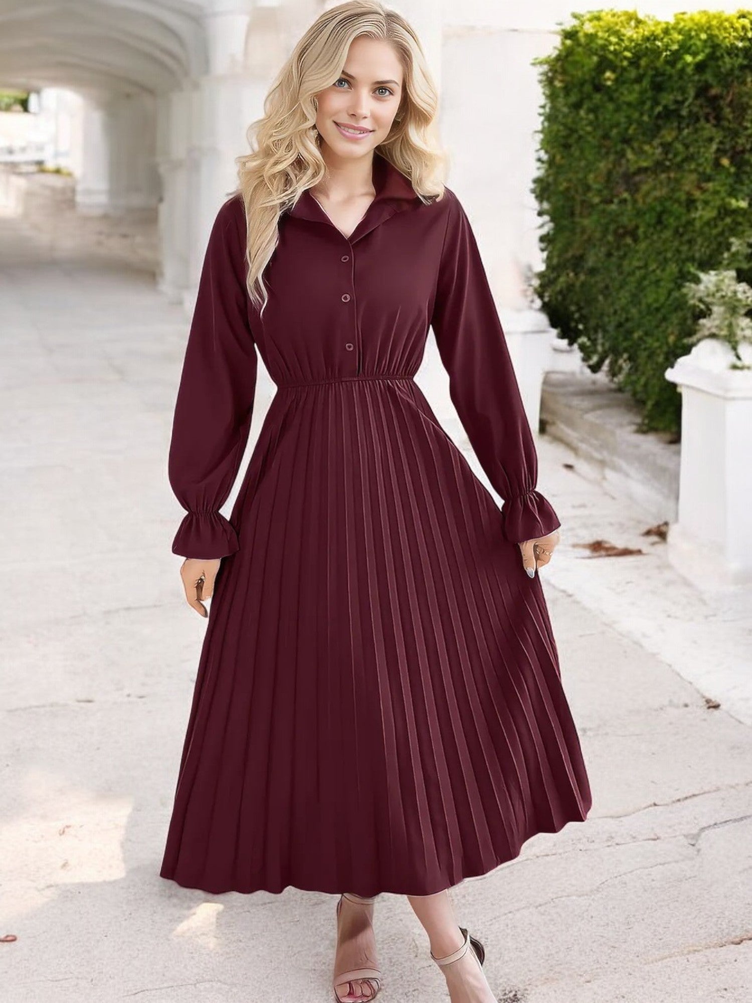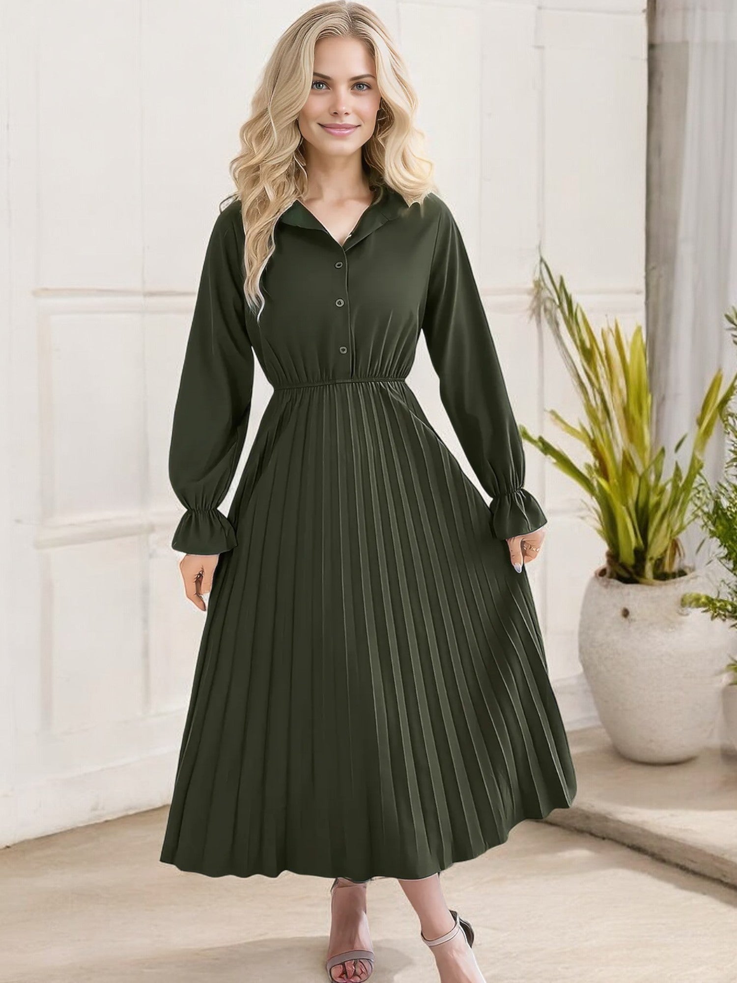 Anna-Kaci Women's Long Sleeve Pleated Midi Dress with Button-Down Front and Smocked Waist