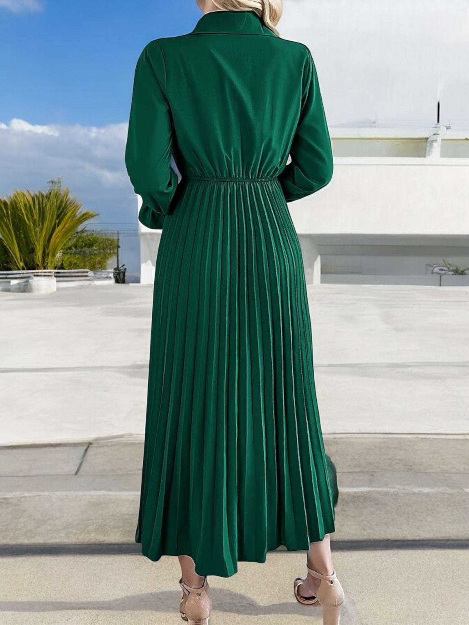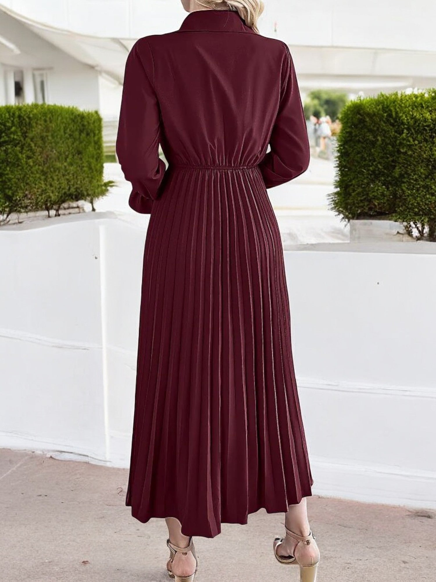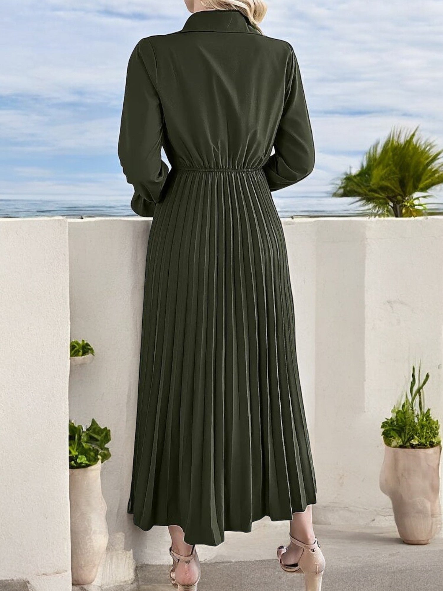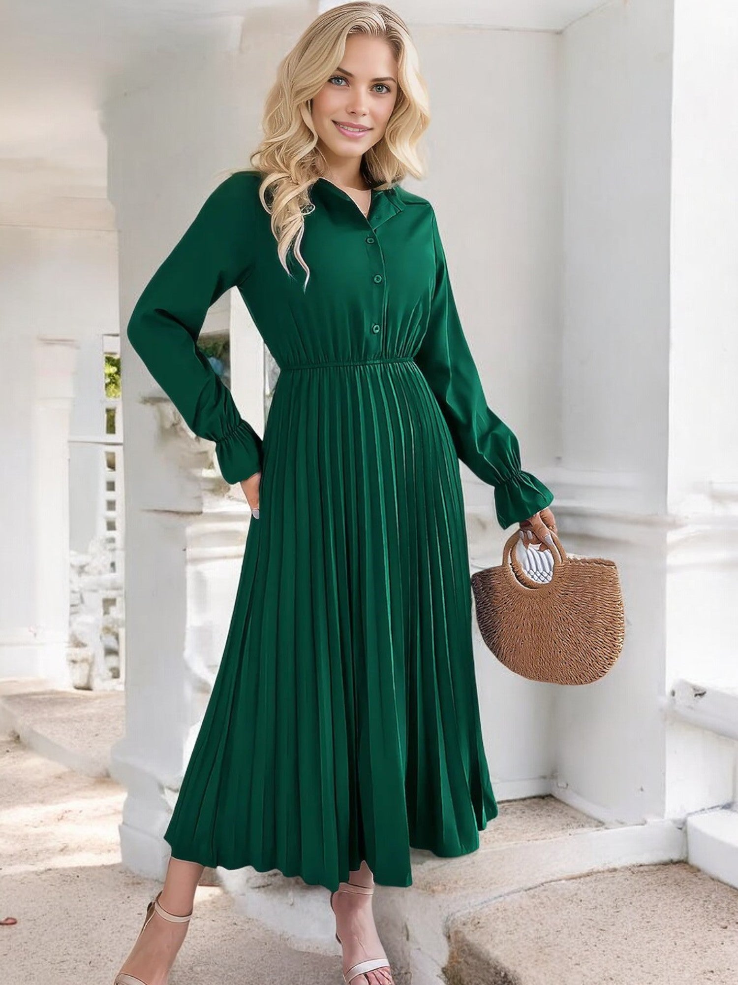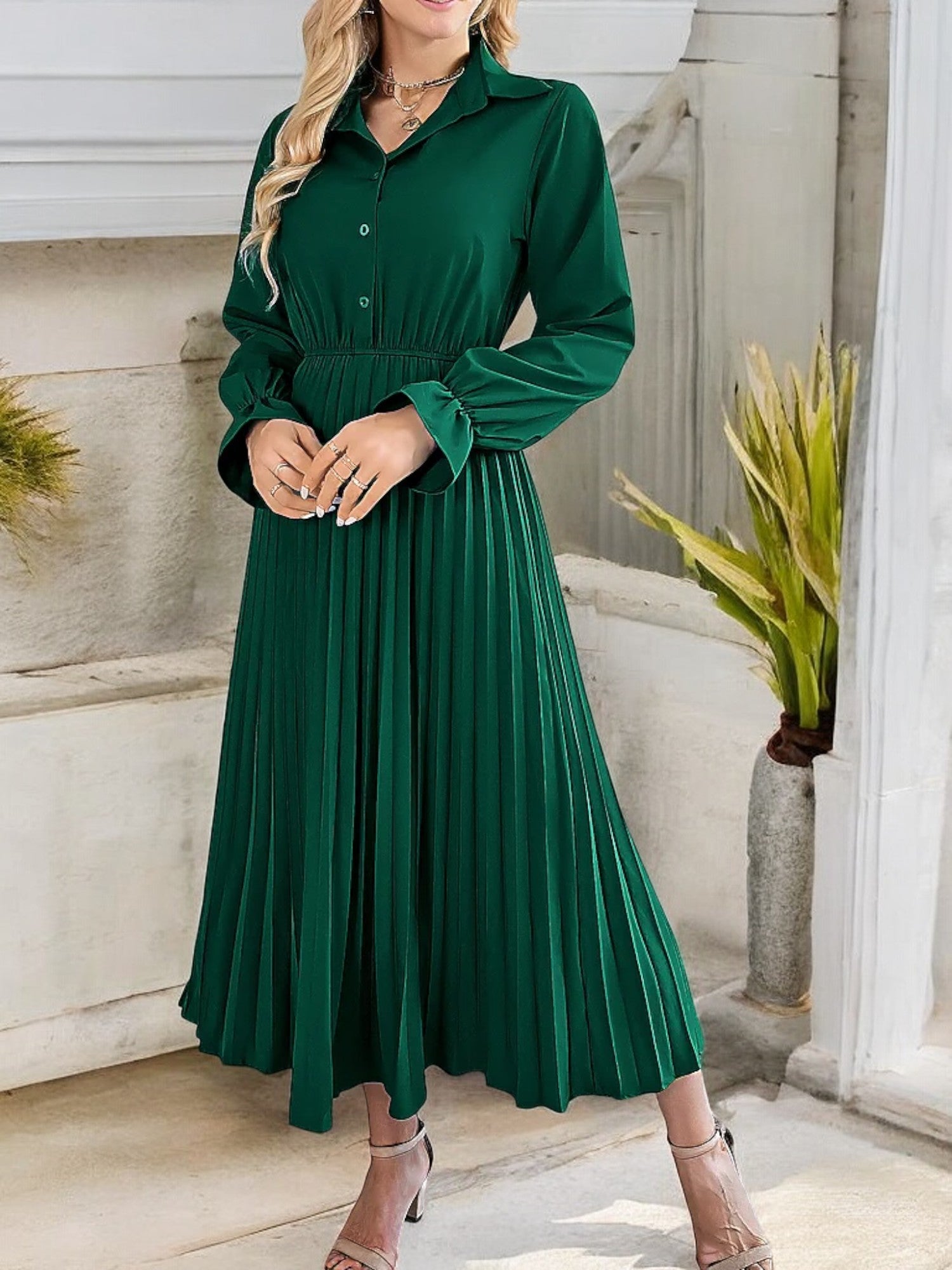 Anna-Kaci Women's Long Sleeve Pleated Midi Dress with Button-Down Front and Smocked Waist