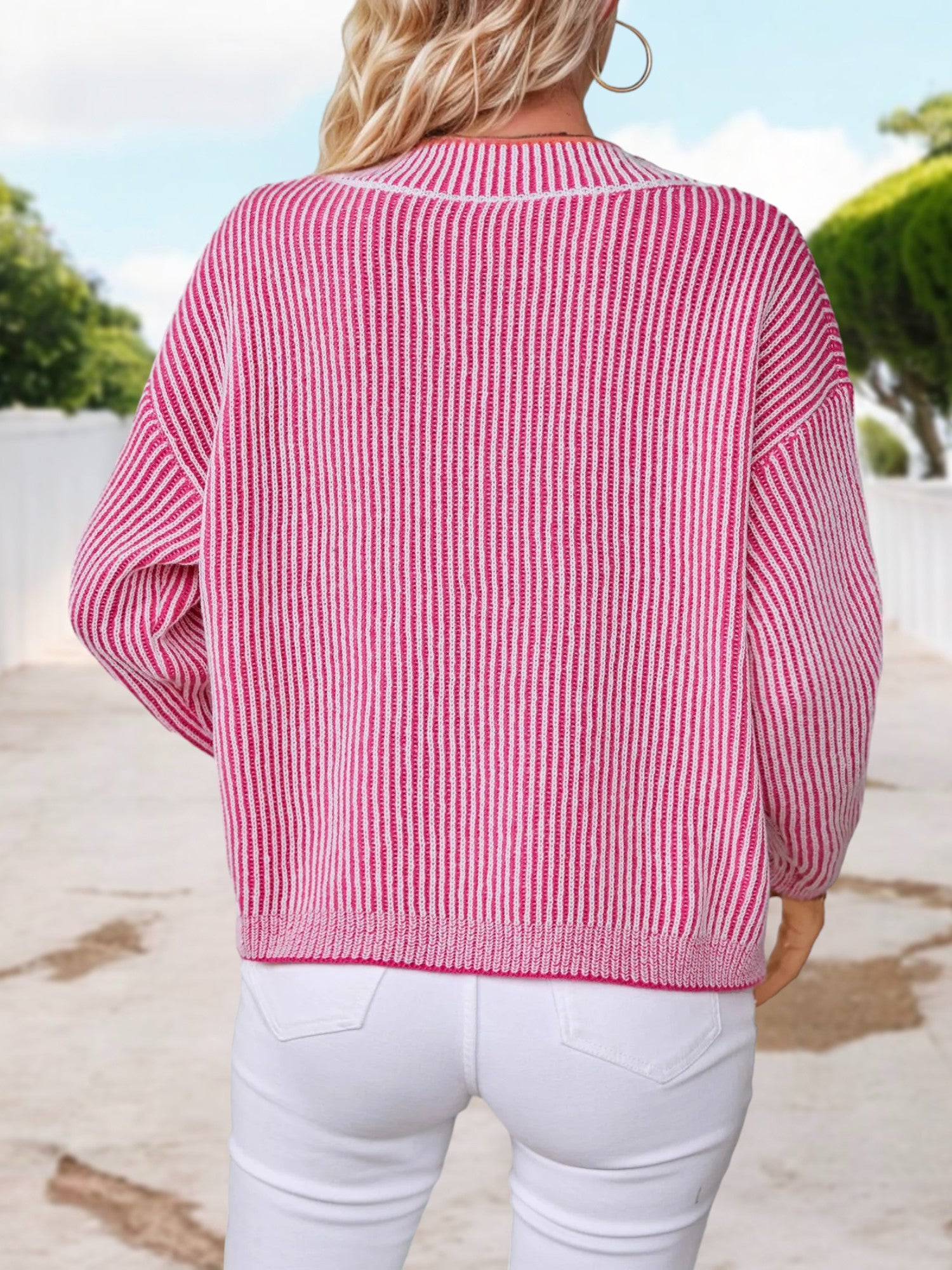 Anna-Kaci Women's V-Neck Striped Knit Sweater with Long Sleeves