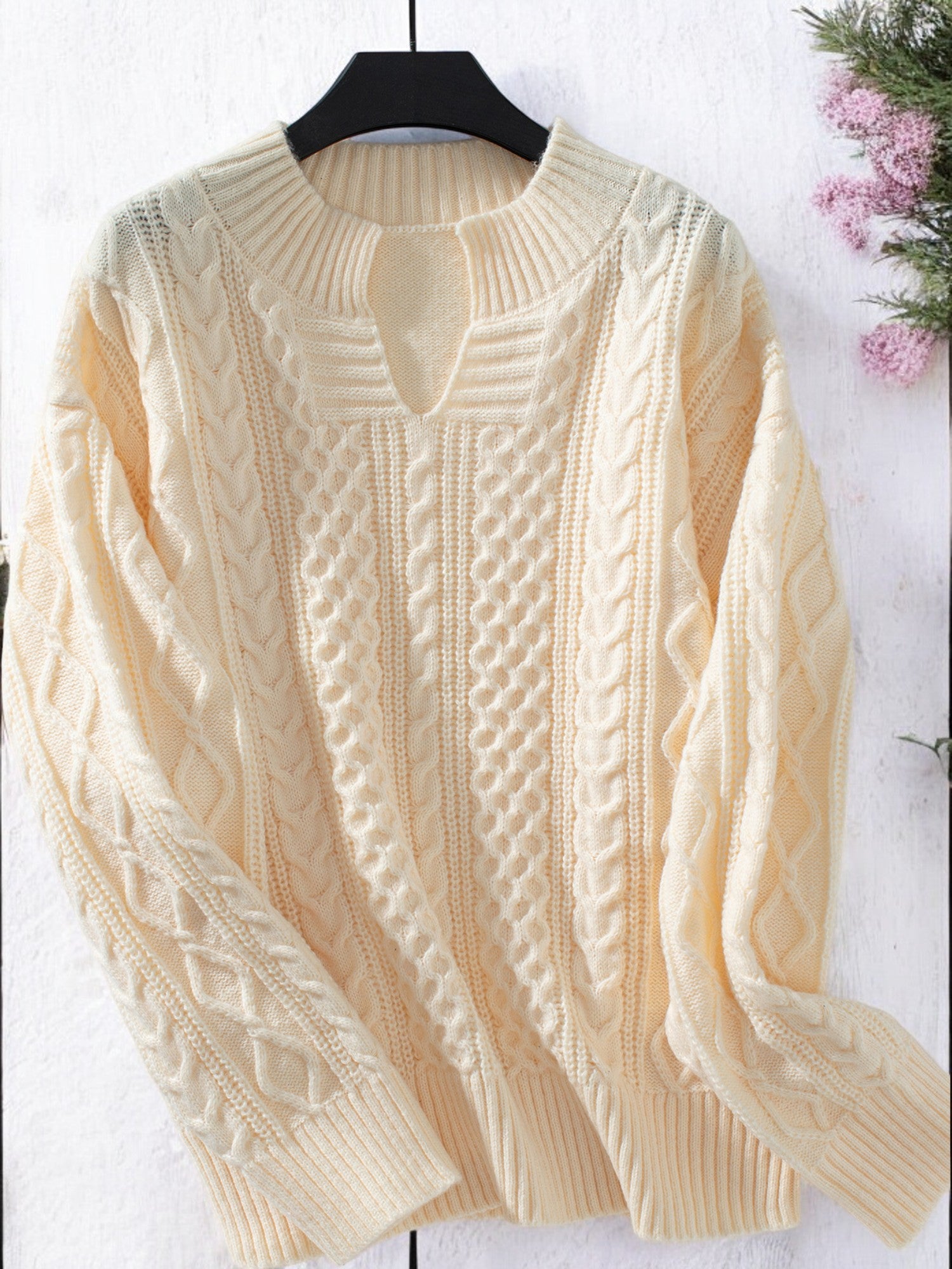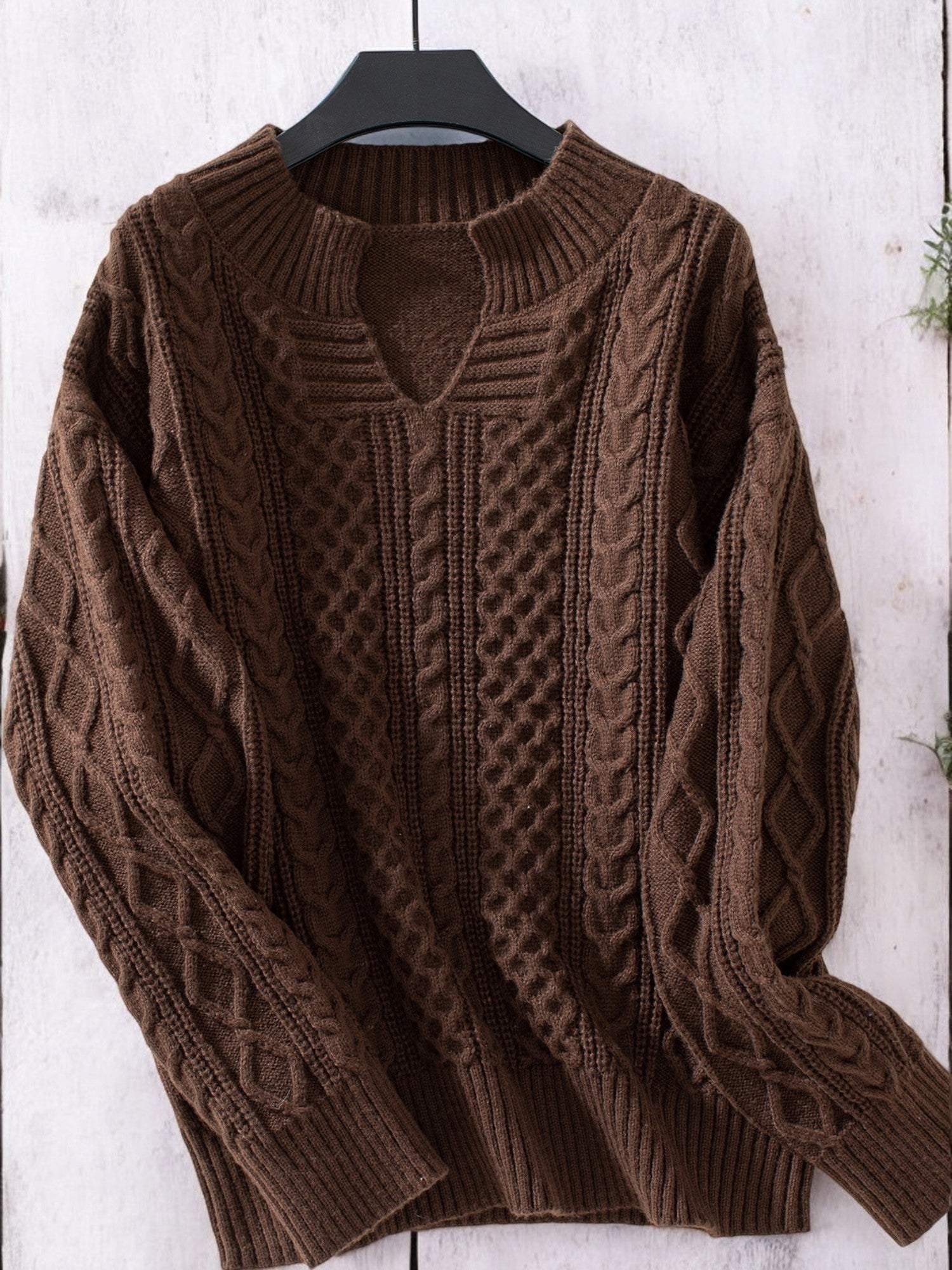 The Anna-Kaci Women's Cable Knit Sweater with Ribbed Cuffs and V-Notch Neckline is a cozy yet stylish addition to your cold-weather wardrobe. Crafted from a soft, warm knit, this sweater features intricate cable knit patterns that add texture and depth, while the ribbed cuffs provide a snug and comfortable fit. The unique V-notch neckline offers a modern twist to this classic design, making it a versatile piece that can be dressed up or down. Perfect for layering over a turtleneck or wearing alone with jeans or leggings, this sweater effortlessly combines comfort and fashion for any casual or semi-formal occasion.